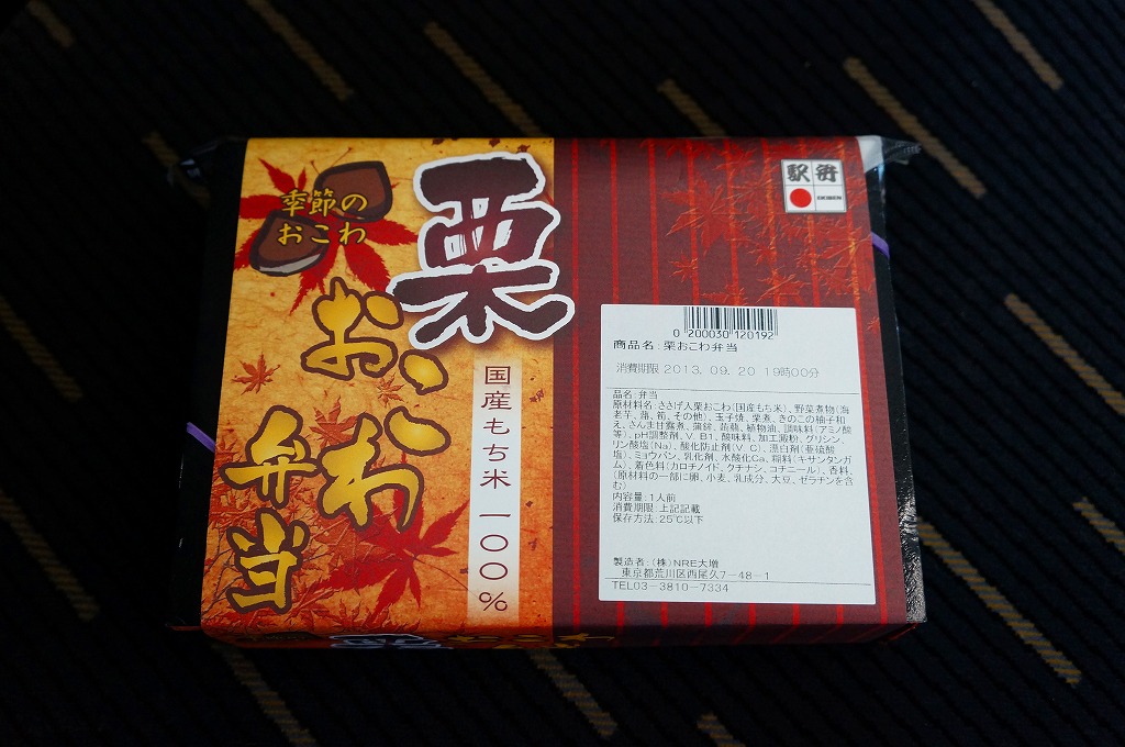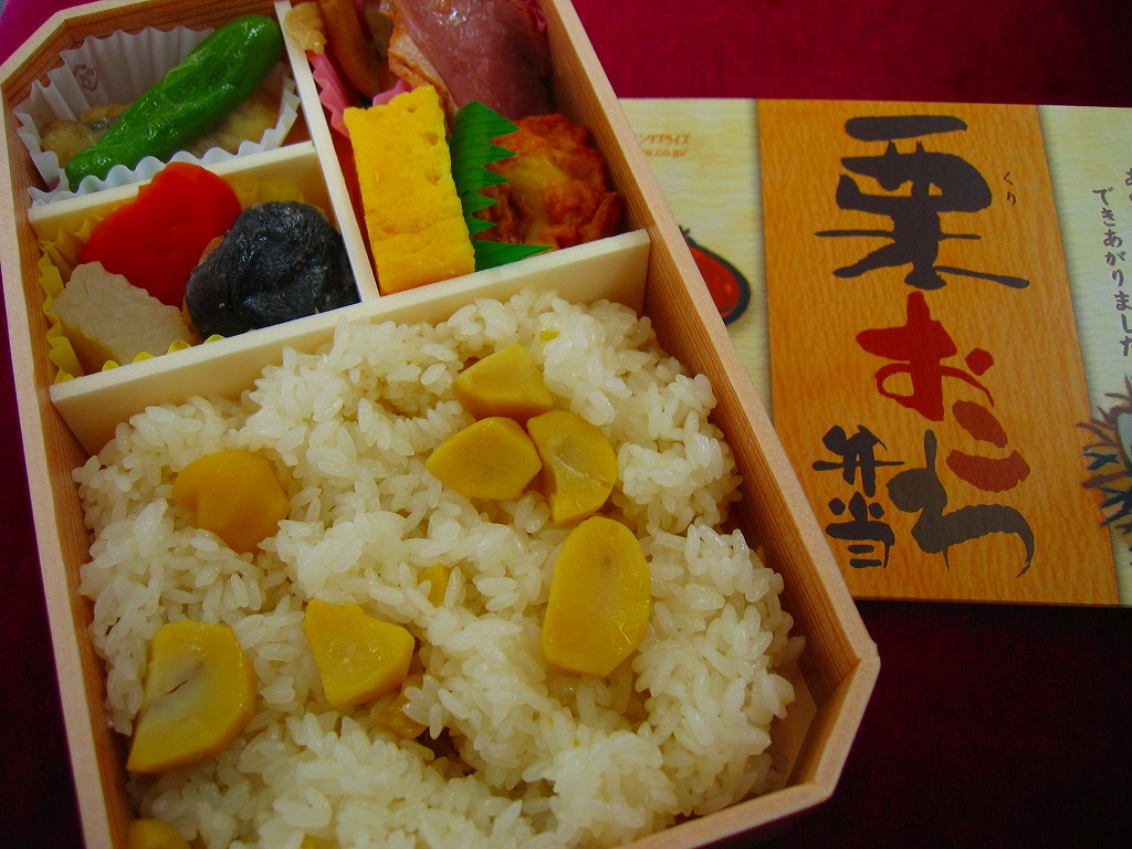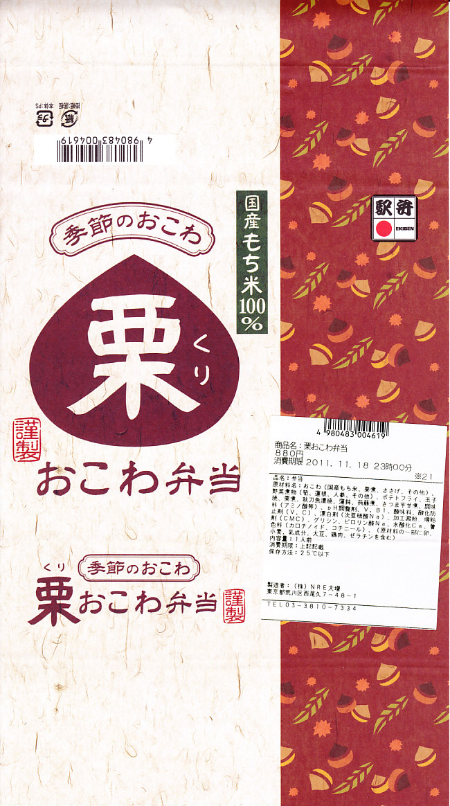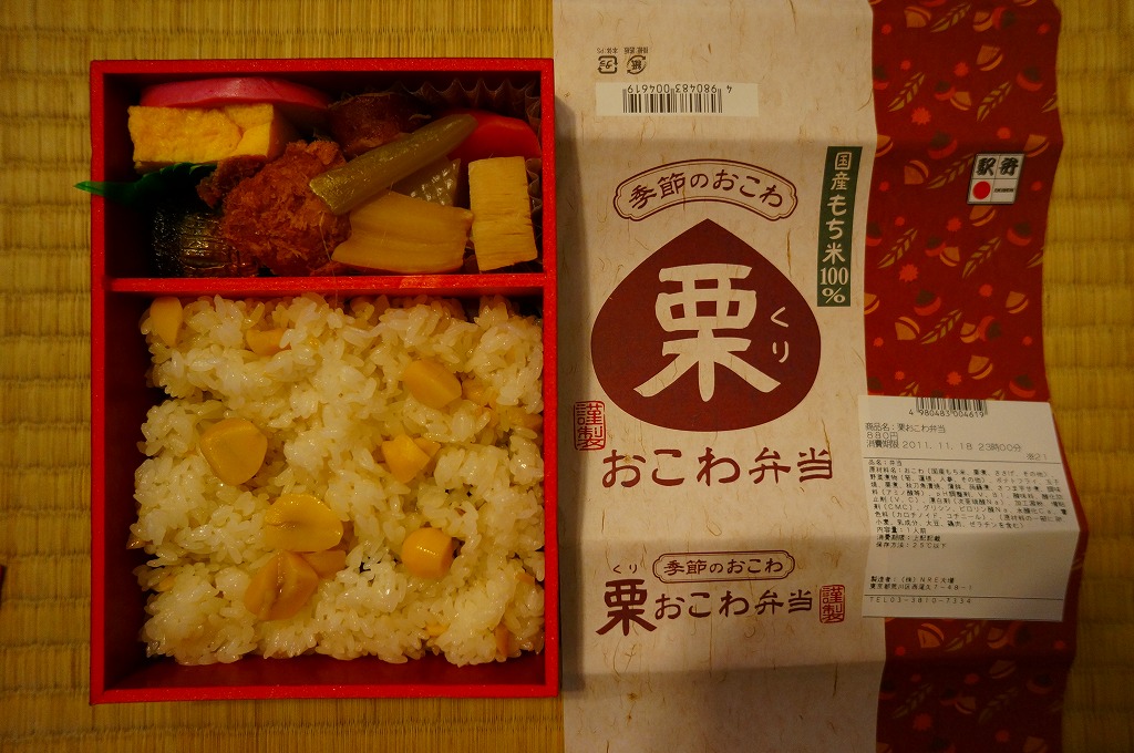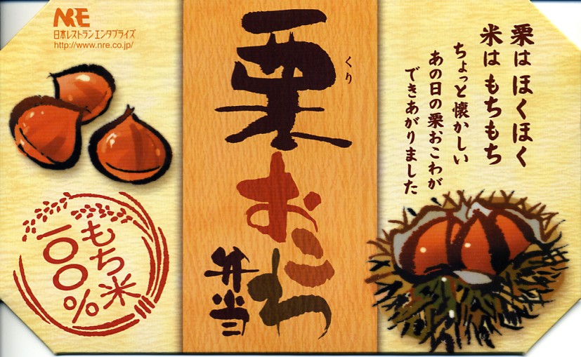 NREの首都圏エリアの、季節のおこわ弁当の2011年の秋バージョン。2010年の「たけのこおこわ弁当」と同じく、下記の2008年版と比べて大きくリニューアル。黒塗りの赤い容器を使用、栗という文字が大きく目立つ栗色の掛紙を巻く。中身はクリの破片がたっぷり入った栗おこわに、タケノコやレンコンやサツマイモなどの煮物、ポテトフライ、玉子焼、かまぼこ、サンマ漬焼など。