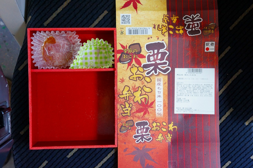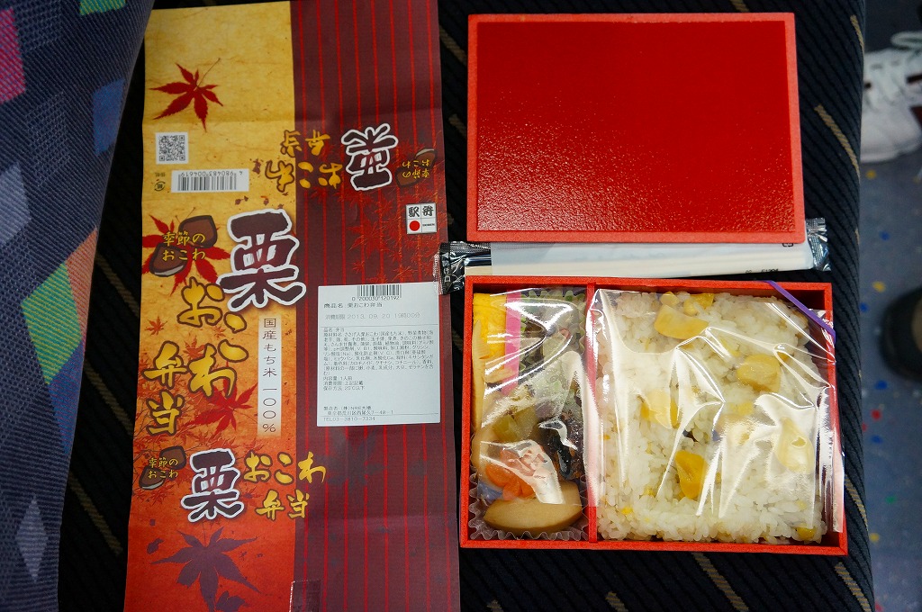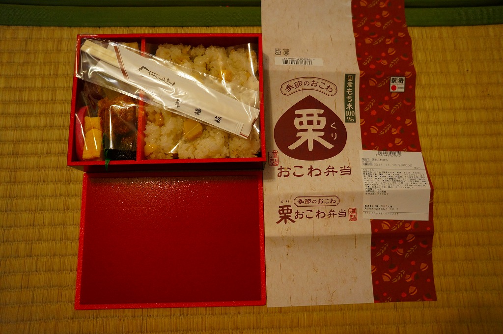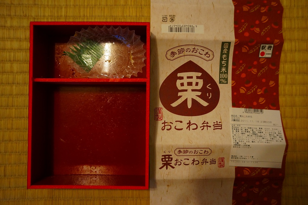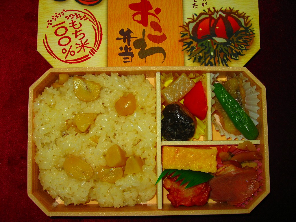 NREの首都圏エリアの、季節のおこわ弁当の2011年の秋バージョン。2010年の「たけのこおこわ弁当」と同じく、下記の2008年版と比べて大きくリニューアル。黒塗りの赤い容器を使用、栗という文字が大きく目立つ栗色の掛紙を巻く。中身はクリの破片がたっぷり入った栗おこわに、タケノコやレンコンやサツマイモなどの煮物、ポテトフライ、玉子焼、かまぼこ、サンマ漬焼など。