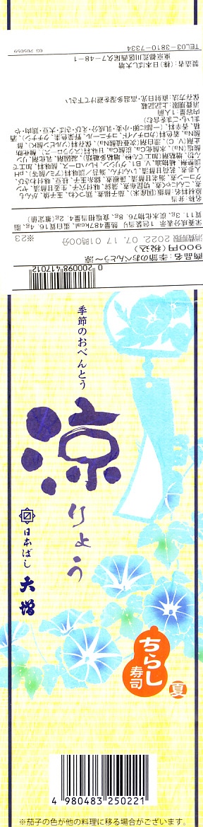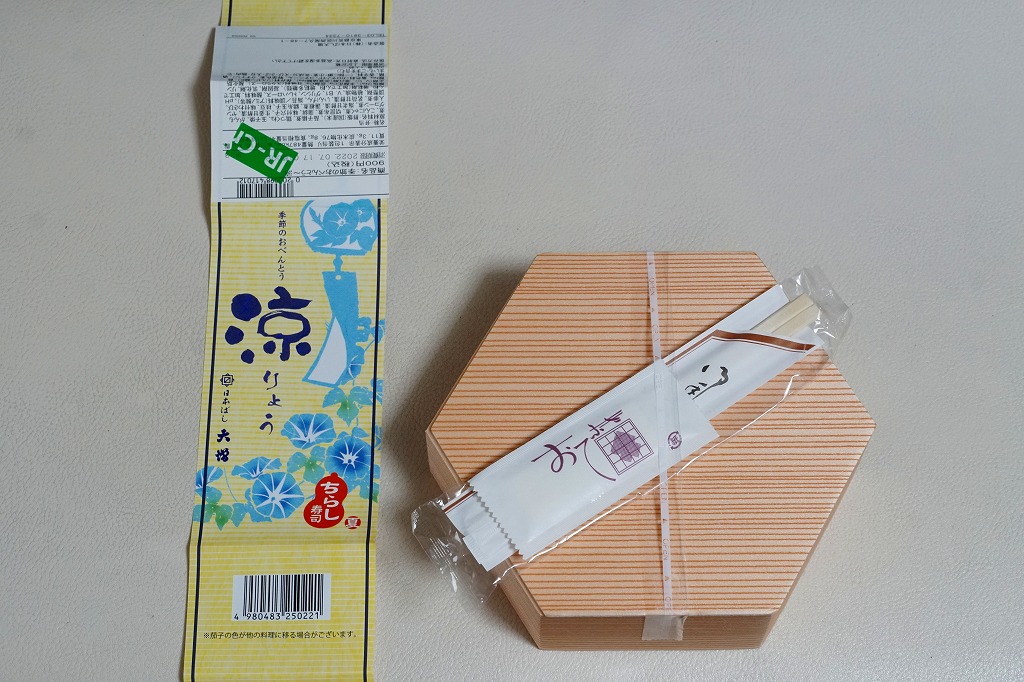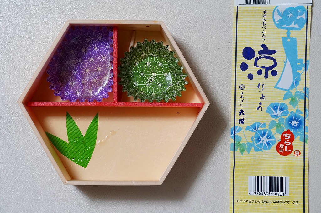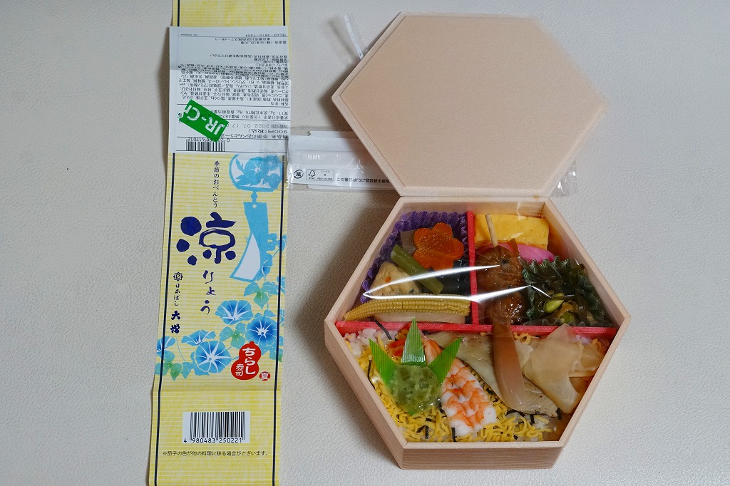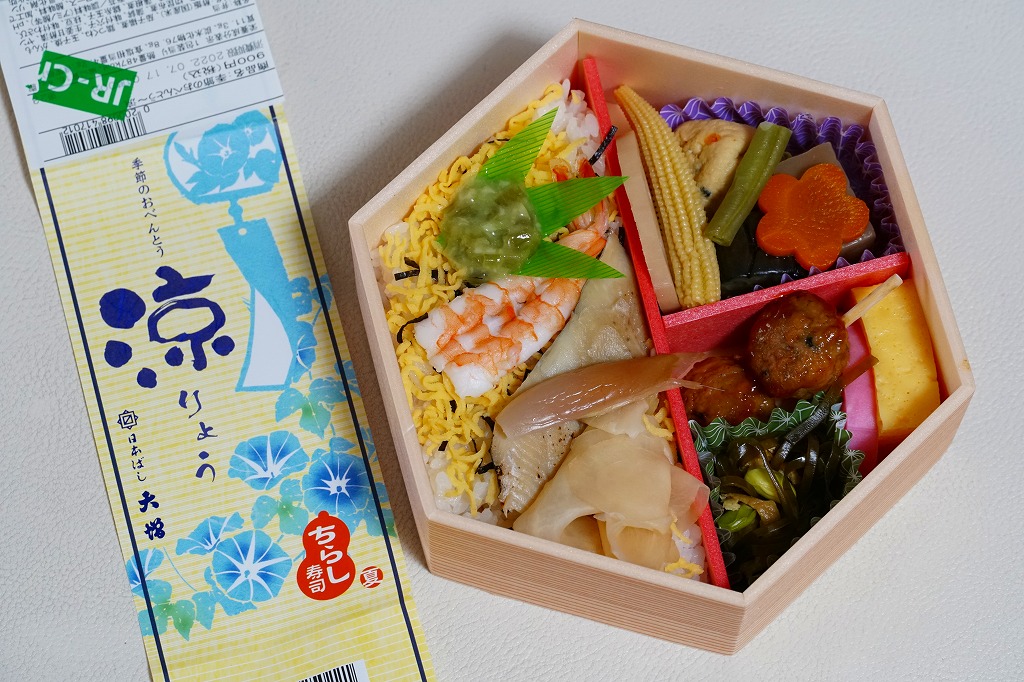 2021(令和3)年5月の発売か。20年以上続いた季節の駅弁「あさりおこわ弁当」に代わり、5月から8月まで東京で売られる、駅やデパ地下のお弁当。正六角形の容器を3つに仕切り、半分で酢飯をアナゴと生姜と海老と錦糸卵と刻み海苔と味付わさびで覆い、残る半分にナスやがんもどきやヤングコーンなどの煮物、残りにかまぼこ、玉子焼、鶏つくね、切昆布煮を詰める。掛紙で「ちらし寿司」を名乗るも、内容はまるで酢飯と小柄の幕の内弁当のよう。東京なのに千円以下で買える、有難い存在。