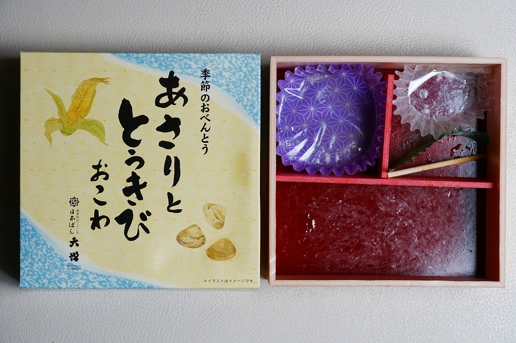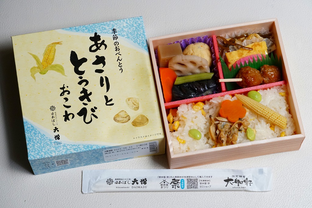 従前の夏季駅弁「季節のおべんとう涼(りょう)」を、2025年6月にリニューアル。正六角形の容器を正方形に変え、商品名を抽象から中身に変え、引き続き東京駅弁というよりは「日本ばし大増」ブランドの仕出し弁当かデパ地下弁当の姿をする。中身はトウモロコシを炊き込んだおこわに、あさりと生姜の味噌煮、花にんじん、枝豆、ヤングコーンを載せ、鶏つくね串、なすとこんにゃくとがんもとれんこんといんげんとにんじんの煮物、玉子焼、かまぼこ、切昆布煮を添えるもの。2000年頃から長らく売られたあさりおこわ弁当が、4年ぶりに帰ってきたと思ったら、これはとうきびおこわにあさりを載せたものだった。この物価高の中で、千円を切る価格が維持された。安心感と実用的な腹六分目は、下記の春版と同じ感じ。