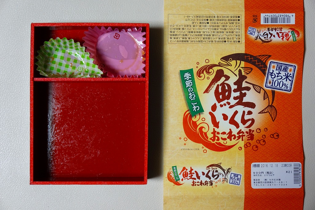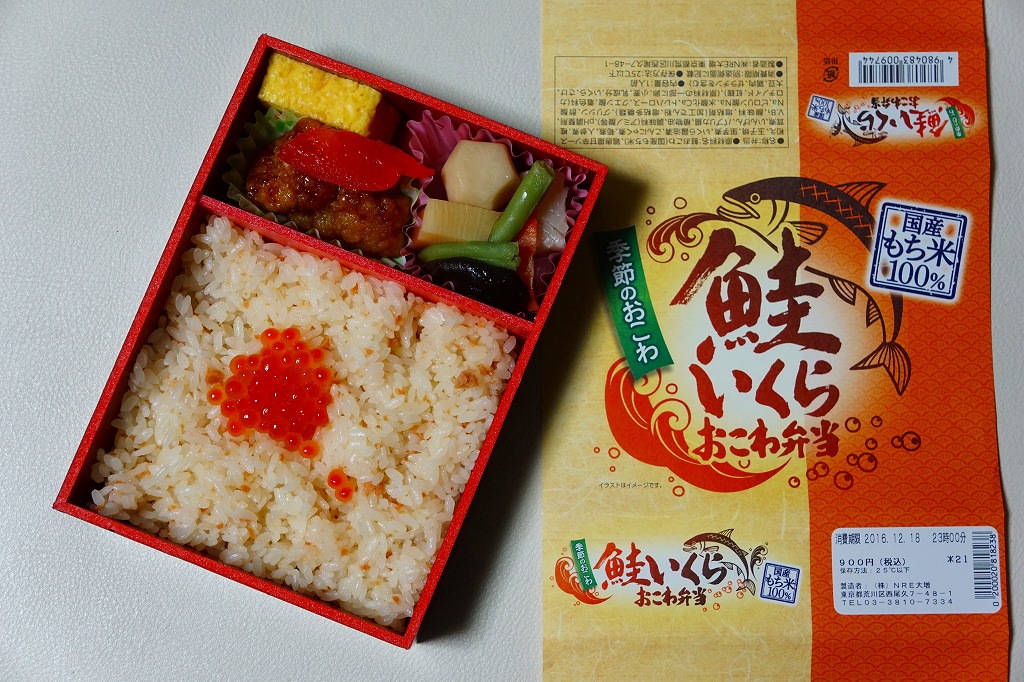 1990年代の発売。現在は東京、品川、新宿、上野、大宮の各駅で、毎年12月から2月まで販売される、季節のおこわ弁当の冬版。2012年の冬に発売のものから、名前と中身が「帆立おこわ弁当」から「鮭いくらおこわ弁当」に変わった。鮭フレークを混ぜたおこわにイクラをトッピングし、甘辛ソースの鶏唐揚、玉子焼、サトイモやタケノコなどの煮物、パプリカを添える。鮭を切り身の焼き物でなく、おこわに細かく混ぜたことで、風味を増感した印象。価格は2010年から880円、2014年から900円、2019年から930円、2020年から950円。2020〜2021年シーズンまでの販売か。
