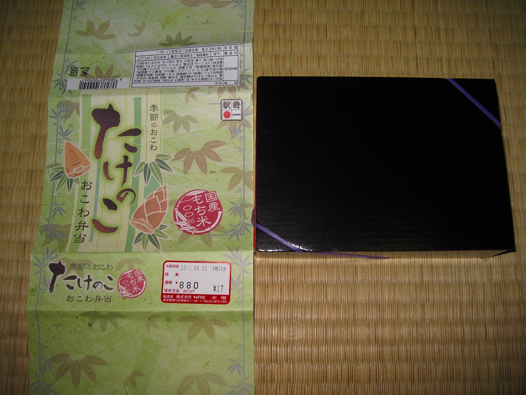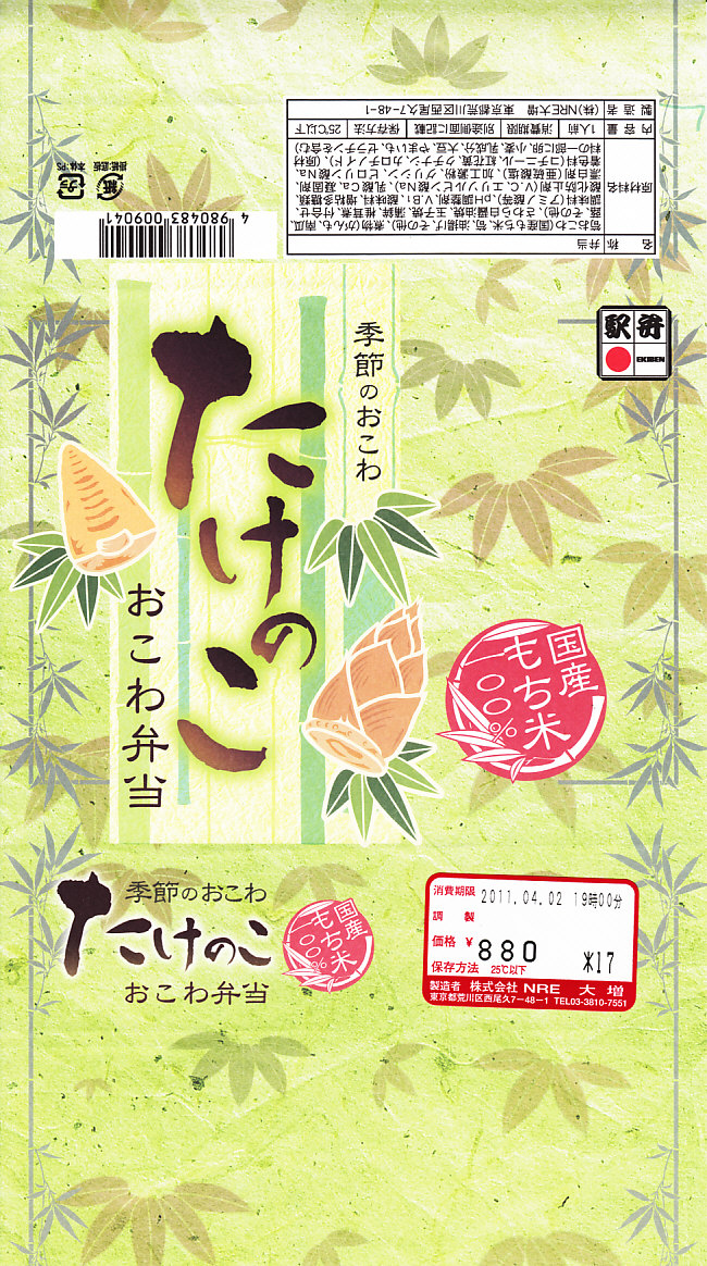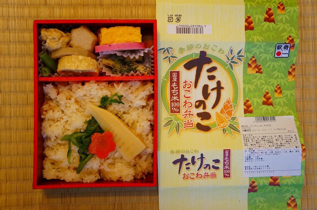 NREの首都圏エリアの、季節のおこわ弁当の20111年の春バージョン。前年の同じ名前の駅弁と比べて、容器や価格は変わっておらず、掛紙のデザインが変わり、御飯の上に載るタケノコが1切れに減り、鮭塩焼がサワラ白醤油焼に変わり、たけのこサラダが消えて煮物が増えた。