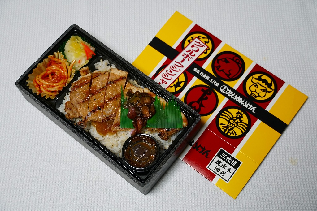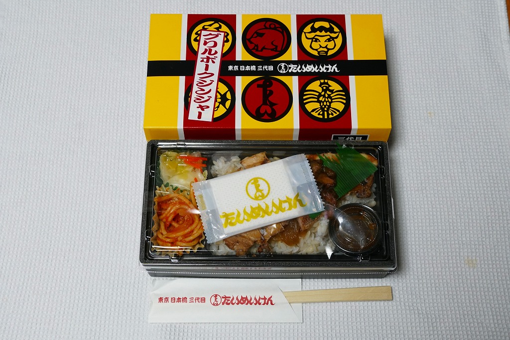 東京の駅や空港やデパ地下でおなじみの、「三代目たいめいけん」ブランドのお弁当のうちひとつで、2018(平成30)年の春までに発売か。麦飯を豚ステーキの生姜ソースで覆い、スパゲティ、コールスロー、柴漬け、ジンジャーソースを添えていた。2018年末頃までの販売か。