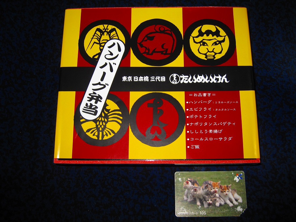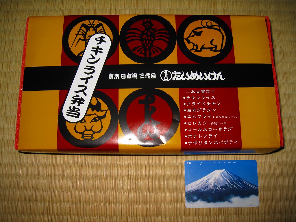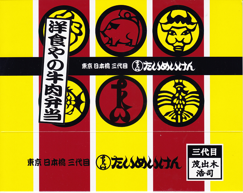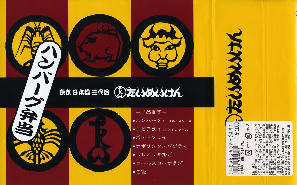 2009(平成21)年から急に羽田空港や東京都内で涌いてきた、たいめいけんブランドの弁当類のひとつ。黒塗りの容器に、このブランドのイメージイラストだと思うデザインの掛紙を巻く。中身は白御飯にハンバーグ、エビフライ、スパゲティ、ポテトフライと書いてある小イモふかし、ししとう、コールスローという、典型的なハンバーグ弁当。東京の日本橋で有名な老舗の洋食屋の味と言われれば、そうなのかなとは思うけれど、冷めてもおいしい弁当かと言われれば、そうではないと思う。2019年までの販売か。