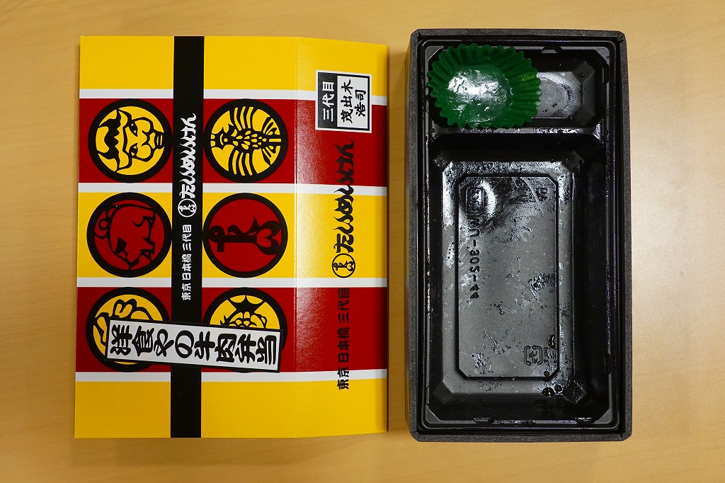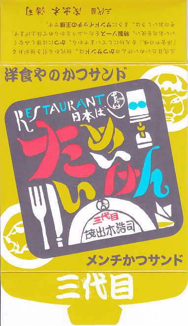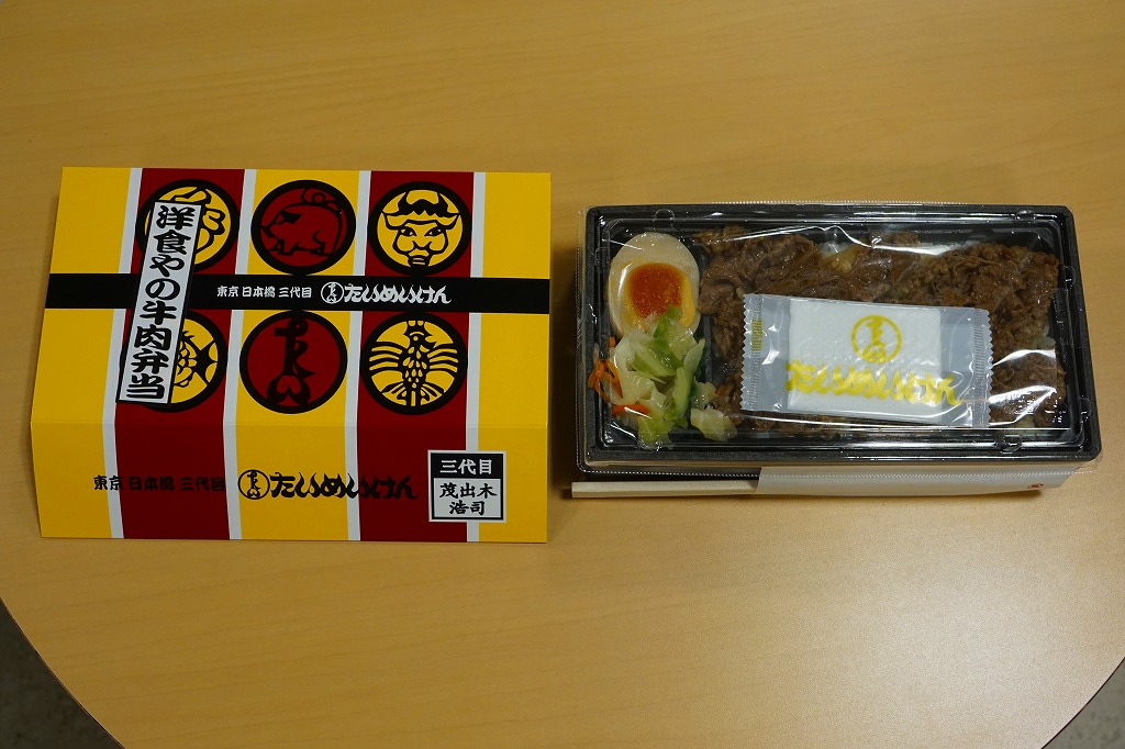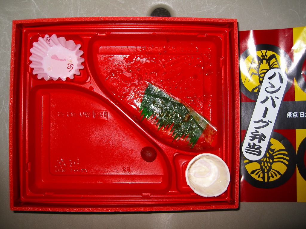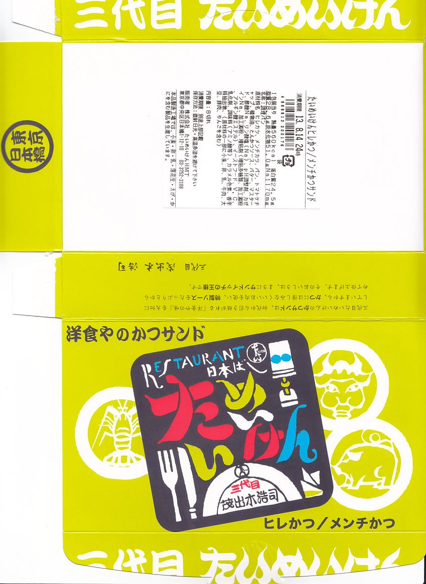 2009(平成21)年から急に羽田空港や東京都内で涌いてきた、たいめいけんブランドの弁当類のひとつ。黒塗りの容器に、このブランドのイメージイラストだと思うデザインの掛紙を巻く。中身は白御飯にハンバーグ、エビフライ、スパゲティ、ポテトフライと書いてある小イモふかし、ししとう、コールスローという、典型的なハンバーグ弁当。東京の日本橋で有名な老舗の洋食屋の味と言われれば、そうなのかなとは思うけれど、冷めてもおいしい弁当かと言われれば、そうではないと思う。2019年までの販売か。