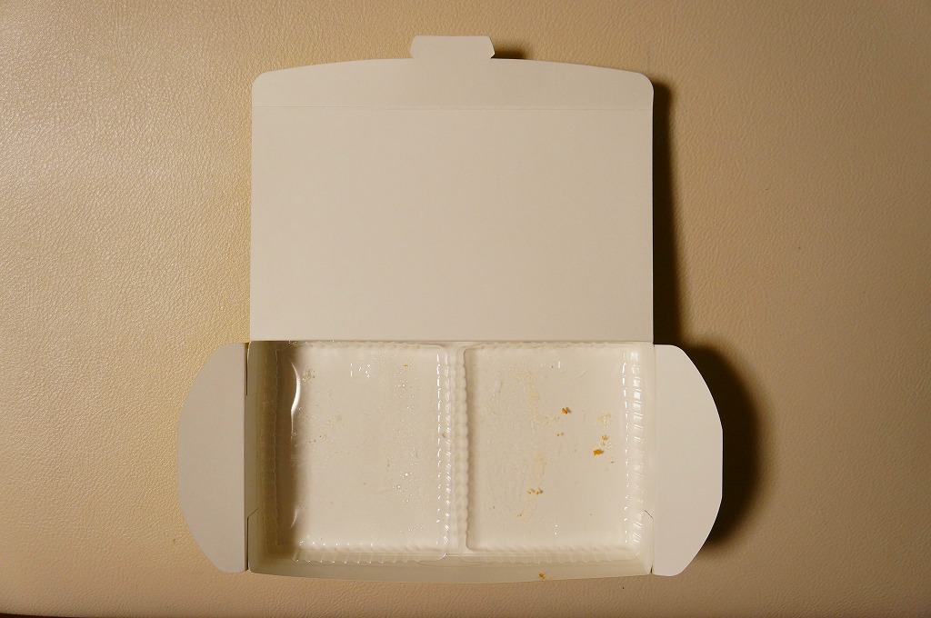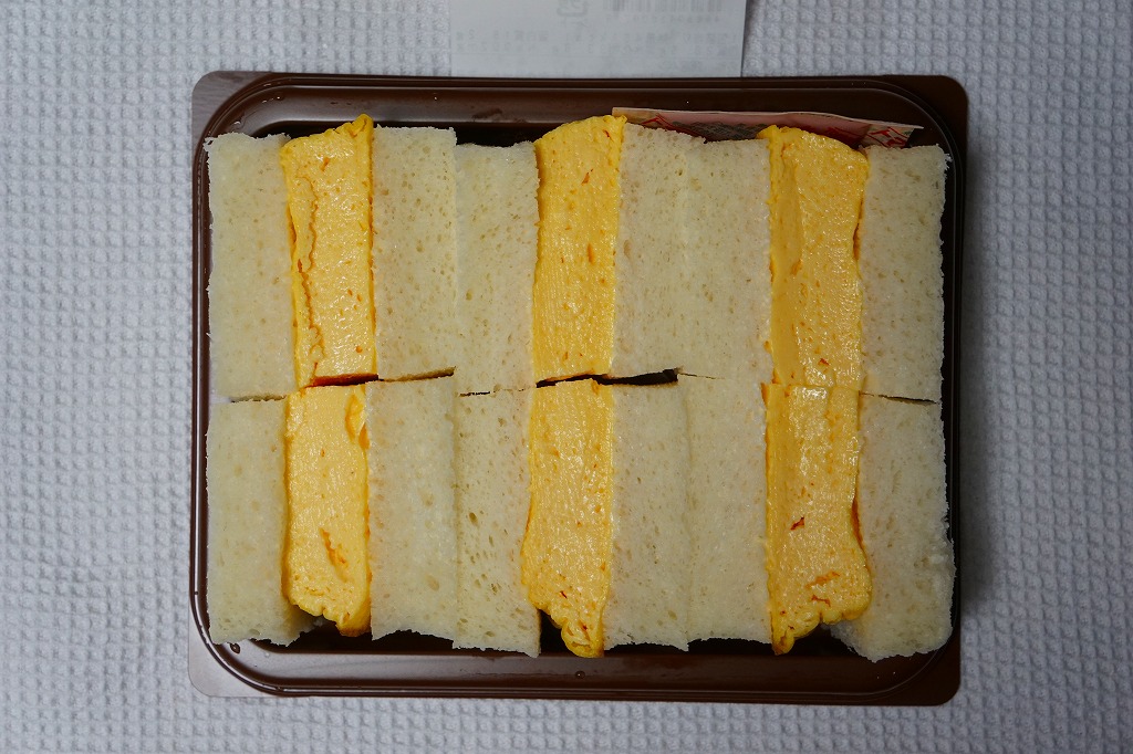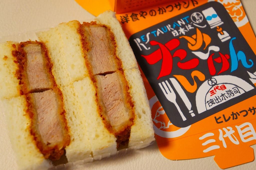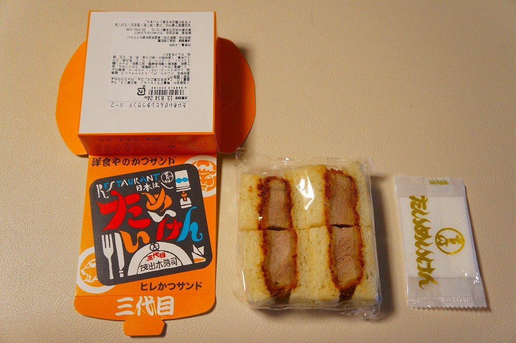 東京駅や羽田空港、その他都内各地で幅を利かせるカツサンドの、小さいパッケージのヒレカツタイプ。透明なトレーに収めた袋詰めのヒレカツサンドが、2切れ×2分割で紙箱に収まる。この商品は2020年頃から、駅ではその姿を見ていない。
