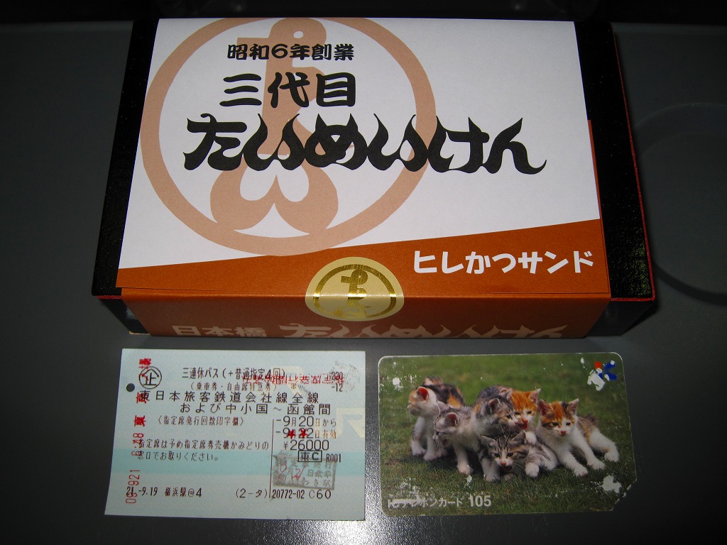2009(平成21)年のこの頃から駅へ進出してきた、東京日本橋で有名な洋食屋のブランドを名乗るカツサンド。黒い小さな箱に同じ素材でふたをして、商品名を書いたやや厚手な掛紙を巻く。中身はカツサンドが4切れですべて。880円もするほど、老舗の店名を名乗るほど素晴らしくはない、普通の今風なカツサンドという感じ。この弁当は2020年頃から、駅ではその姿を見ていない。