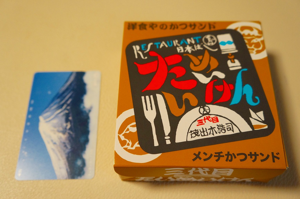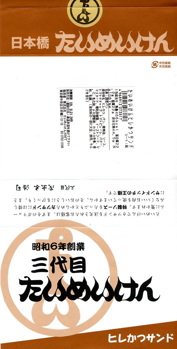 中身はつまり、都内のデパ地下や空港や駅でおなじみの、「三代目たいめいけん」を名乗るサンドイッチで、ヒレかつサンドとタルタルエビかつサンドをそれぞれ2切れ詰めた透明な袋を箱に詰める。紙箱にその東京駅舎を描くことで、東京駅限定商品となる。商魂たくましいなと思う。この箱では2013年頃まで、商品自体は2017年までの販売か。