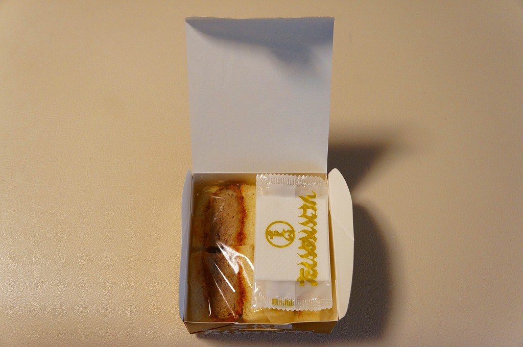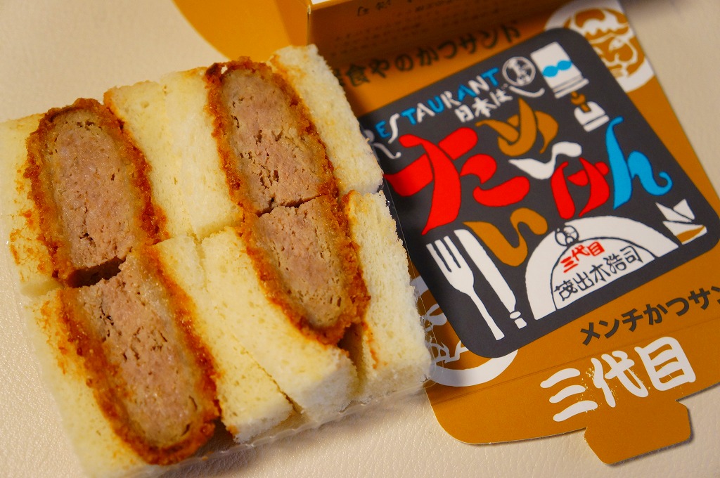 東京駅や羽田空港、その他都内各地で幅を利かせるカツサンドの、小さいパッケージのメンチカツタイプ。透明なトレーに収めた袋詰めのメンチカツサンドが、2切れ×2分割で紙箱に収まる。この商品は2020年頃から、駅ではその姿を見ていない。