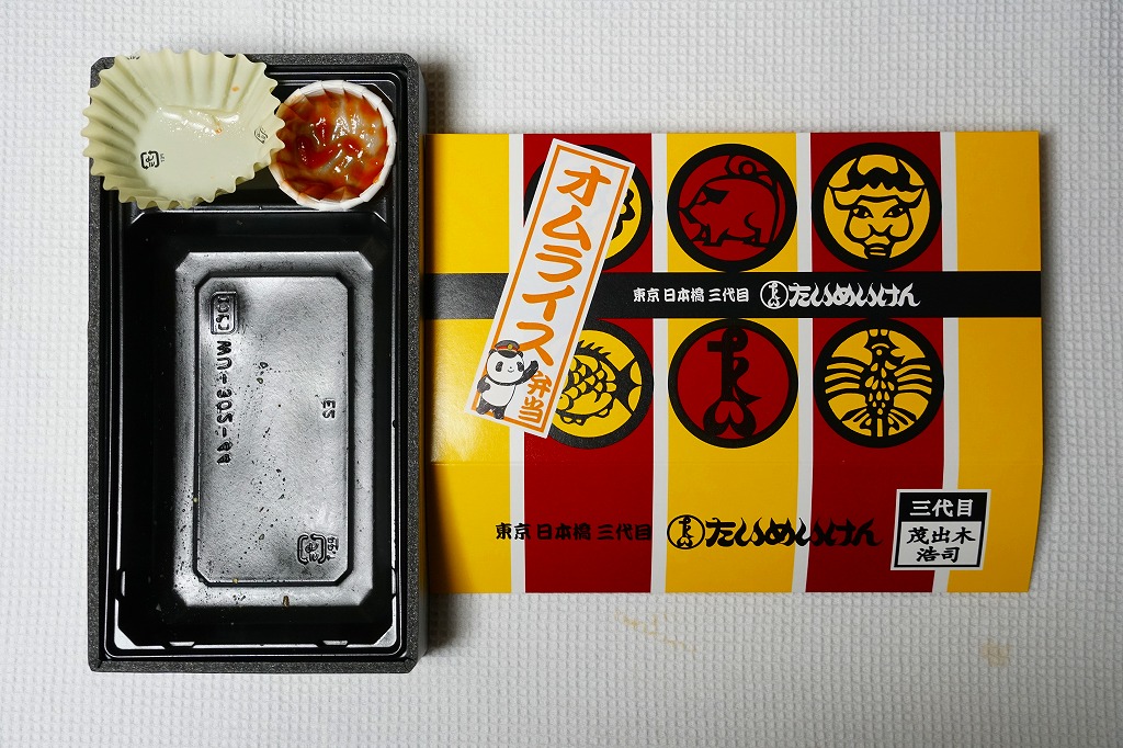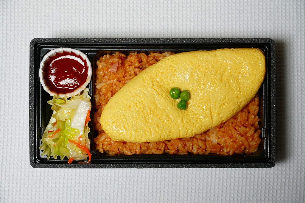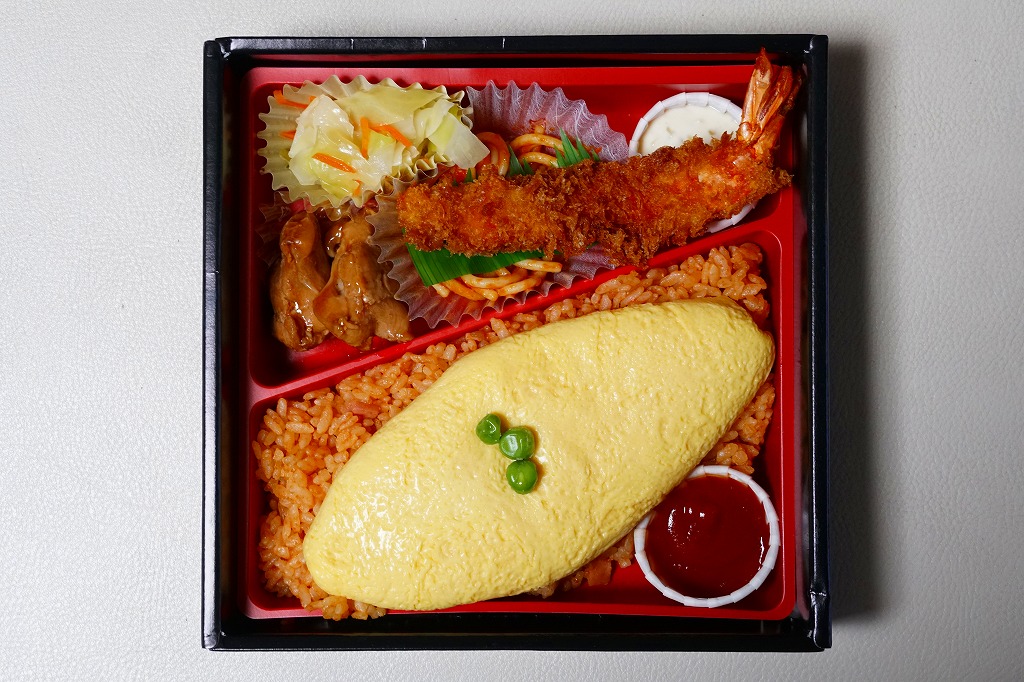 東京の駅や空港やデパ地下でおなじみの、「三代目たいめいけん」ブランドのお弁当のうちひとつで、2016(平成28)年までには登場していた模様。ケチャップライスにふわとろオムレツをのっそり載せ、エビフライ一尾に鶏肉やスパゲティやタルタルソースを添えるお惣菜。この弁当は2020年頃から、駅ではその姿を見ていない。