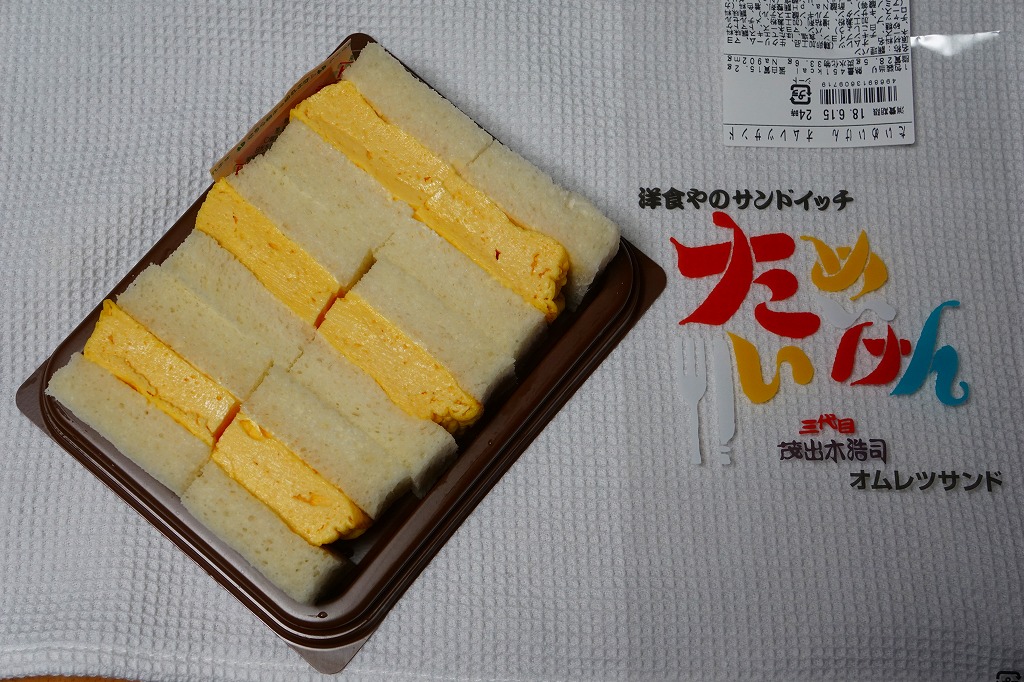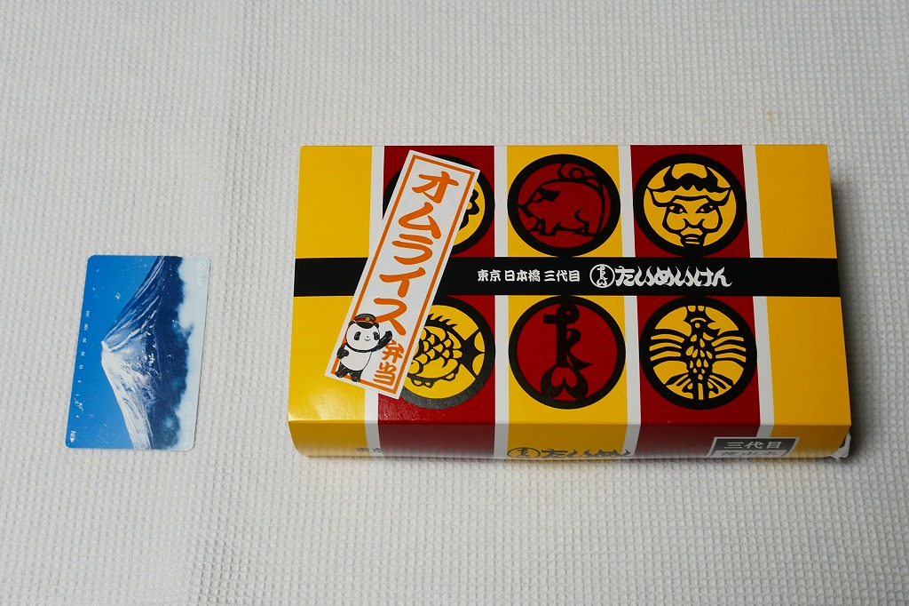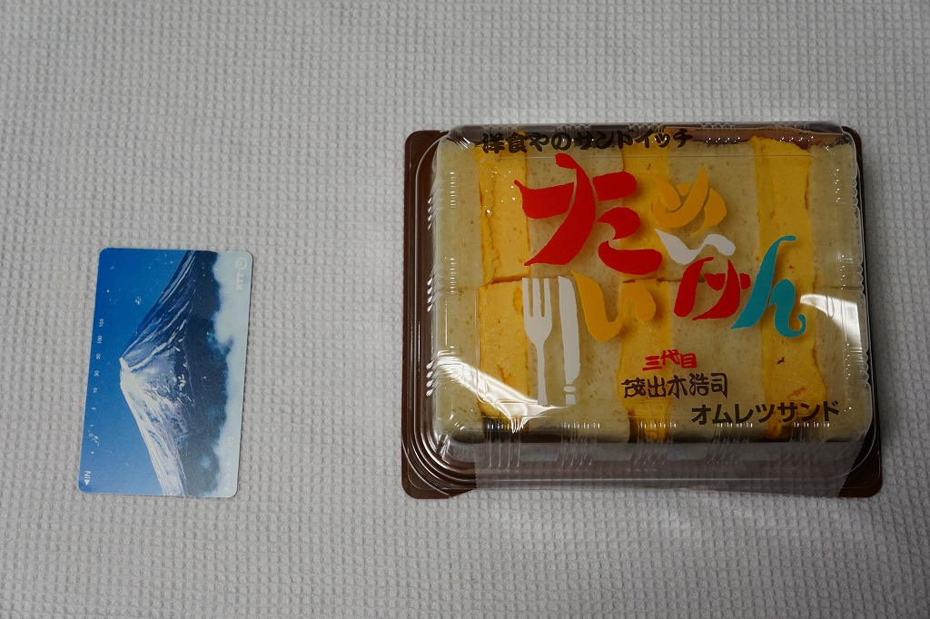 2018(平成30)年4月までに発売か。この頃には全国の大都会で見られるようになった、玉子焼のみを挟んだサンドイッチの、たいめいけんブランド版。車内販売でも買えるコンビニ風のプラ容器に、玉子焼をパンで挟んで、実質3切れ分。「オムレツサンド」を名乗るものの、つまり「天のや」などのたまごサンドと同じもので、味も似たようなもの。少し柔らかかったかもしれない。商品名をデザインしたフィルムを巻き、すこし駅弁らしく装飾していた。2019年までの販売か。