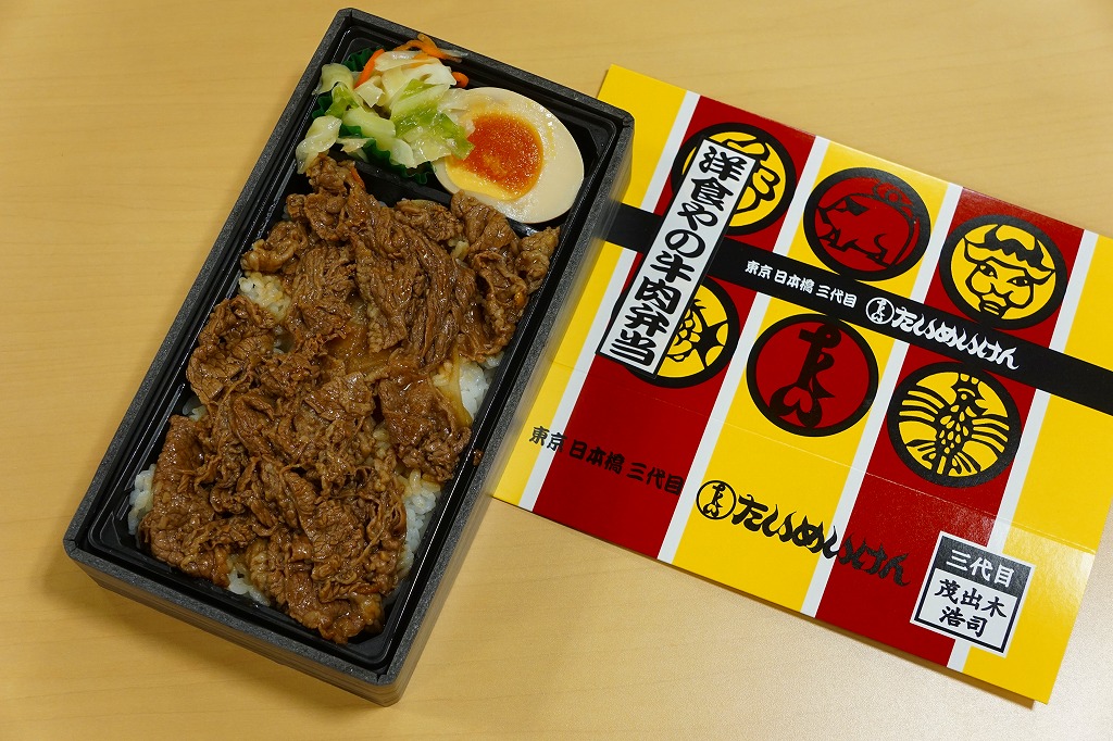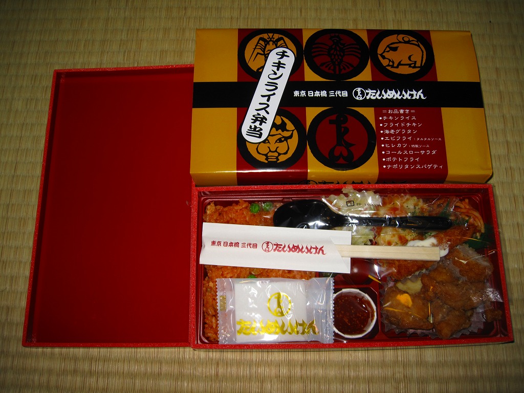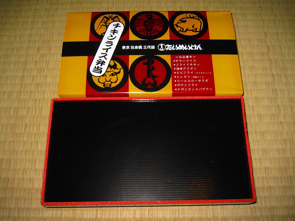 羽田空港や東京都内で2009(平成21)年から増殖を続けている、たいめいけんブランドの弁当類のひとつとして、2010年5月までには発売か。黒塗りの赤い容器を使用、一連のたいめいけん商品と同じ意匠の掛紙を巻く。