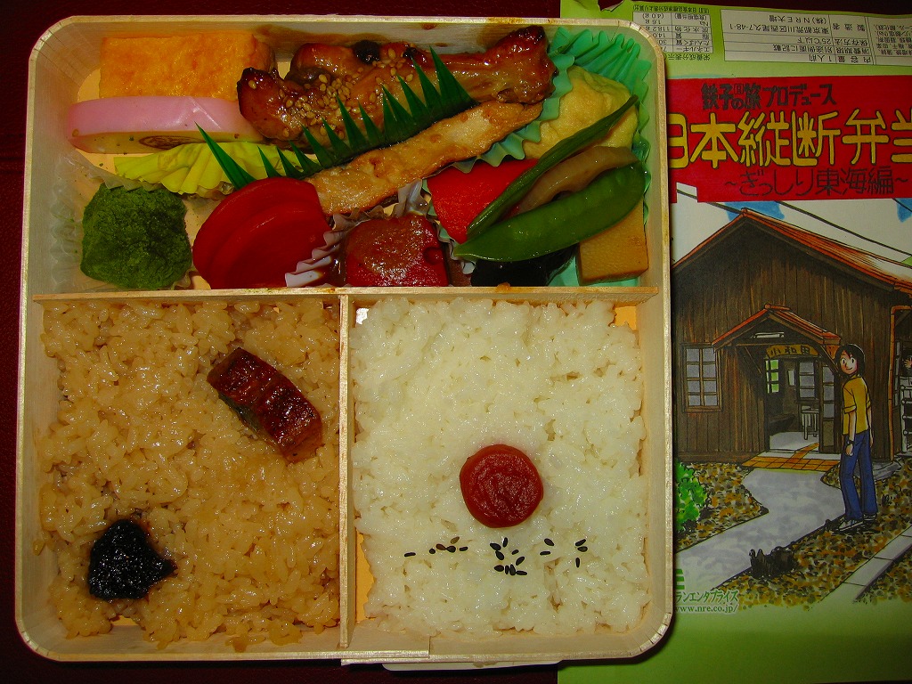 中身は掛紙ともども「東海編」ということで、日の丸御飯とウナギ付き茶飯、金目鯛ほう葉味噌焼、シイタケなどの煮物、手羽先、赤かぶ漬、抹茶わらびもちなど。千円という価格を考えると今回はちょっと割高な印象だが、国が仲裁に入るくらい激しいJR東日本とJR東海の不仲の中、JR東日本の100%子会社がよくぞ東海ネタの駅弁を出せたもの。伊豆半島も東海だ、と金目鯛を入れたという添付のマンガのネタに、裏話が隠れているのかもしれない。