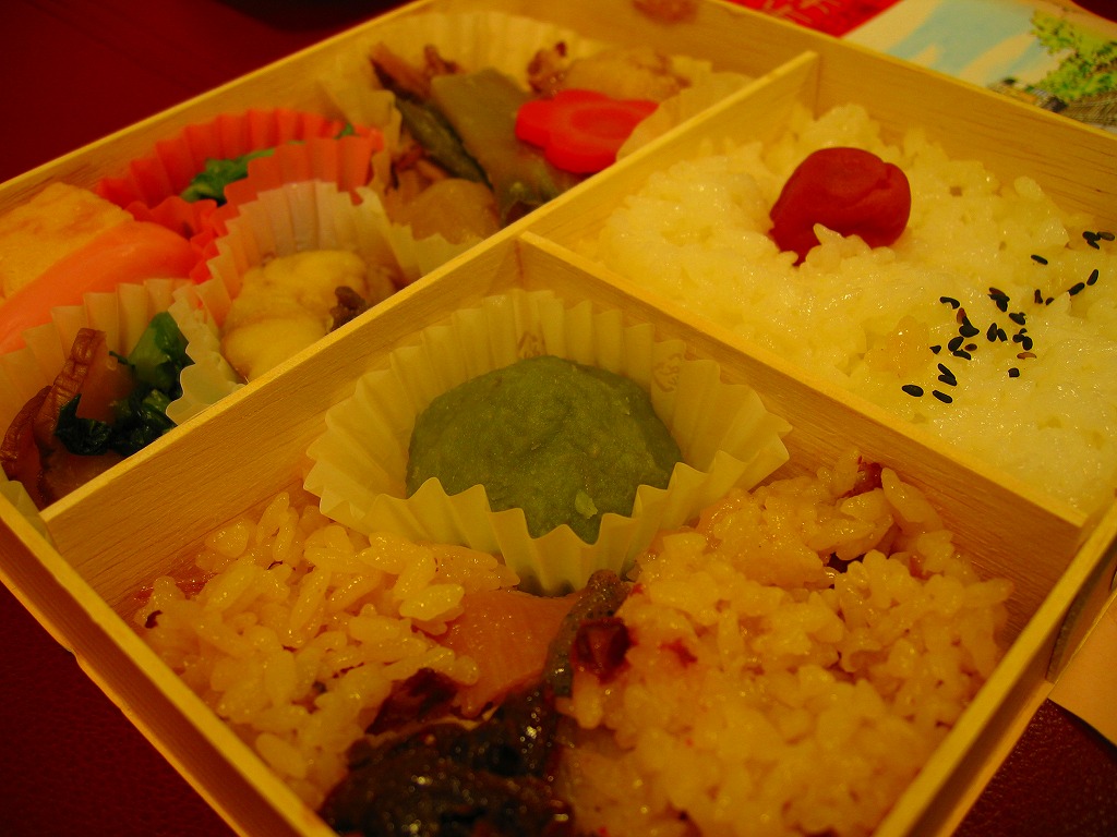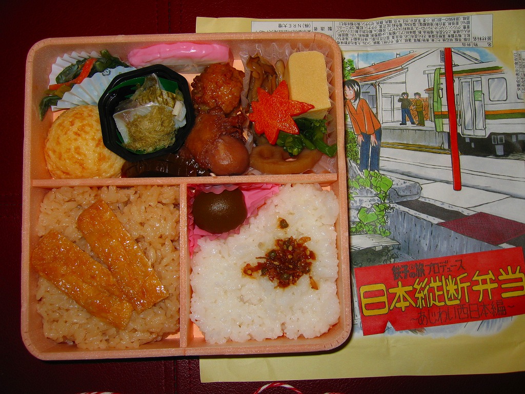 中身は「四国・九州編」ということで、かしわめしが1/4、明太子とカツオふりかけを載せた白御飯に大学芋を添えて1/4、残りはおかずで玉子焼、かまぼこ、豚肉照焼、ナスのオランダ煮、オリーブ、薩摩揚、筑前煮、パパイヤかぼすなど。コンテンツをあれこれと詰めすぎて、個々の食材や分量がチープな感じになった印象。これならば四国と九州をちゃんと分けて作ったほうが良かったと思う。