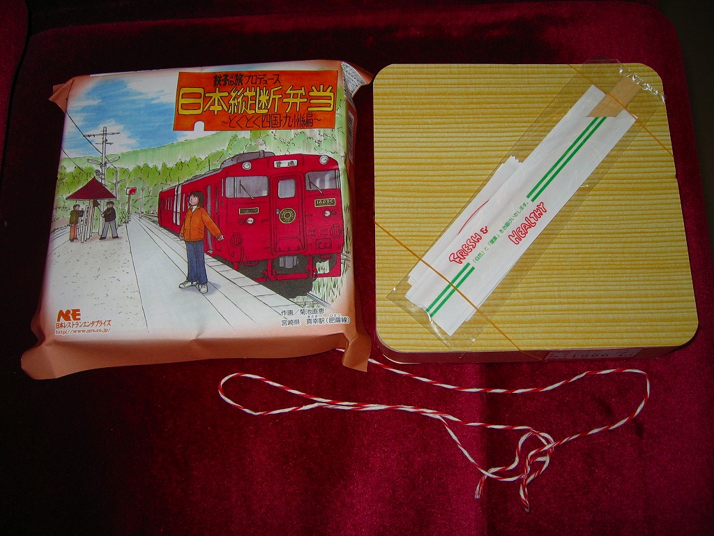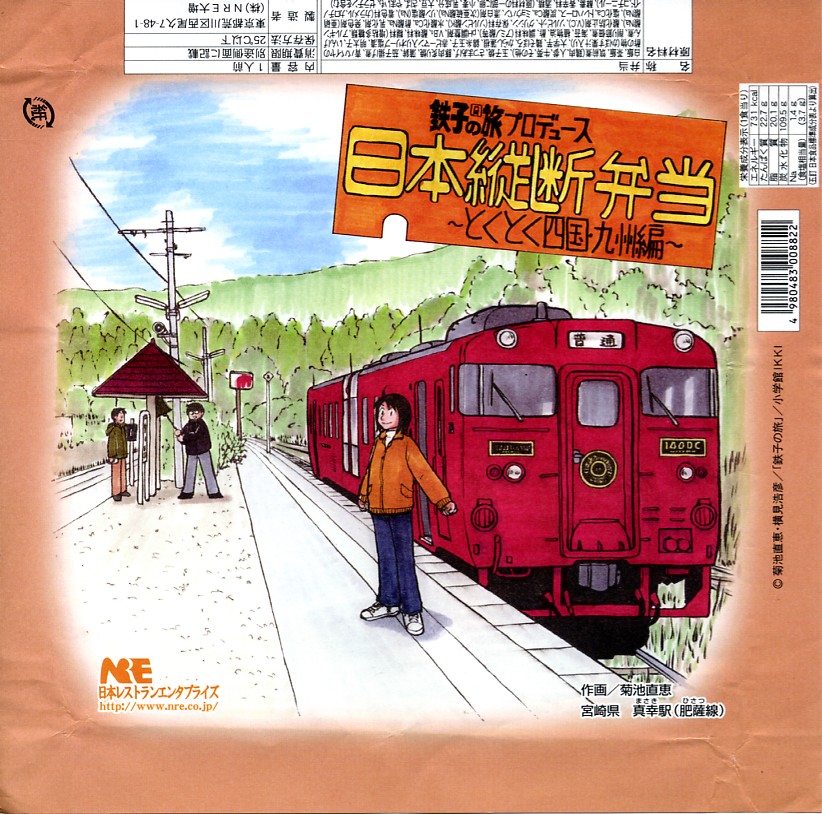 漫画「鉄子の旅」の著者である菊池直恵がプロデュースした駅弁の第5弾で、2009(平成21)年1月15日に西日本編から切り替え。今回は四国と九州が一緒にされて、一気にファイナルへ向かってしまった。ふたと枠に経木を使う正方形の容器に、九州の宮崎県・肥薩(ひさつ)線真幸(まさき)駅のイラストを漫画家自身が描いた掛紙をかける。