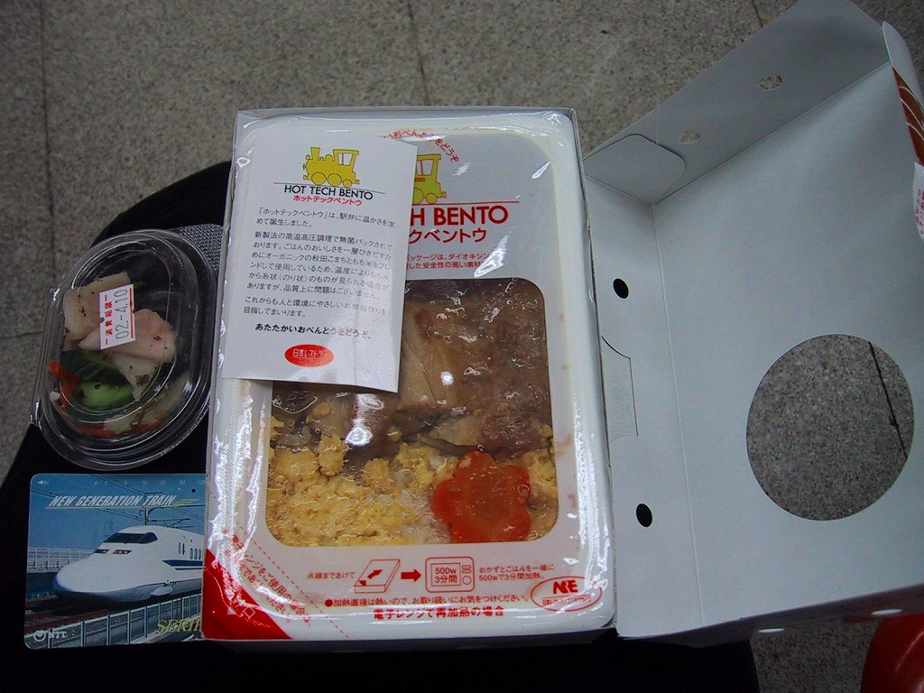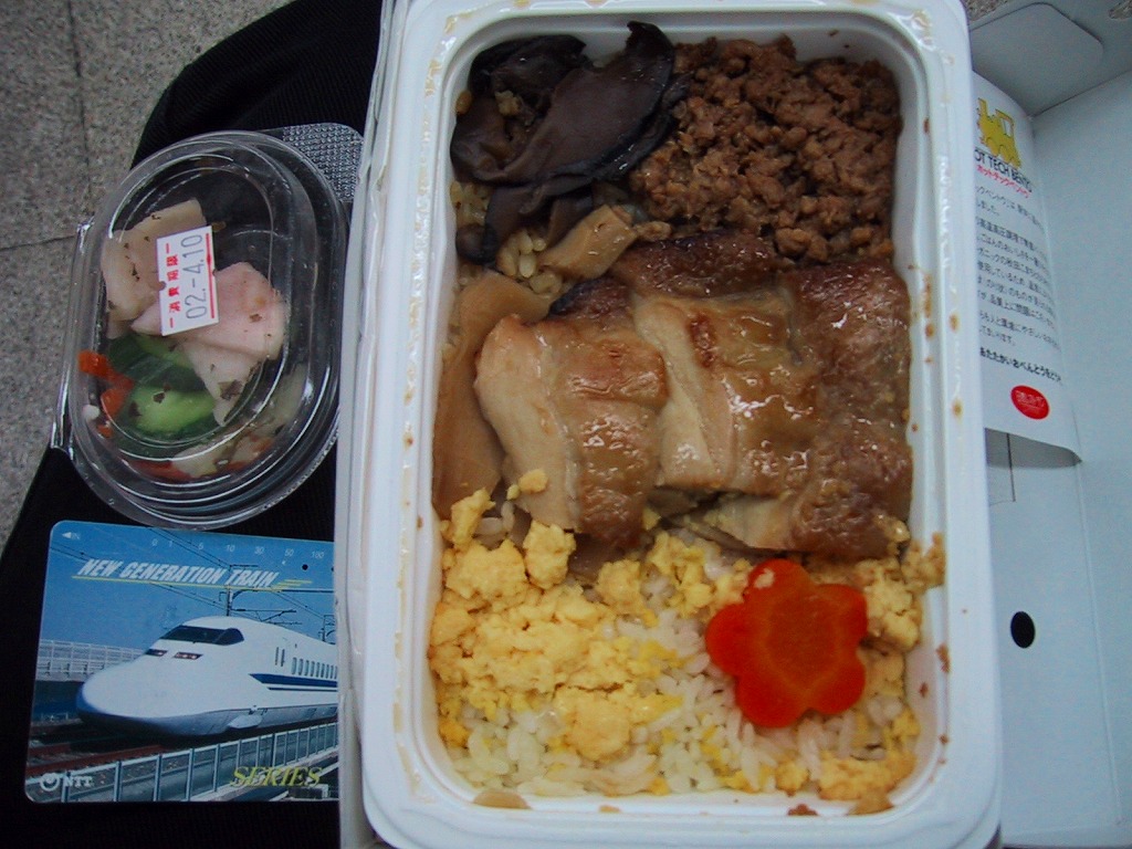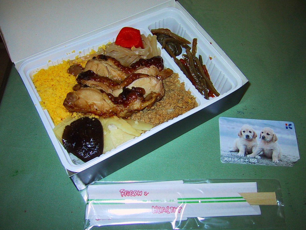 つまり四角い「O−bento」。暖かい点は評価できるが本来の素材の良さは冷凍と解凍により失われた感が強く、この値段なら20円安い「鳥めし弁当」を選択したい。2003年5月限りで販売終了とか。