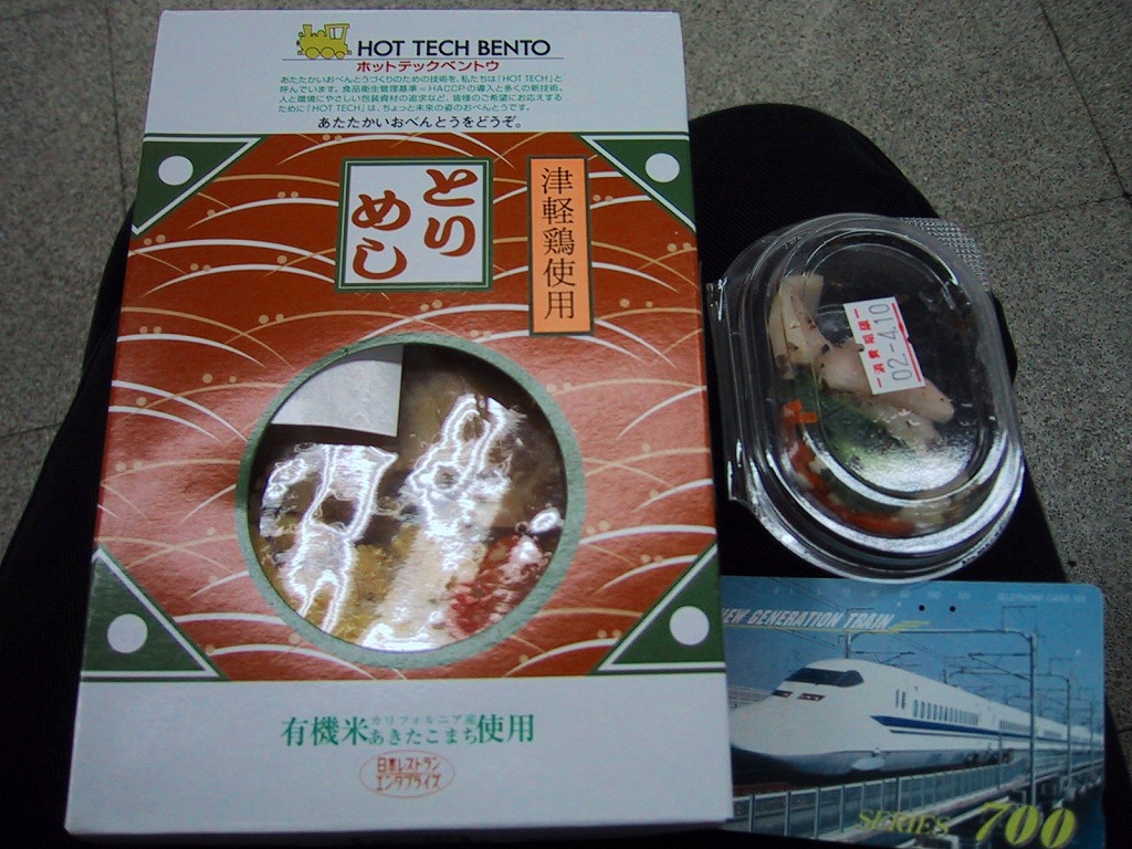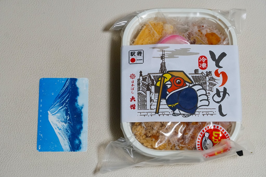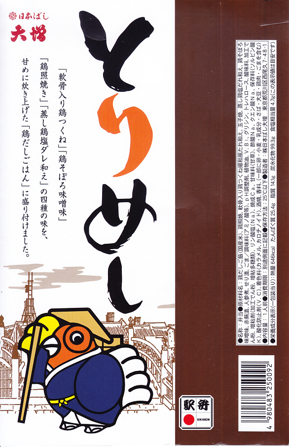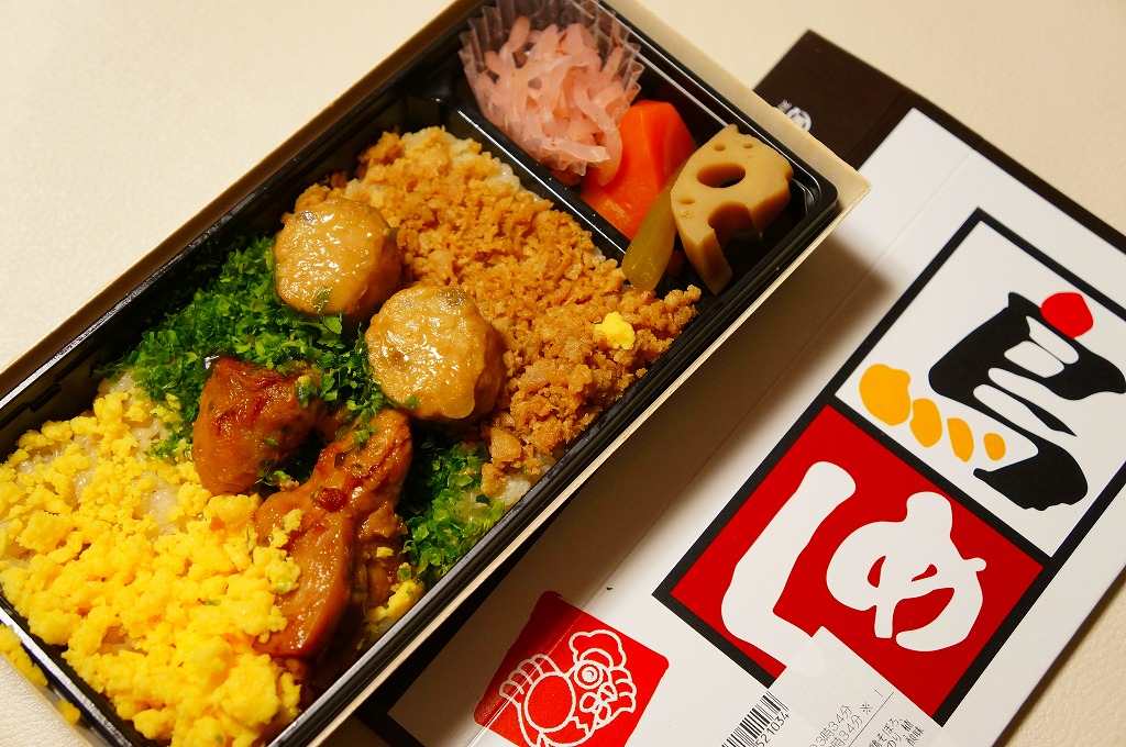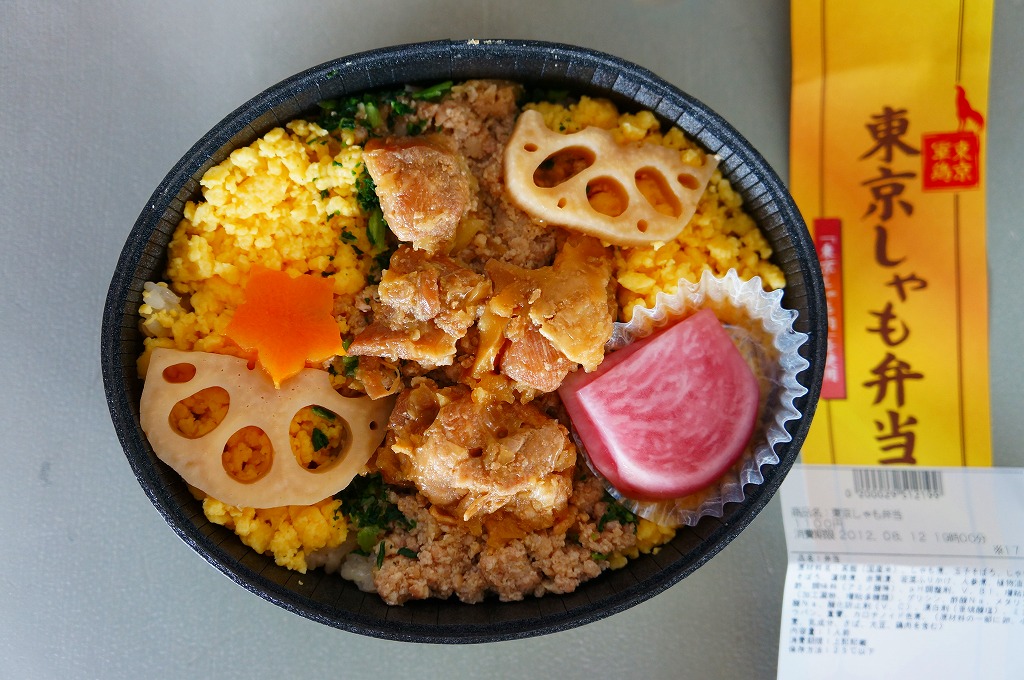 東京、品川、新宿、上野、大宮の各駅で、手広く売られる鶏飯駅弁。長方形の容器に茶飯を詰め、鶏照焼2個、鶏肉団子2個、鶏そぼろ、玉子そぼろ、きんぴらごぼうで覆い、がんもどき、こんにゃく、ニンジン煮、柴漬けを添える。近年に好まれる「鶏」でなく「鳥」の字を使う。特徴があるわけでなく、東京にちなむものでなく、でも駅弁として、味と中身と価格がよくできていると思う。飲み物と合わせて千円という価格も、よくできている。2020年11月に上記の「とりめし」へリニューアル。