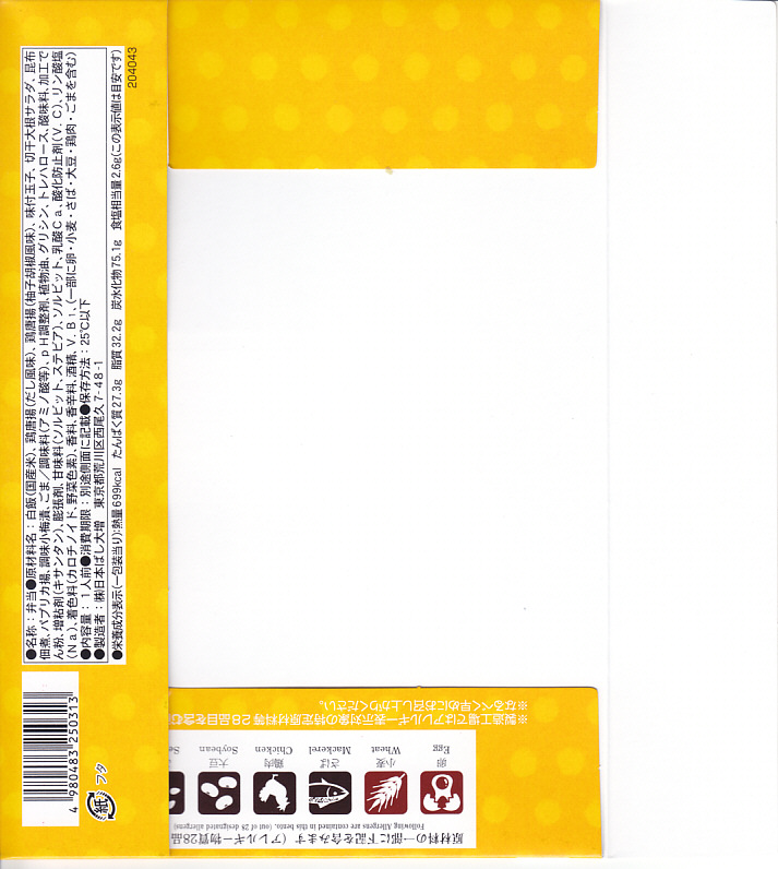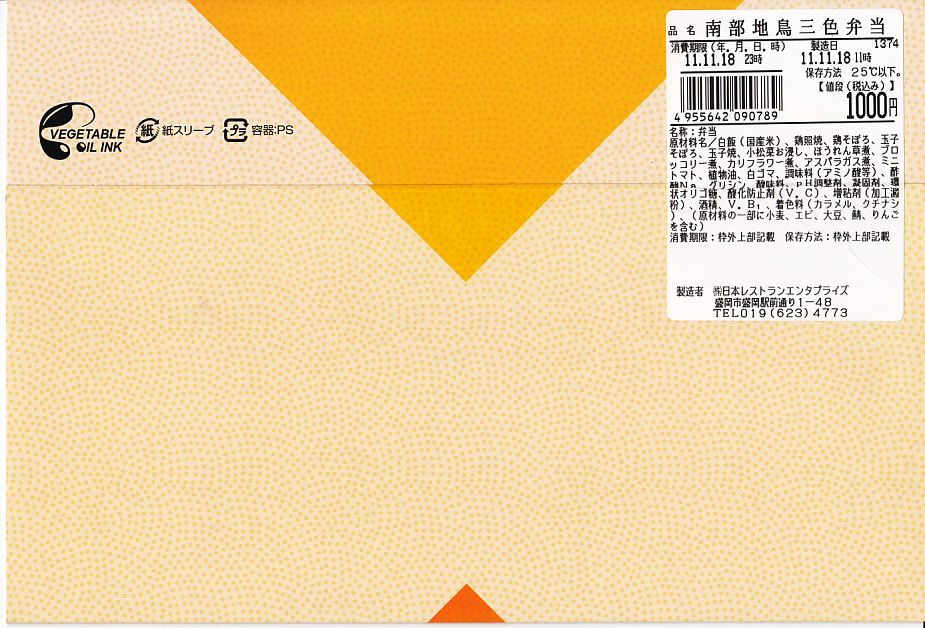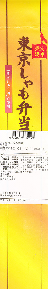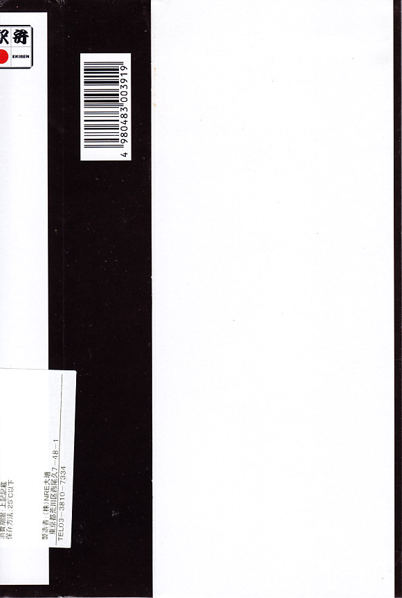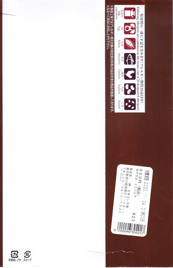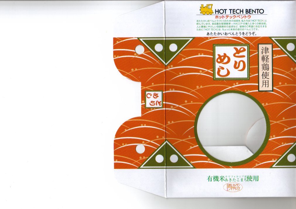 2001(平成13)年10月14日15時2分の調製である東京駅弁のボール紙製のふた。現在のNRE大増は、当時は日本レストラン調理センターの名称であった。意匠は異なるが価格も中身も上記の2006年のものと同じ。