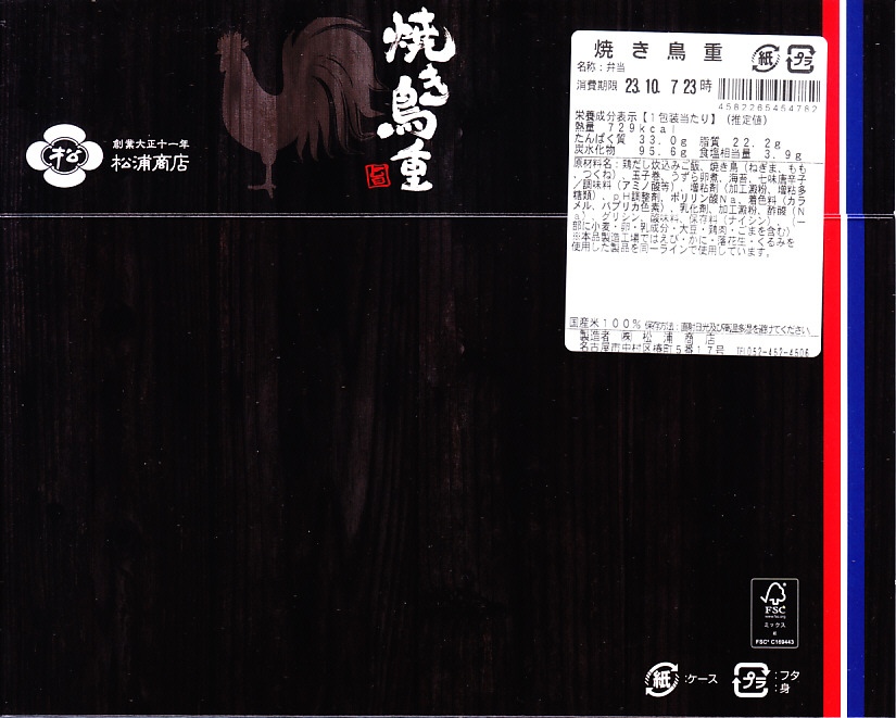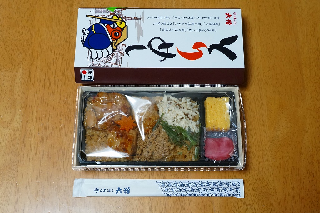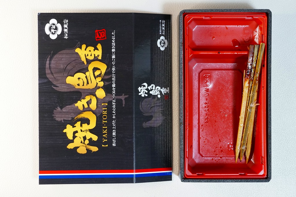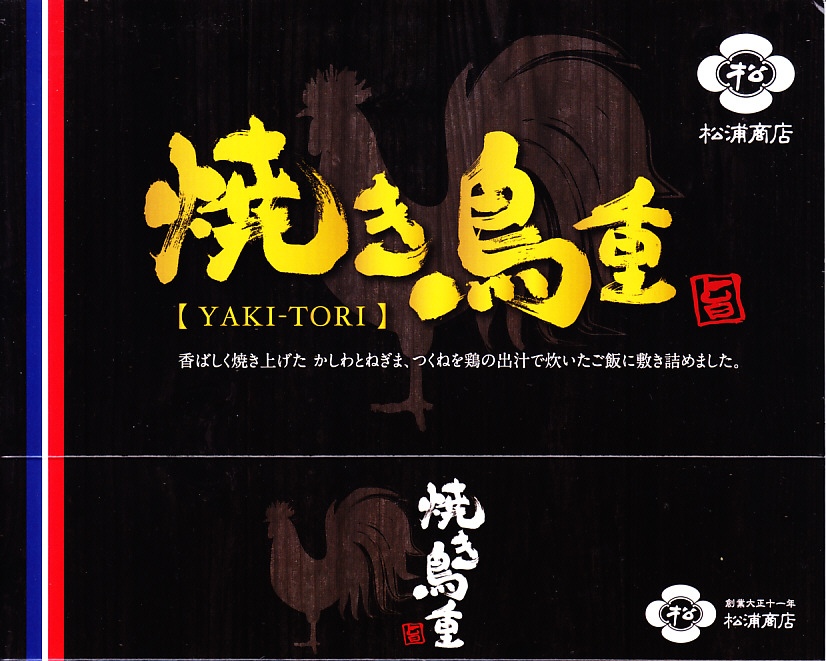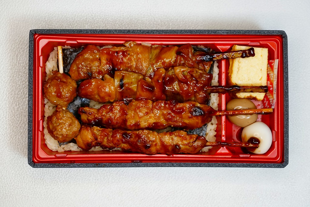 2023(令和5)年の7月までに東京駅で発売か。調製元は愛知県名古屋駅の駅弁屋であるが、名古屋駅の駅弁としては紹介されず、プロ野球団の中日ドラゴンズのナゴヤドームではヤクルト戦(東京が本拠地)で「球弁(たまべん)」のひとつとして3月から販売されたらしく、名古屋でなく東京の駅弁と考えられる。商品名を記した真っ黒なスリーブに収めた、長方形のプラ容器に、鶏の出汁で炊いたという御飯を詰め、海苔で覆い、ねぎまとももの串ありタレ焼き鳥計4本と鶏つくね串でも覆い、玉子焼とうずら卵2個を添える。串を抜かず、他のおかずを付けず、飯と鶏のみでできた、これは本物の焼き鳥弁当。肉の締まりも良かった