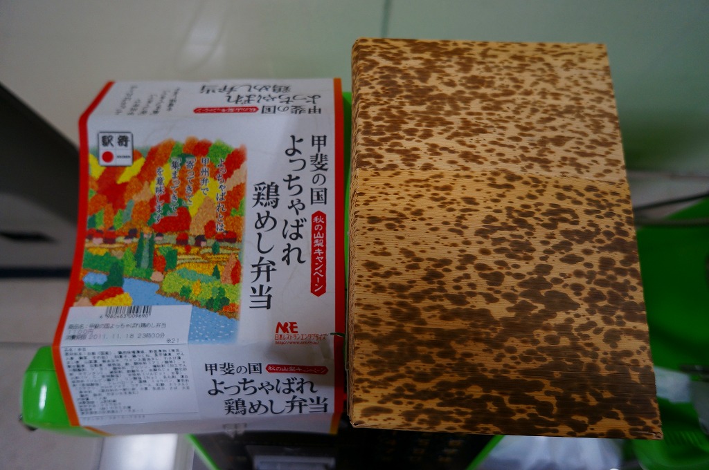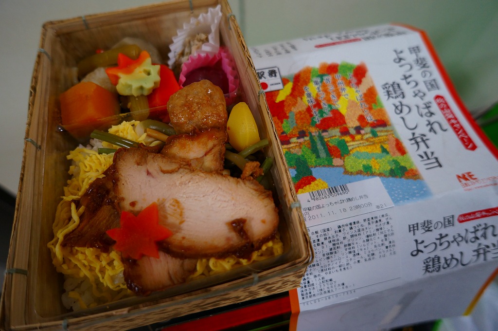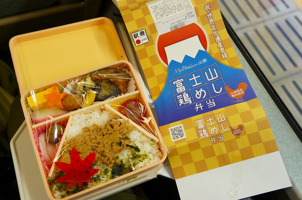 中身はとりそぼろと生のりをかけた白御飯に、鶏味噌焼、鶏つくね、玉子焼、かまぼこ、マイタケ天、カボチャとナスの素揚げ、星形ニンジン、べったら漬と小茄子漬、和菓子など。味と中身は総論として、東京のNREの鶏飯駅弁。実際に販売期間中の東京エリアではほぼ、既存の鶏飯駅弁を置き換えるような形でたくさん売られていた。鶏に山梨県産を使い、御飯で富士山を描くことで、発売の趣旨に合わせる。
