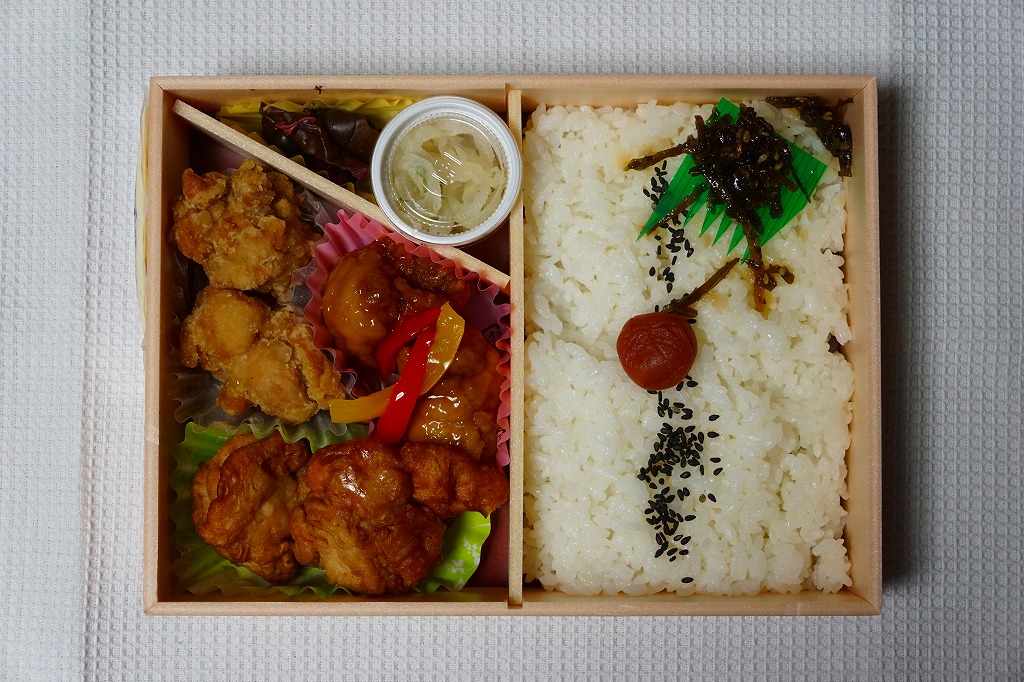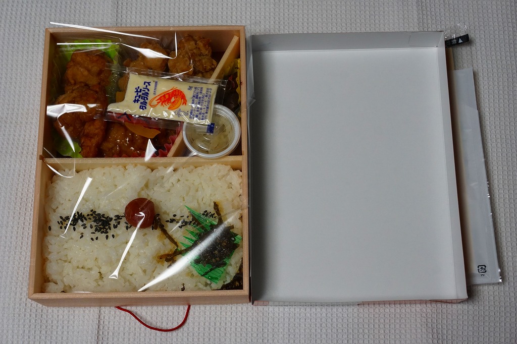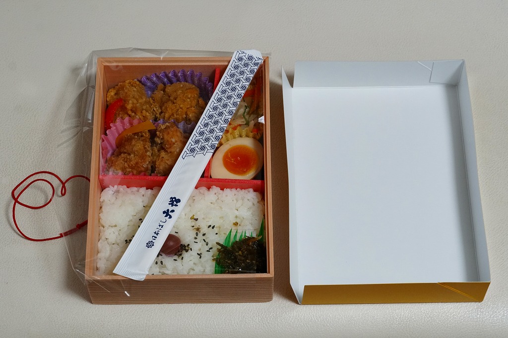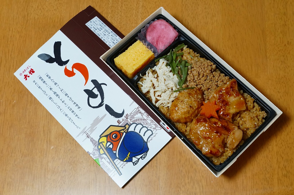日の丸御飯に、茨城県の「常陸鶏(ひたちどり)」の赤い旨からあげ、岩手県の「地養鳥(じようどり)」の黒い甘辛だれからあげ、長野県の「健味どり(けんみどり)」の黄色いカレー風味からあげを詰め、マカロニサラダ、柴漬け、いぶり漬物を添える。3種各2個の鶏唐揚には、無味で小さく湿気た感じを受けたが、きっとウイスキーのソーダ割りのおつまみに合うものなのだろう。