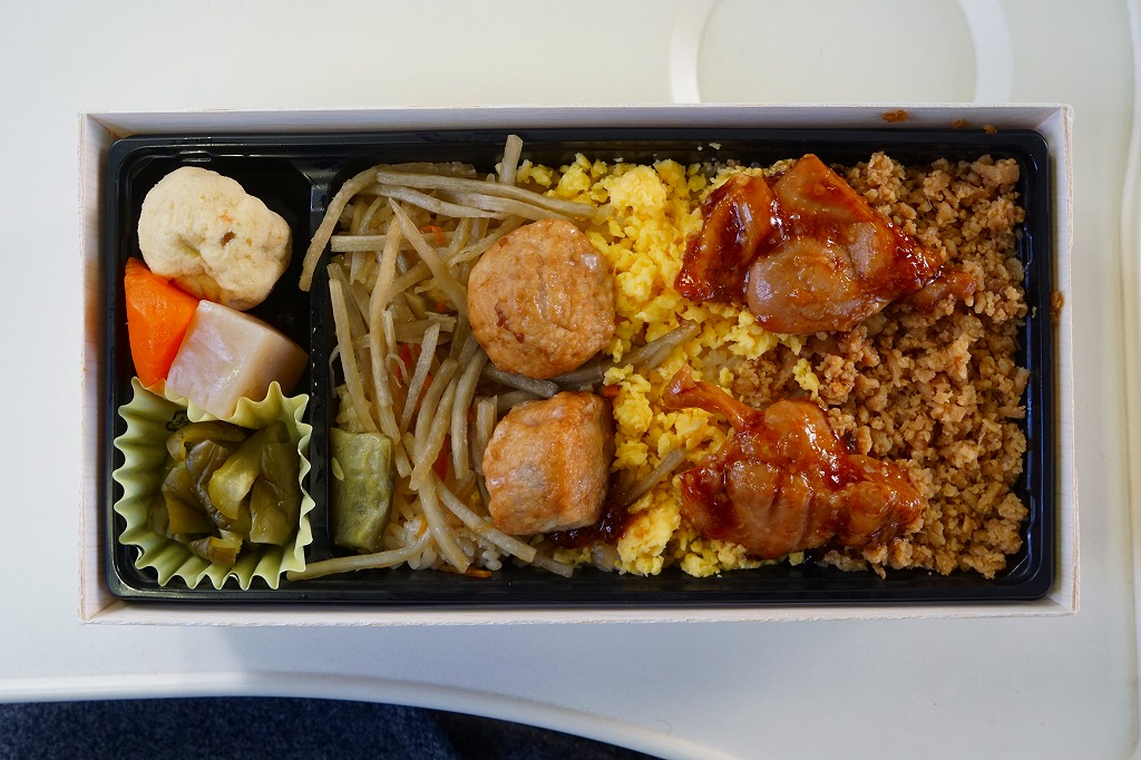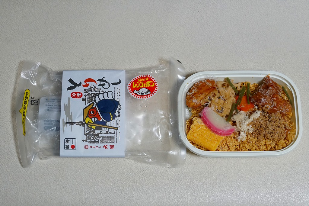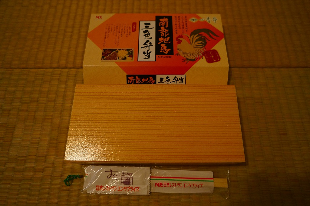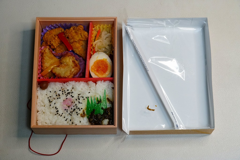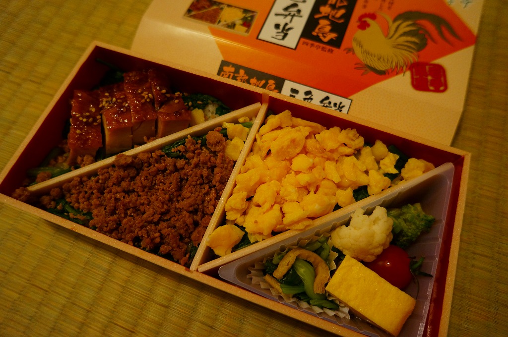 日の丸御飯に、茨城県の「常陸鶏(ひたちどり)」の赤い旨からあげ、岩手県の「地養鳥(じようどり)」の黒い甘辛だれからあげ、長野県の「健味どり(けんみどり)」の黄色いカレー風味からあげを詰め、マカロニサラダ、柴漬け、いぶり漬物を添える。3種各2個の鶏唐揚には、無味で小さく湿気た感じを受けたが、きっとウイスキーのソーダ割りのおつまみに合うものなのだろう。