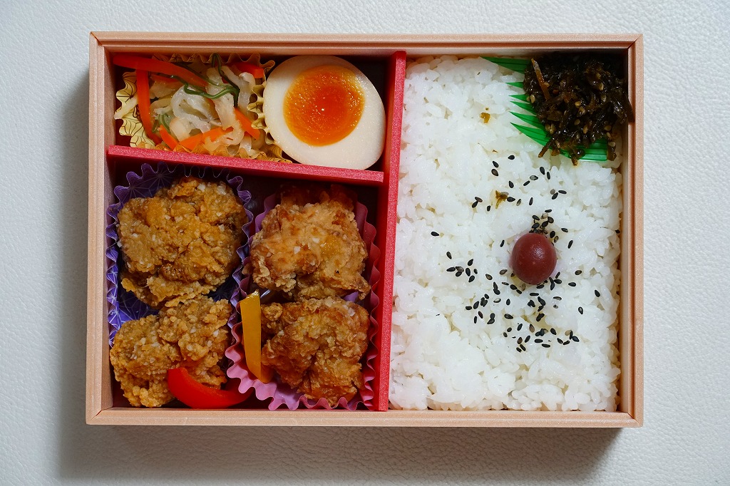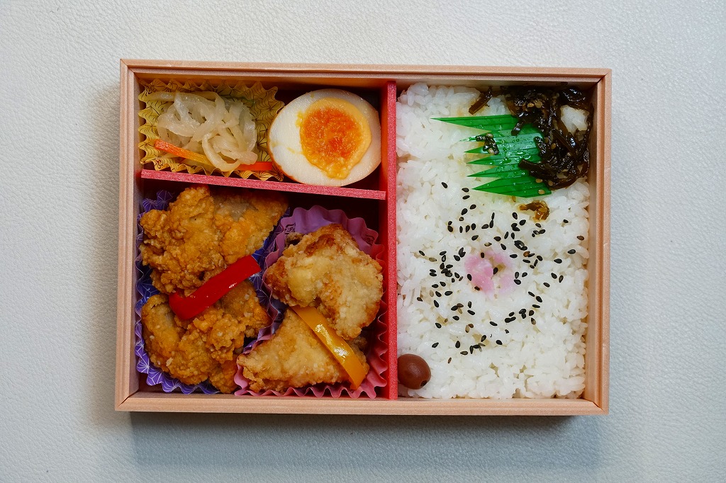 2021(令和3)年9月26日に東京、品川、新宿、上野、大宮の各駅で発売。10月のJR東日本の駅弁キャンペーン「駅弁味の陣2021」にエントリー。公式には過去を語らないが、下記の駅弁「唐揚げざんまい弁当」のリニューアルだろう。四角い容器に白飯を詰め、黒ごまを振って昆布と小梅を添え、鶏もも肉の高知県産宗田節のだし唐揚げと、鶏むね肉の高知県産ゆず果汁の柚子こしょう唐揚げを2個ずつ詰め、半身の味付け卵と切り干し大根を添える。