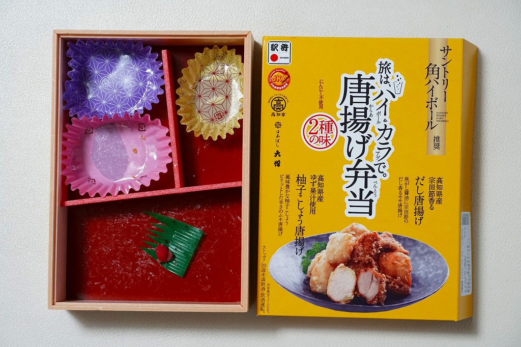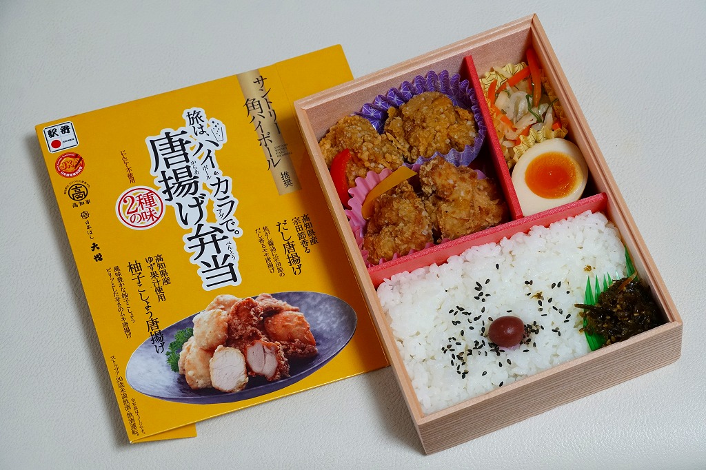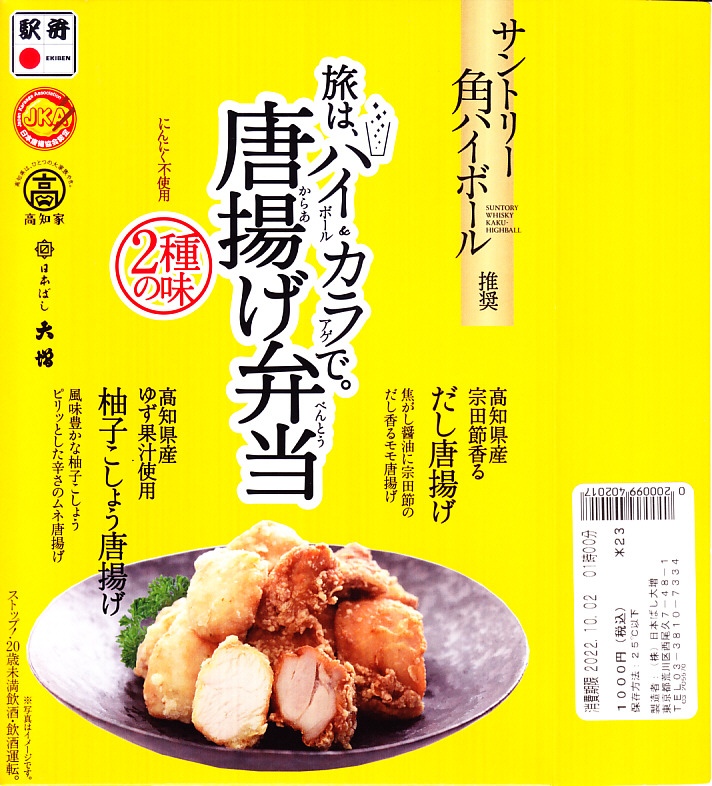 2022(令和4)年10月に東京で発売か。調製元もタイアップと思われる先も何も発表していないが、これは下記の駅弁「唐揚げ弁当」のリニューアルにも見えるし、2015年9月に販売された「大人のハイカラ弁当」の復刻か再販売なのかもしれない。商品名や宣伝文と鶏唐揚の写真を使うふたには、「サントリー角ハイボール推奨」の文字と、日本唐揚協会認定のマーク、高知県と高知県地産外商公社が行う高知県振興キャンペーン「高知家」のマーク、駅弁マークを記す。
