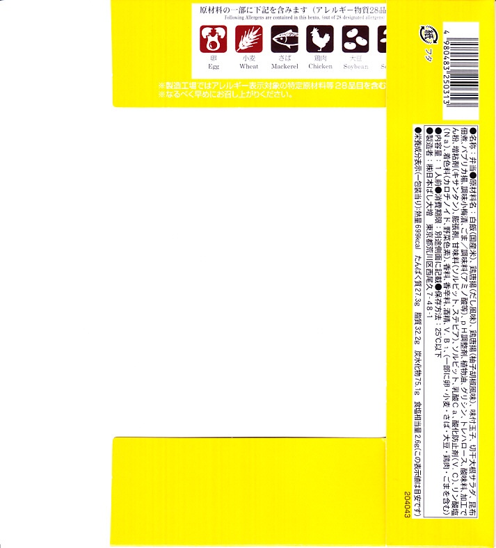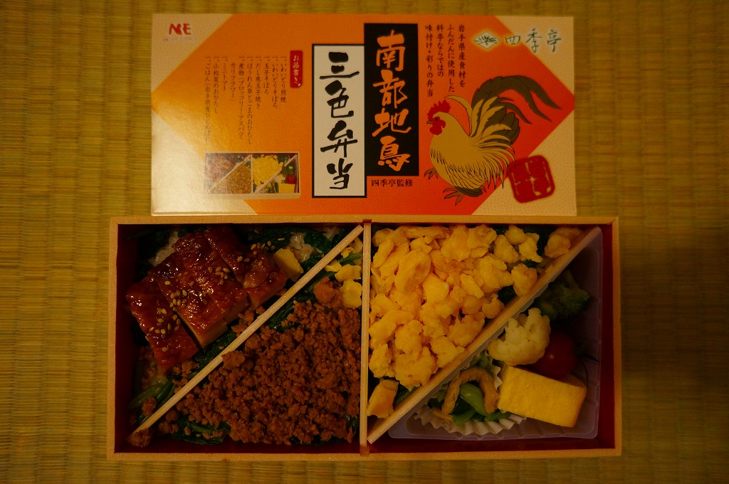下記「三陸海の幸弁当」と同じ容器を、こちらはニワトリと中身写真とおしながきなどを描いたボール紙の枠にはめる。中身は鶏照焼ごはん、鶏そぼろごはん、大粒の玉子そぼろごはん、ホウレンソウのおひたし、玉子焼、ミニトマト、ブロッコリーやカリフラワーなどの煮物など。やはり中身のうち4分の3を御飯が占める。味は常温でしっかりいつものNREだが、高齢者が買ってしまうと意外な分量の多さが厳しいかも。2013年までの販売か。