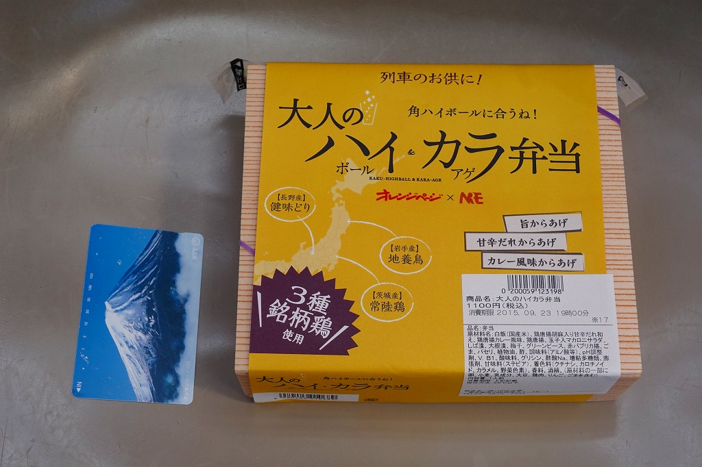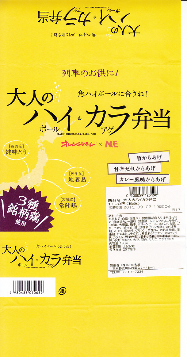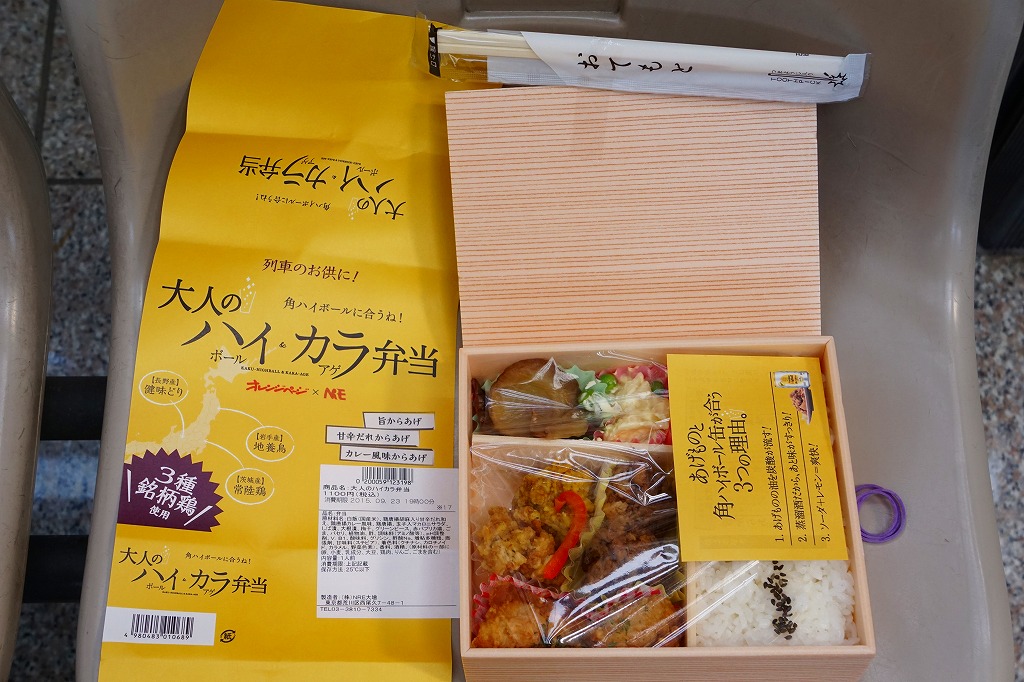 駅弁の名前は「大人のハイボール&カラアゲ弁当」とも。料理雑誌のオレンジページと駅弁屋のNREと、掛紙には記載がないが酒造会社としてのサントリーがタイアップし、2015(平成27)年9月1日から30日まで東京、上野、品川、新宿、大宮の各駅のNRE駅弁売店で販売された期間限定駅弁。この駅弁との同時購入で、サントリーの角ハイボール缶が50円引きになった。