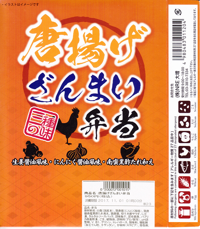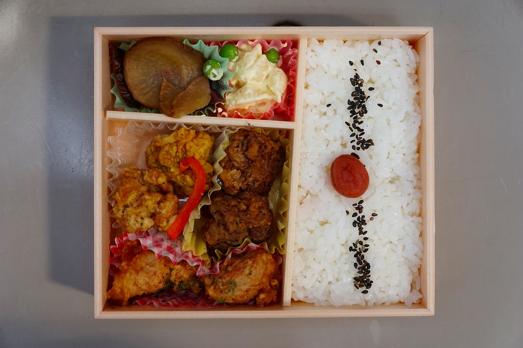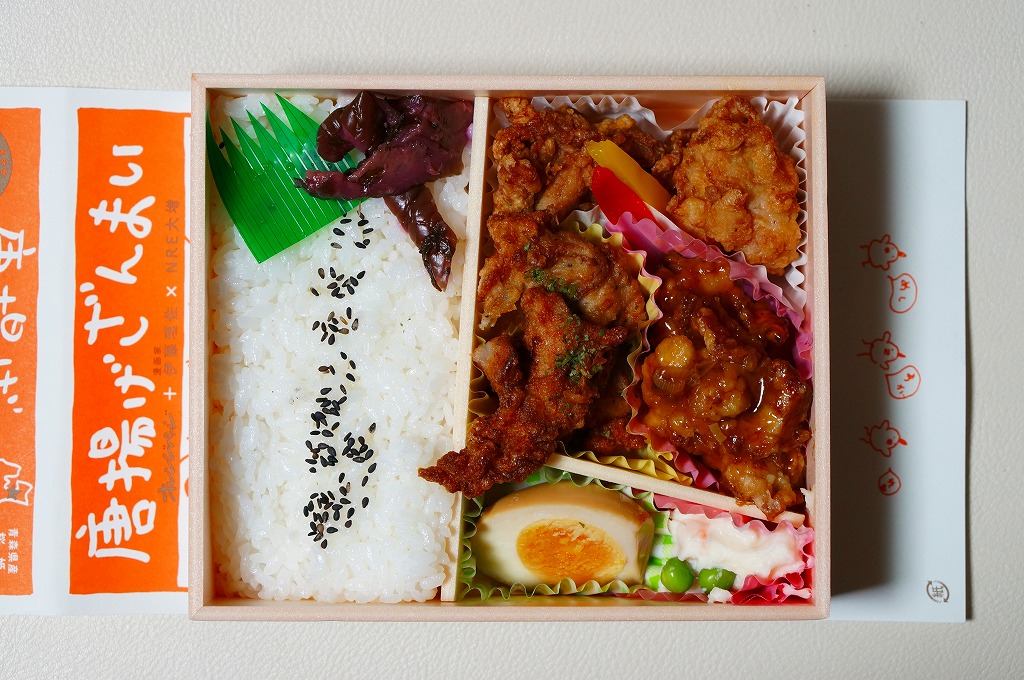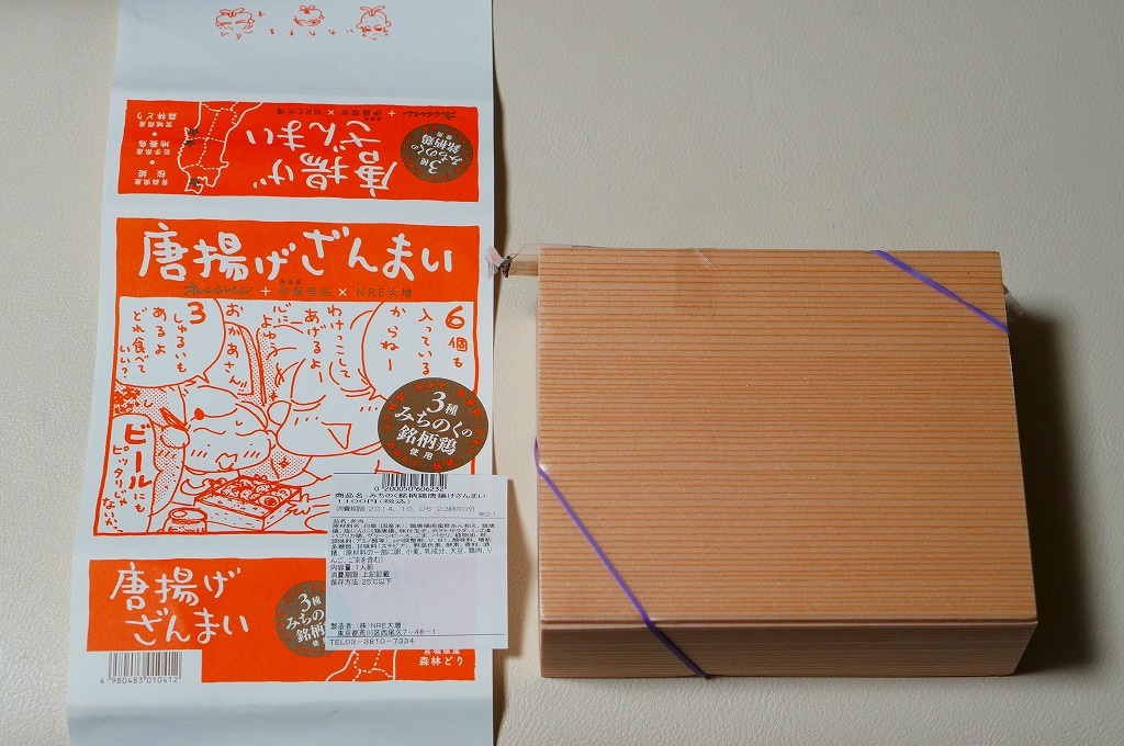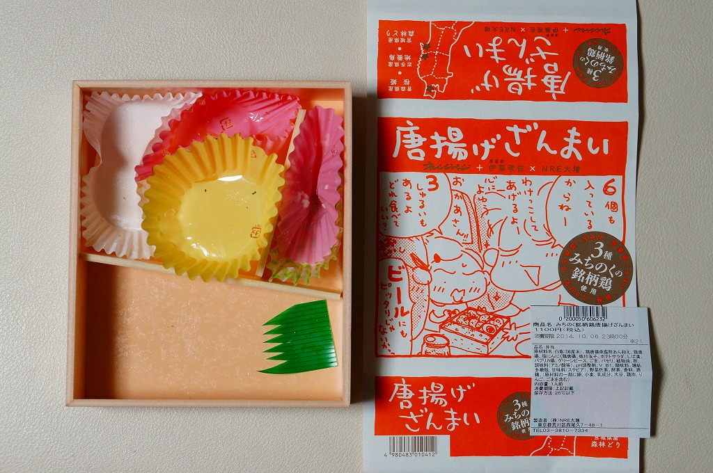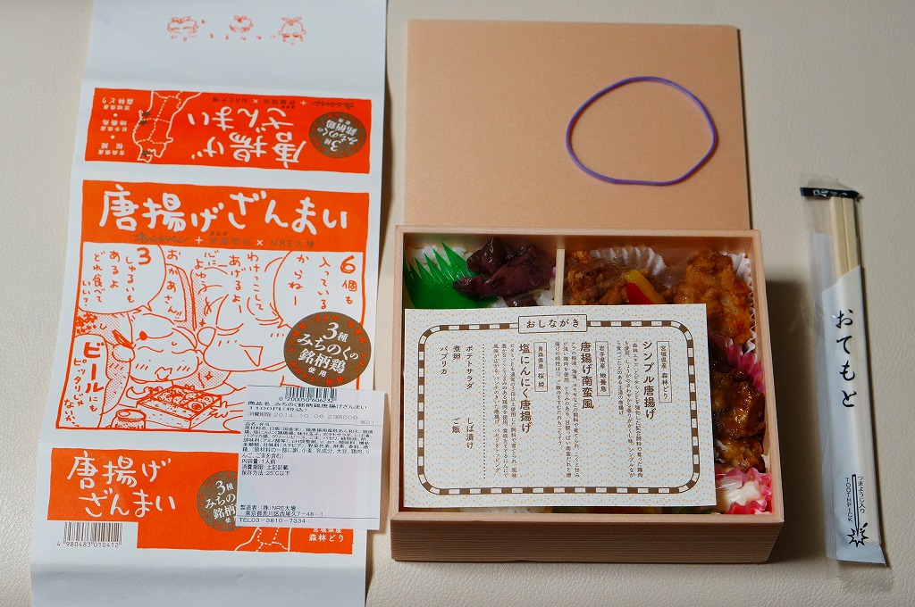 料理雑誌のオレンジページと駅弁屋のNREが、漫画家の伊藤理佐氏のアイデアをもとに開発し、2014(平成26)年10月1日に東京、新宿、品川、上野、大宮の各駅で発売。掛紙のイラストも同氏のもの。中身は白御飯に柴漬けを添え、宮城県産森林どり のシンプル唐揚げ(定番しょうゆ味)、岩手県産地養鳥の唐揚げ南蛮風(甘酢っぱい南蛮風)、青森県産桜姫の塩にんにく唐揚げ(パンチのきいた塩にんにく味)の鶏唐揚を各2個詰め、煮玉子、ポテトサラダ、パプリカを添える。