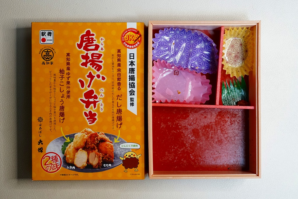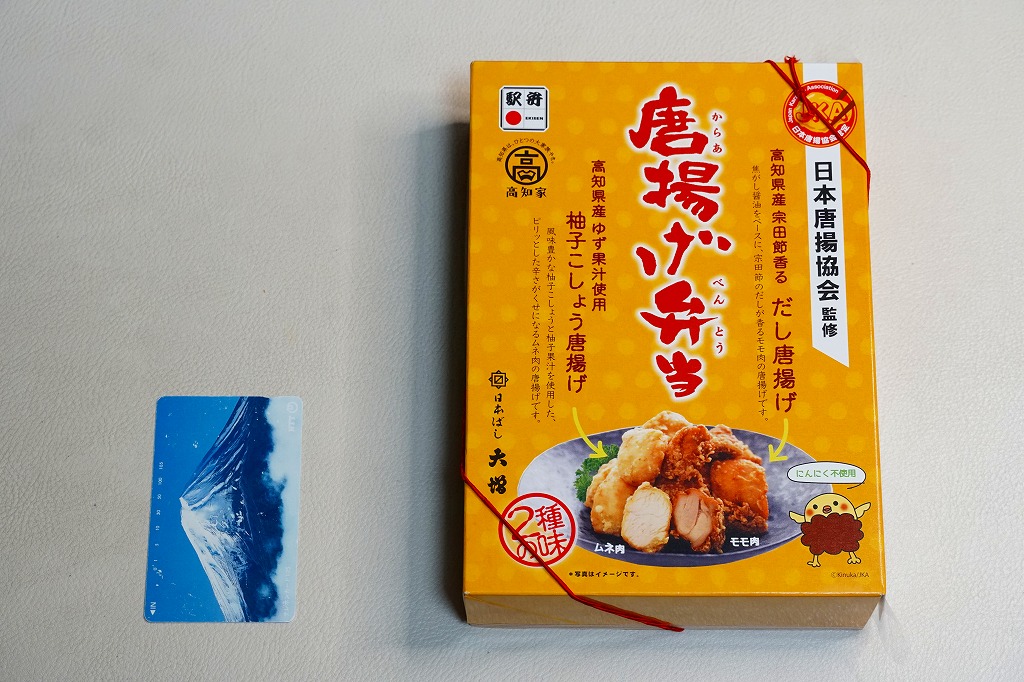 やはり特に宣伝されてはいないが、JKA日本唐揚協会監修という記述とそのキャラクター、高知県庁の公式プロモーション「高知家」のロゴマーク、にんにく不使用といううたい文句も読める。いずれにせよ、東京の駅弁屋で買える、「チキン弁当」でない唐揚げ弁当という位置付けに影響はないと思う。名を体で表す分かりやすい駅弁も、過去に東京駅で売られた下記の唐揚げ駅弁たちに比べて、鶏肉の分量や味のパンチが弱く思えたのは気のせいか。価格は2021年の発売時や購入時で980円、2022年6月から1,000円。