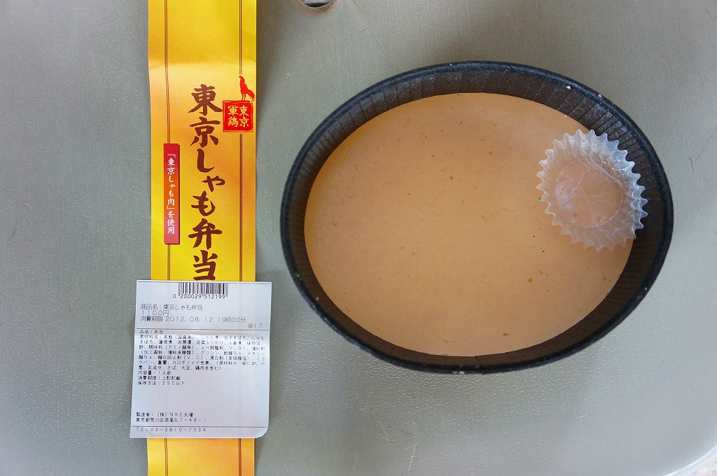 真っ黒な楕円形の容器に茶飯を敷き詰め、シャモ煮と玉子そぼろを敷き詰め、赤カブ漬などを添えるもの。シャモ肉は鶏肉より高級だという先入観をしても、「東京しゃも」の特徴なのか、醤油味がきついからか、水気が多く柔らかい中身に肉の旨味がなく、普通の鶏飯駅弁に対するアドバンテージが感じられなかった。