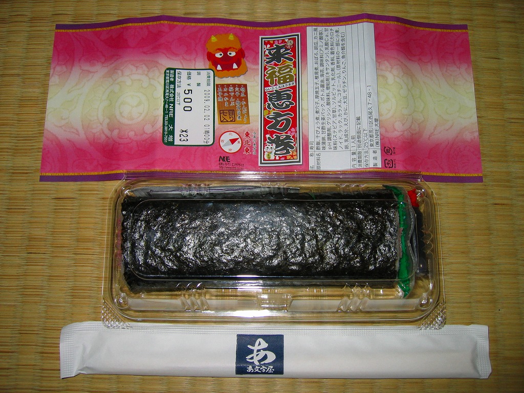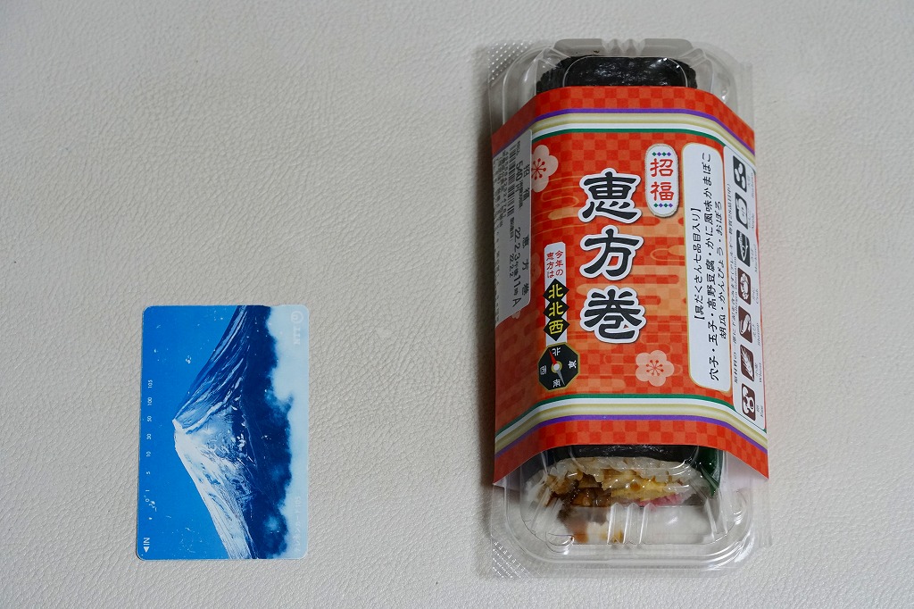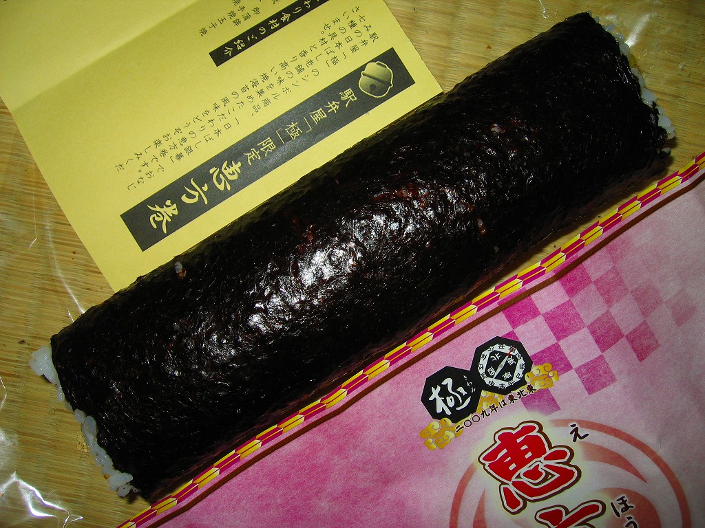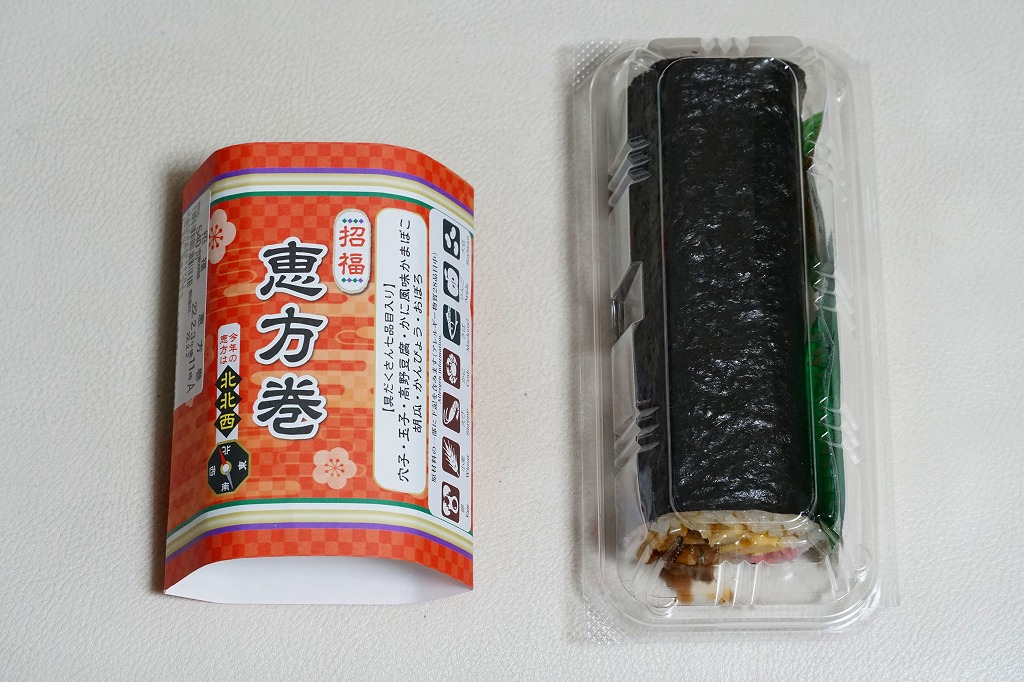 調製元が2006(平成18)年から東京駅などで販売する恵方巻きの駅弁の、2022(令和4)年2月3日のもの。この名前では6年ぶりの販売かもしれない。透明なプラ容器に、太く短い太巻きを1本詰め、掛紙を巻く。太巻きの具は、穴子・玉子・高野豆腐・かに風味かまぼこ・胡瓜(きゅうり)・かんぴょう・おぼろの7品目。恵方巻きの具材は7品目である、それは七福神にちなんだものだと紹介する記事もある。