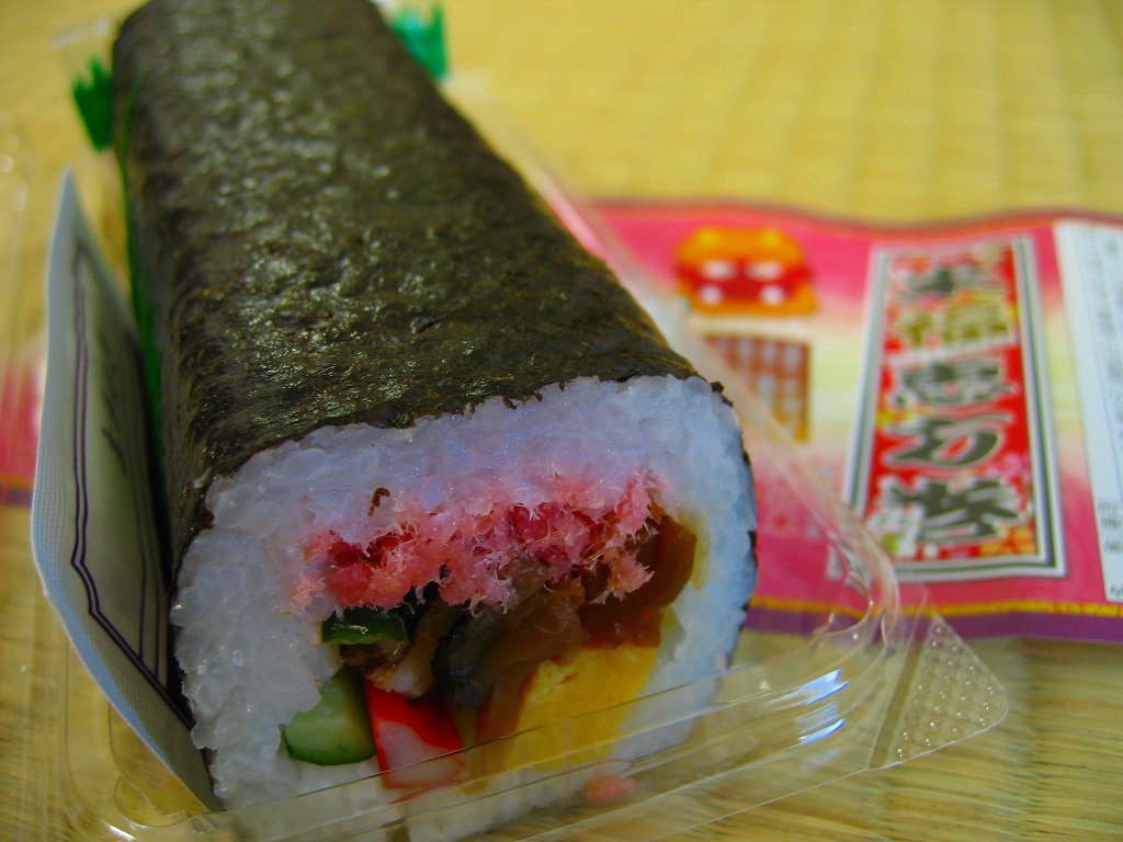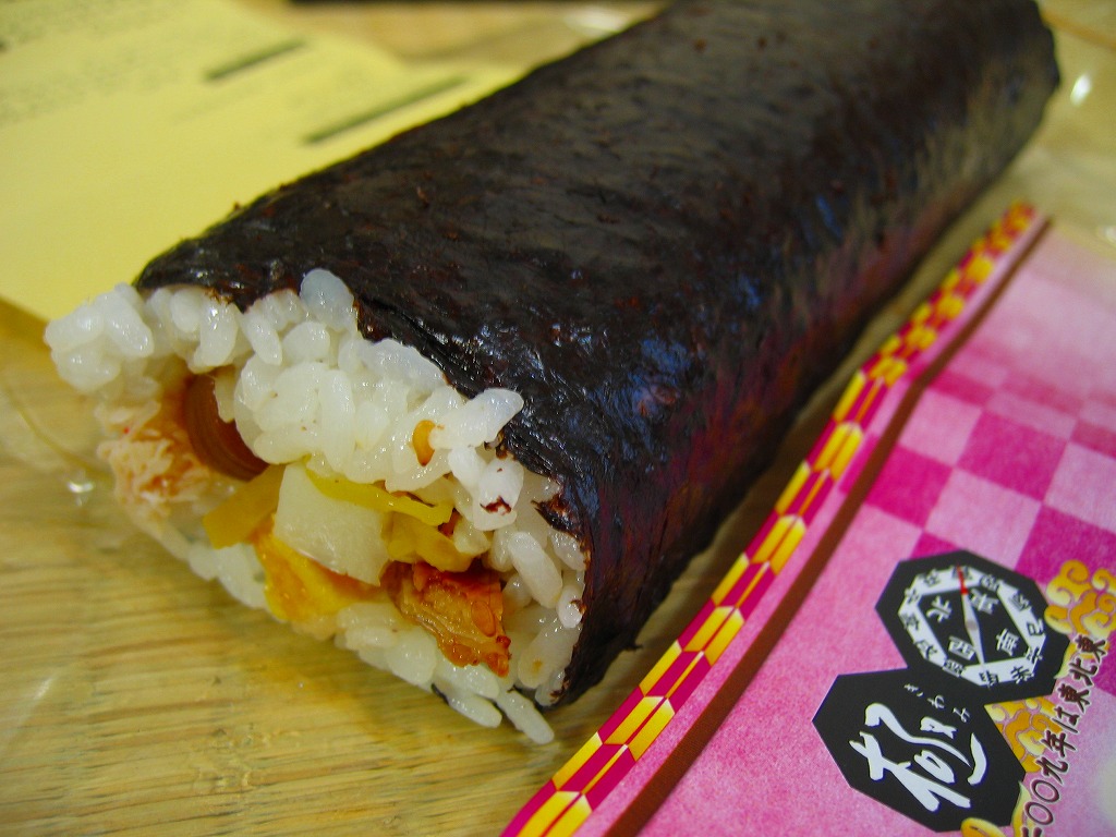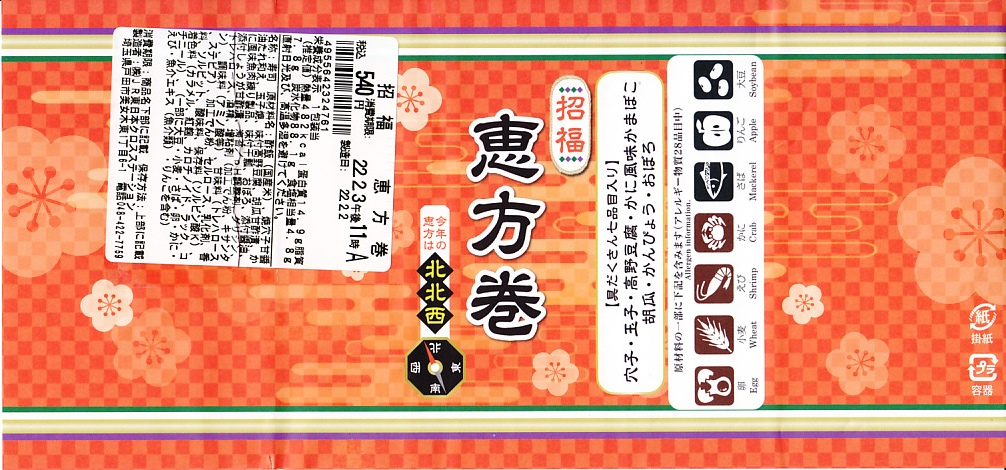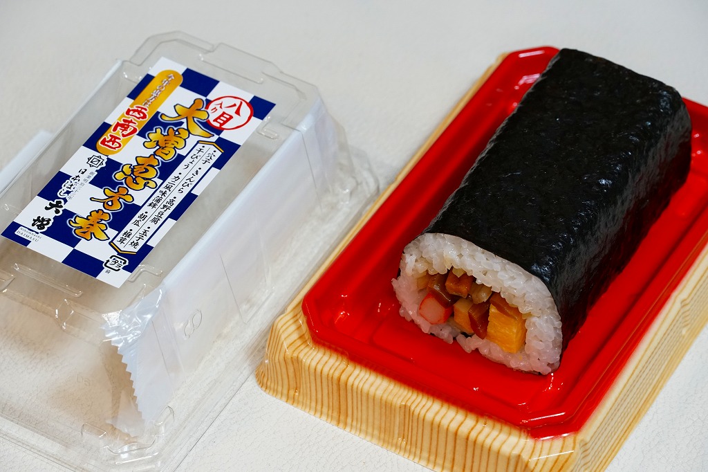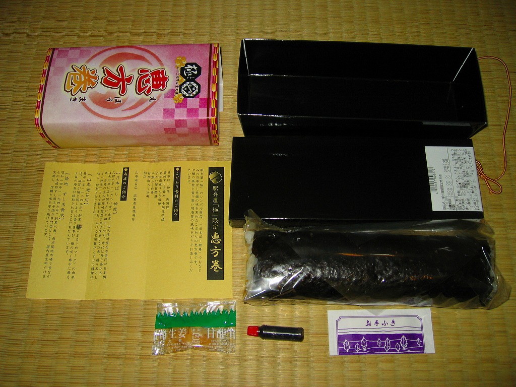 調製元が2006(平成18)年から東京駅などで販売する恵方巻きの駅弁の、2022(令和4)年2月3日のもの。この名前では6年ぶりの販売かもしれない。透明なプラ容器に、太く短い太巻きを1本詰め、掛紙を巻く。太巻きの具は、穴子・玉子・高野豆腐・かに風味かまぼこ・胡瓜(きゅうり)・かんぴょう・おぼろの7品目。恵方巻きの具材は7品目である、それは七福神にちなんだものだと紹介する記事もある。