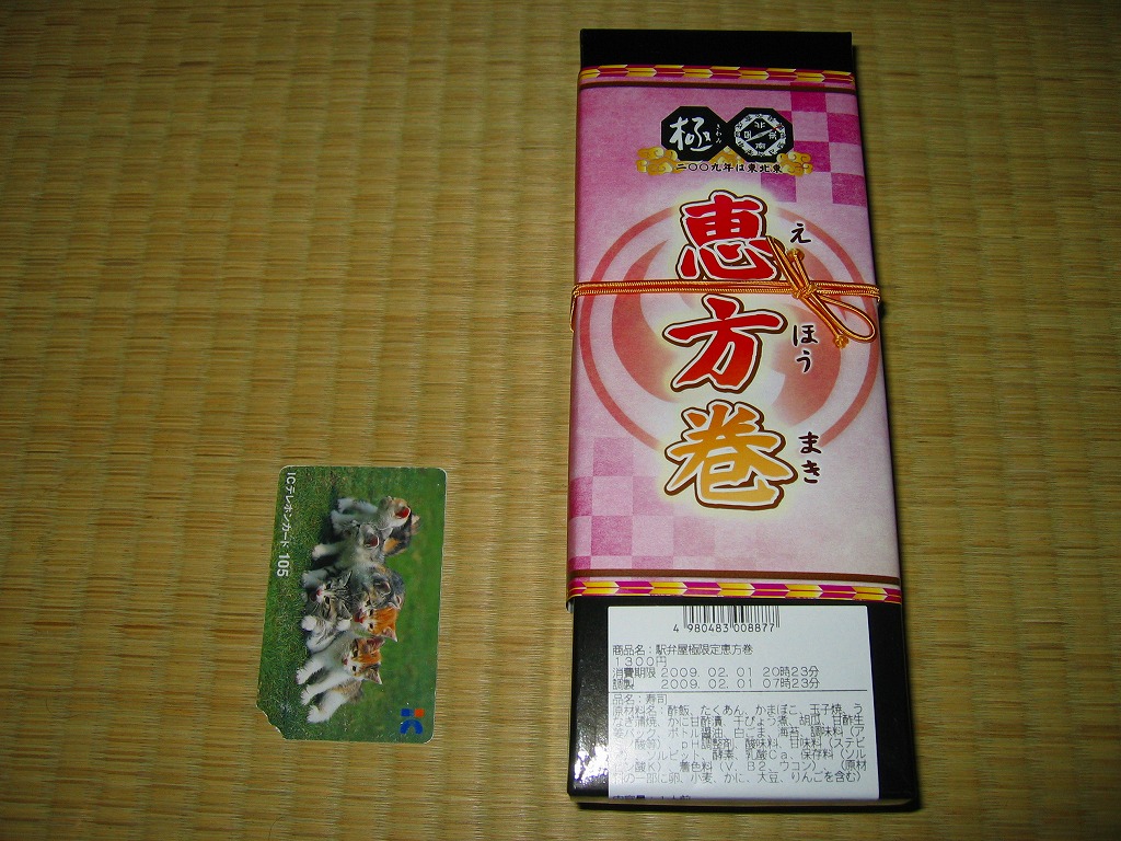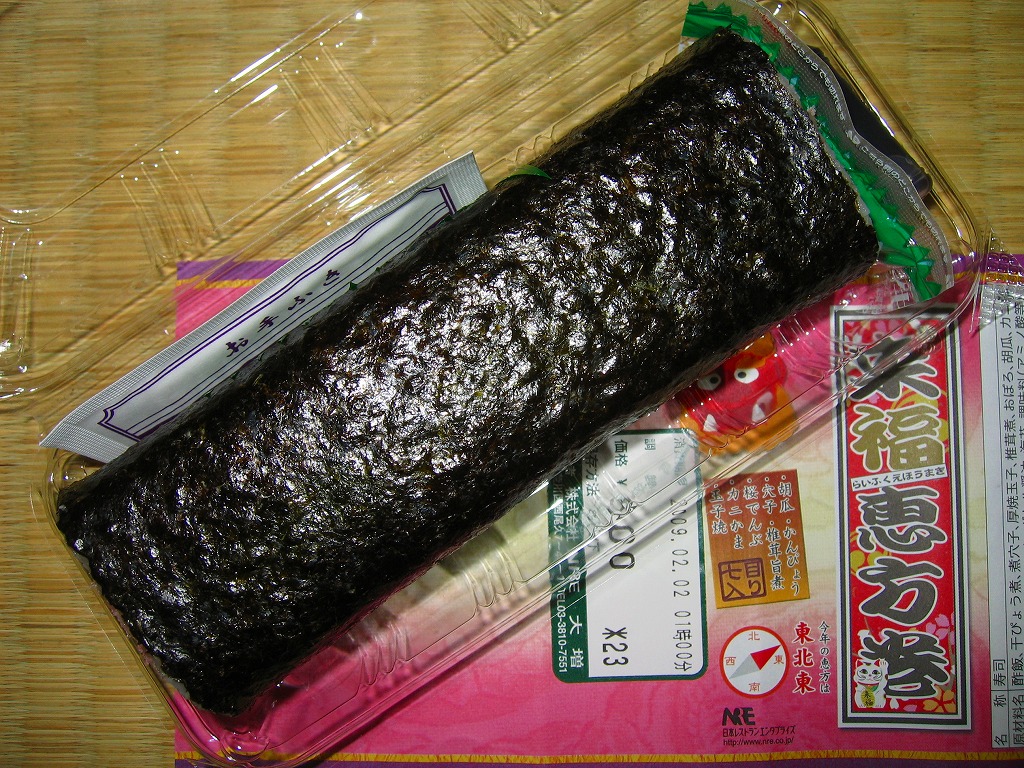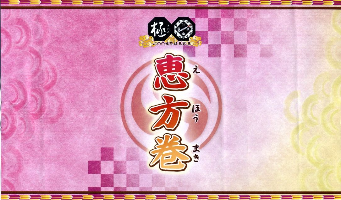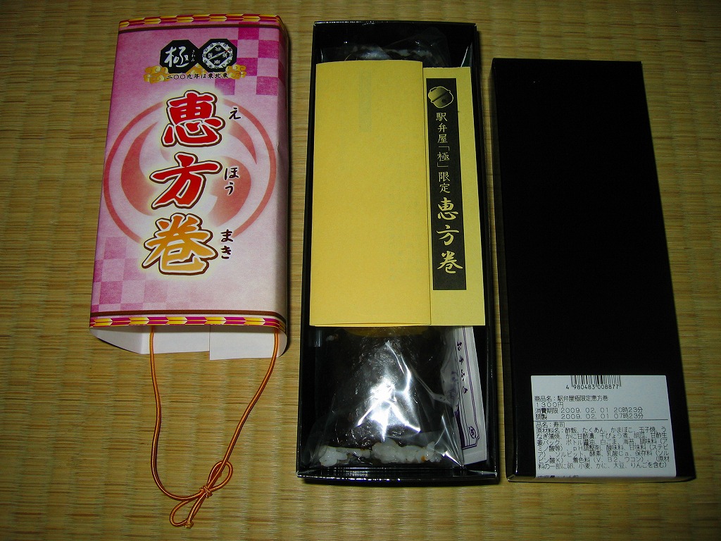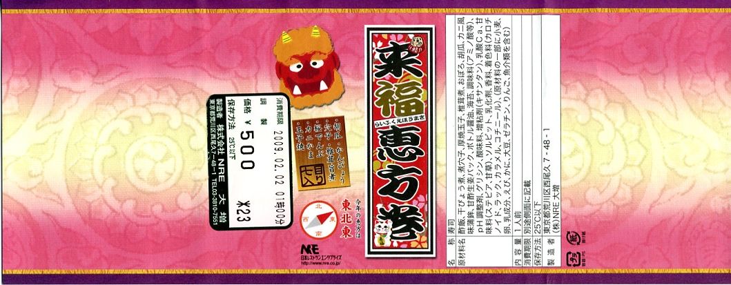 2009(平成21)年2月1日から3日まで東京駅などで販売された、NREの恵方巻駅弁の4年目版。透明なプラ製の惣菜容器に太巻きを1本収め、商品名と具のリストなどを載せた掛紙で巻き、販売時に割りばしを付ける。中身はきゅうり、かんぴょう、アナゴ、椎茸うま煮、桜でんぶ、カニ蒲鉾、玉子焼を酢飯と海苔で巻いた太巻き寿司。