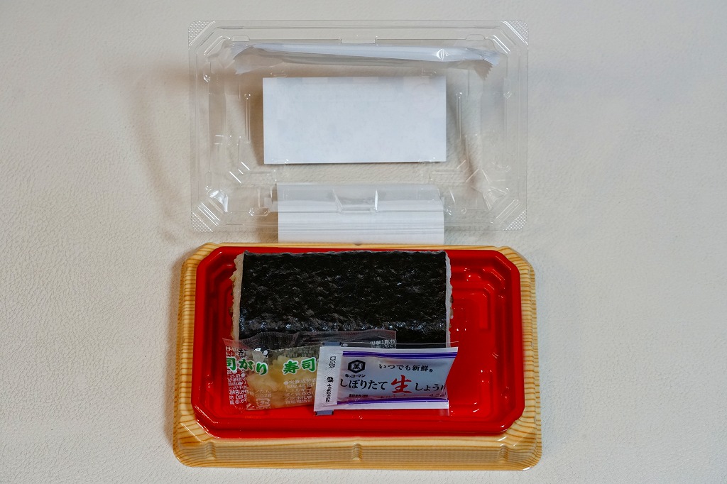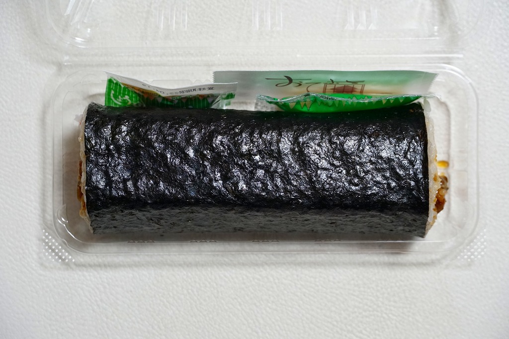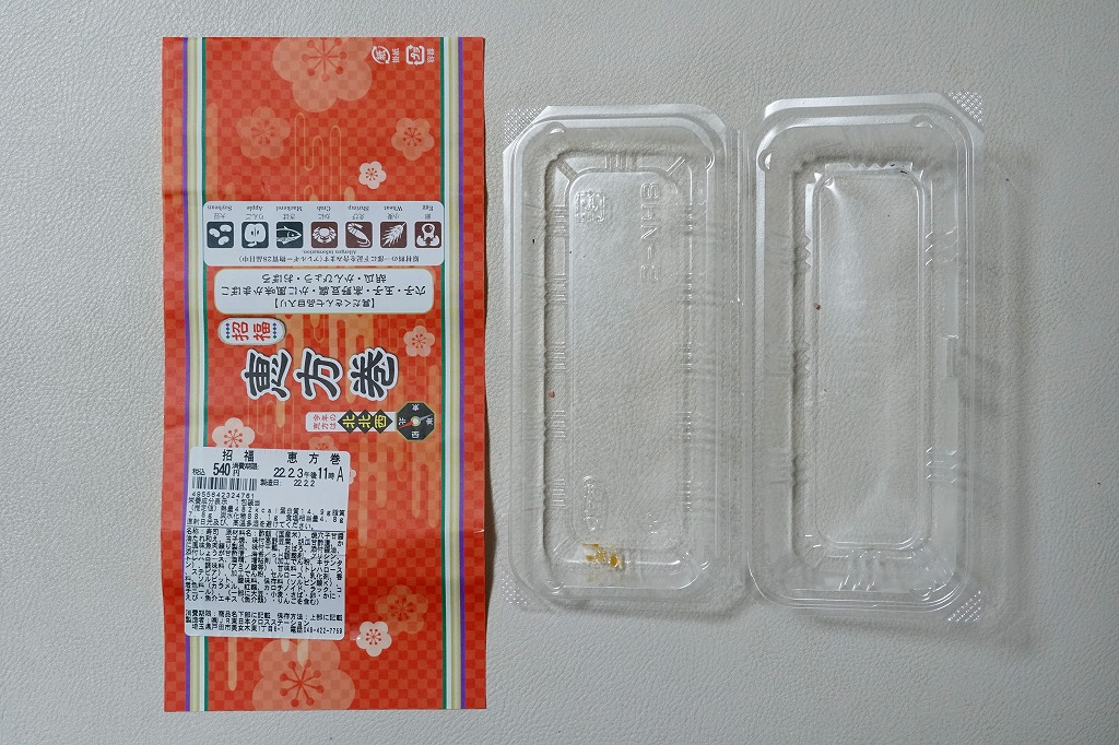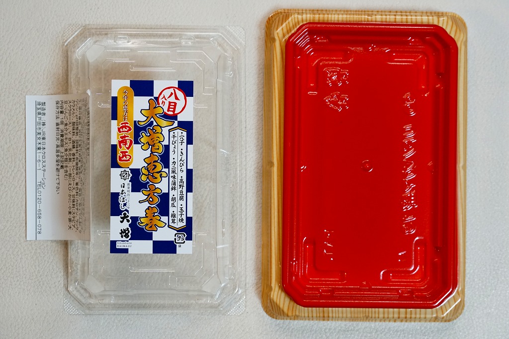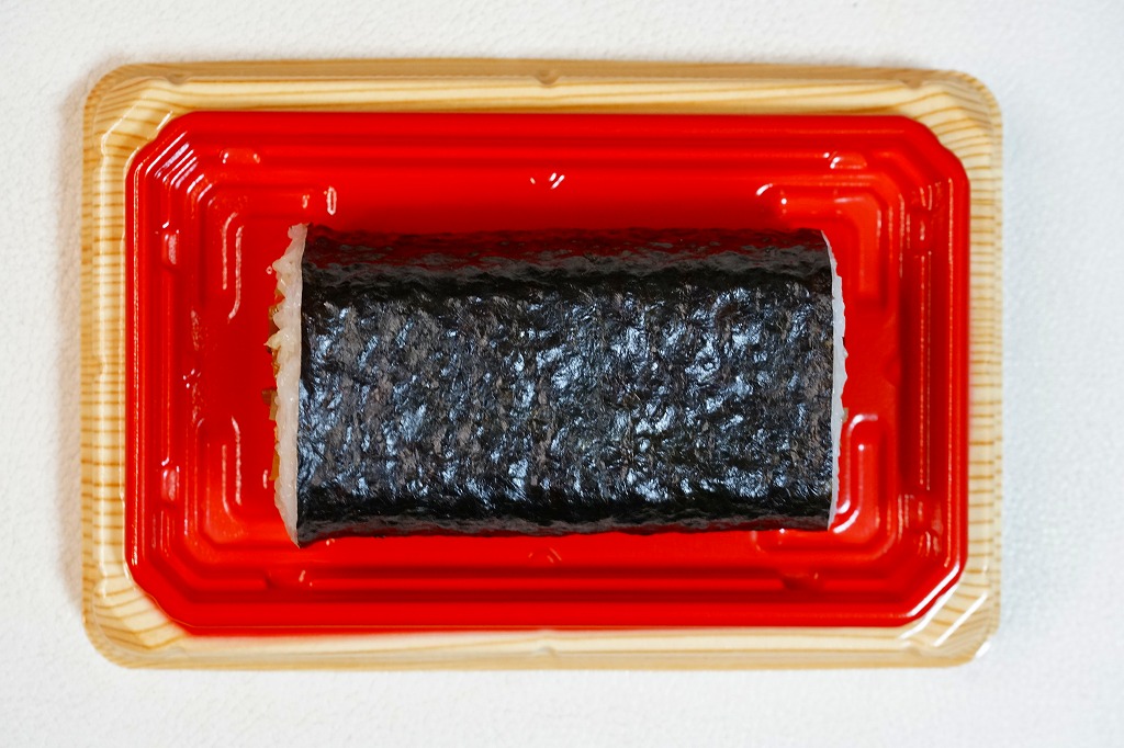 玉子焼、かに風味かまぼこ、きんぴらごぼう、しいたけ、きゅうり、高野豆腐、かんぴょう、焼あなごを酢飯と海苔で巻いた、短く細身の太巻きを1個、醤油とガリの袋とともにプラ製トレーに収め、商品名と食品表示のシールを貼る。下記の2022年のものと比べて、長さが3分の2くらいになり、価格は2割以上上がった。同時に販売の「大船軒の恵方巻」と、食べた味を含めてほぼ差異がないと感じた。