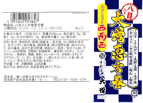 調製元が2006(平成18)年から東京駅などで販売する恵方巻きの駅弁について、2025(令和7)年の節分の前日の、2月1日に買えたもの。駅の売店で買える駅弁屋の商品ではあるが、2023年4月までのJR東日本管内における旧日本食堂と旧鉄道弘済会と大船軒と日本ばし大増などの大合併後は、駅弁の内容や体裁がなくなり、デパ地下やスーパーやコンビニで売られるようなものと変わらない姿になっている。