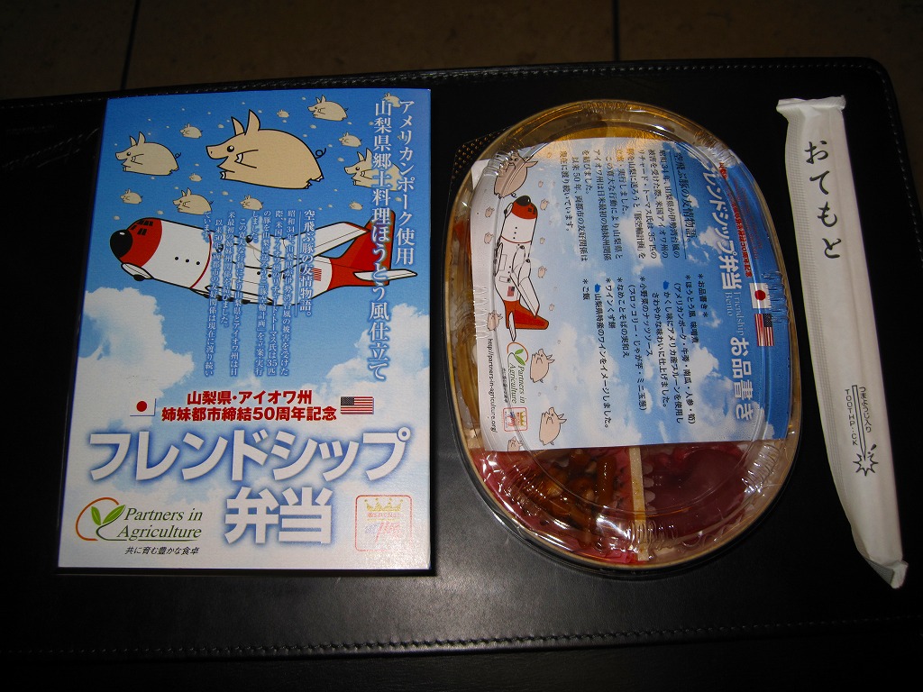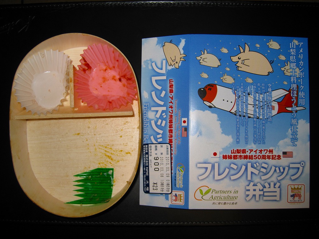 しかしなぜ伊勢湾台風でなぜ山梨県になぜアイオワがなぜ豚を贈ったのか、なぜ山梨県内の駅弁ではなくNRE東京エリアの駅弁なのか、飛行機柄でフレンドシップと来たらフォッカーF27では、など、実物を見ても食べてもさっぱり分からないところ。