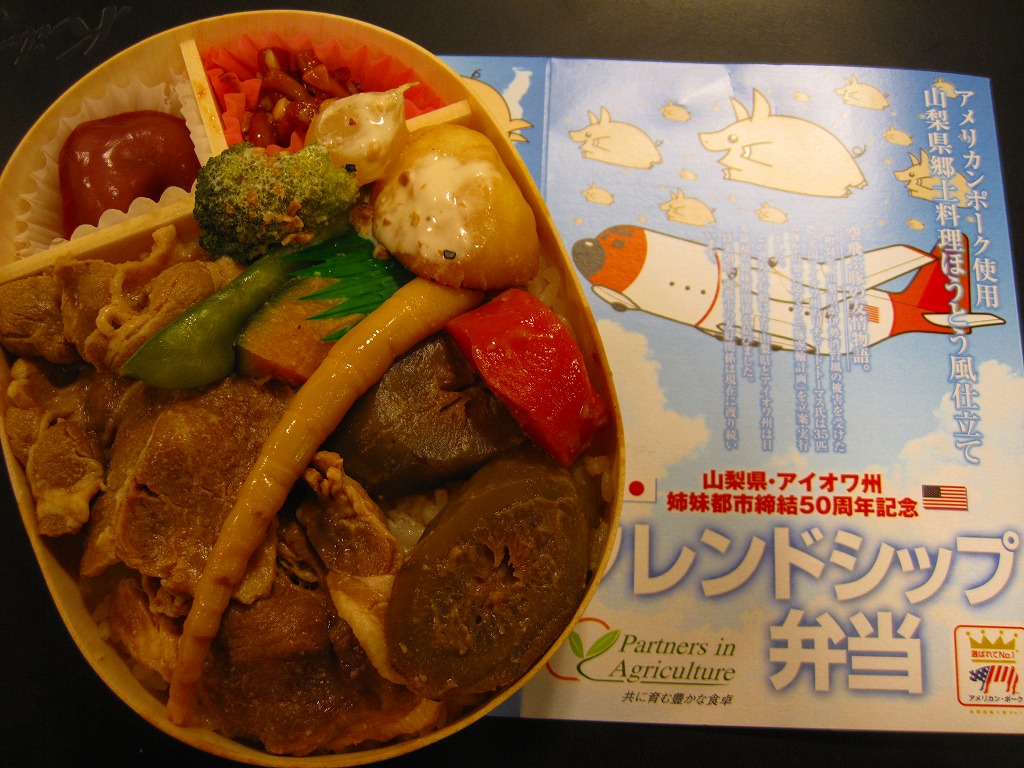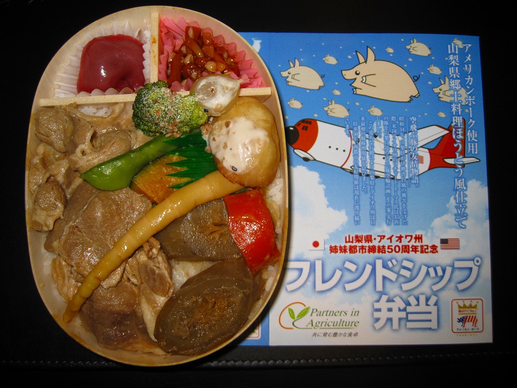 これは山梨県とアイオワ州の姉妹都市締結50周年記念として、アメリカンポークを使い山梨県の郷土料理であるほうとう風の弁当にしたもの。1959(昭和34)年に山梨県が伊勢湾台風の被害を受けた際、アメリカ・アイオワ州から35匹の豚が航空輸送で贈られたことから、両者が姉妹州関係を結んだと、パッケージとお品書きで紹介される。