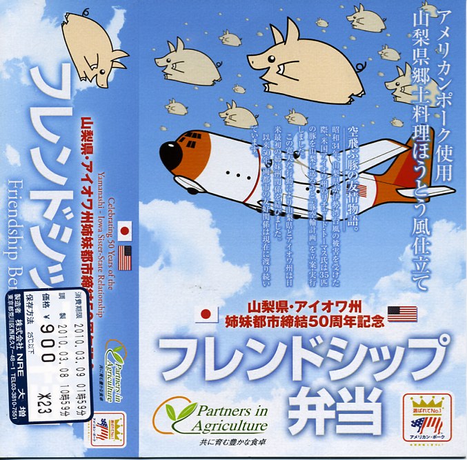 あるいは山梨県「山梨・アイオワ友好交流レシピコンテスト募集」の優秀作の商品化なのだろうか。この駅弁にはアメリカ大使館の後援が付いているそうで、在日アメリカ大使館の首席公使であるジム・ズムワルト氏が2010年4月6日に公式ブログで収穫報告を行っている。