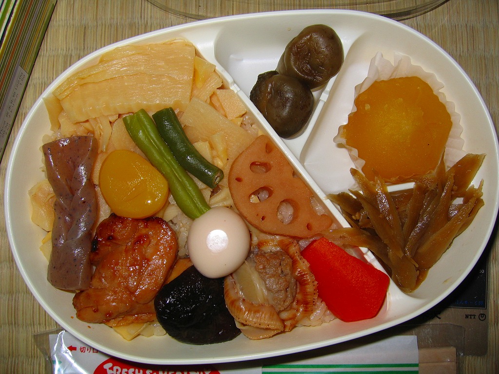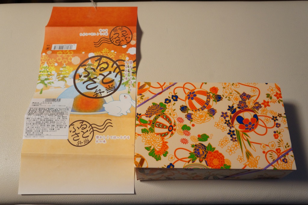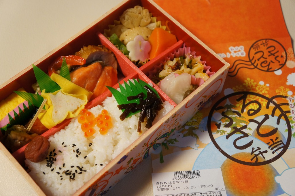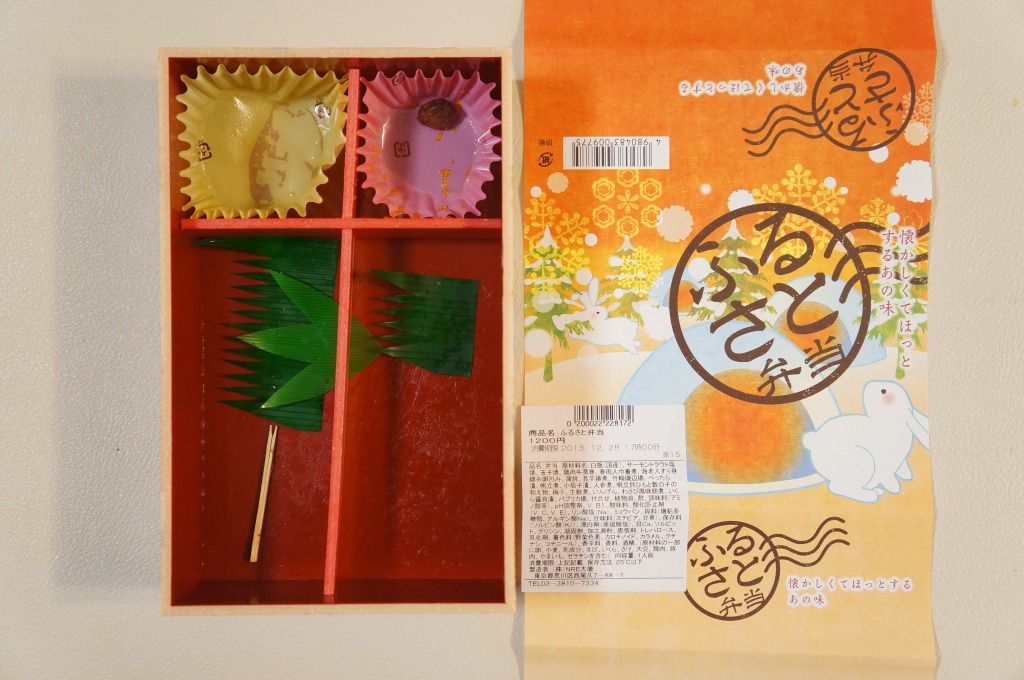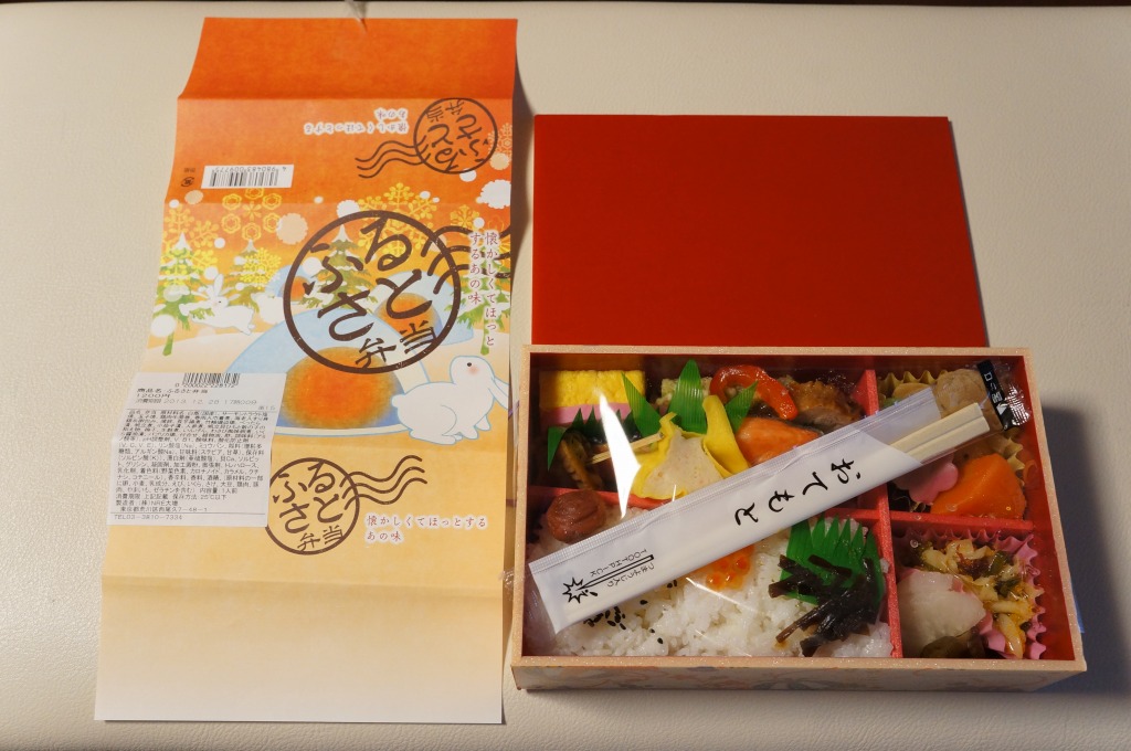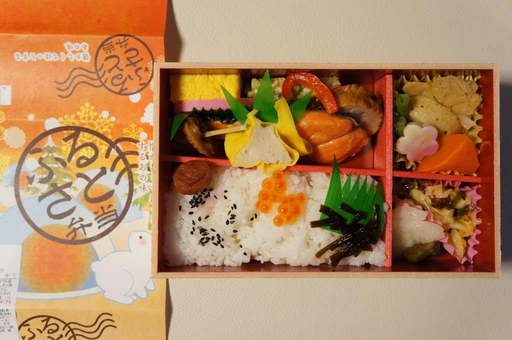 梅干しとイクラとコンブ佃煮を添えた白御飯、サケ類塩焼、かまぼこ、玉子焼、鶏ごぼう巻、海老すり身、春雨きんちゃく、ニンジンやナガイモなどの煮物、帆立貝ひもとカズノコなどの和え物、小茄子漬など。季節の高級駅弁と同じような掛紙と容器と内容と風味を感じる。ふるさとが何か分からなくても、帰省の新幹線での食事に合いそう。