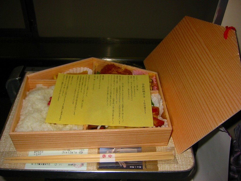 2004(平成16)年1月16日から3月10日まで東京都内各駅で発売された、NRE史上初の受験生応援駅弁。絵馬札型の五角形の容器に掛紙をかけて紅白のひもでしばる。中身は試験に勝つトンカツ、明るい未来が見通せるレンコン、学習能力を上げるDHAが含まれる鯖照焼、「大学」芋、脳を動かす糖質を含む白御飯の上にはサクラサク桜花一輪を添えるなど、つまり普通の幕の内弁当な中身をネタに能書きを垂れて、受験生の体調に気遣い、かつ縁起をかついだとしている。