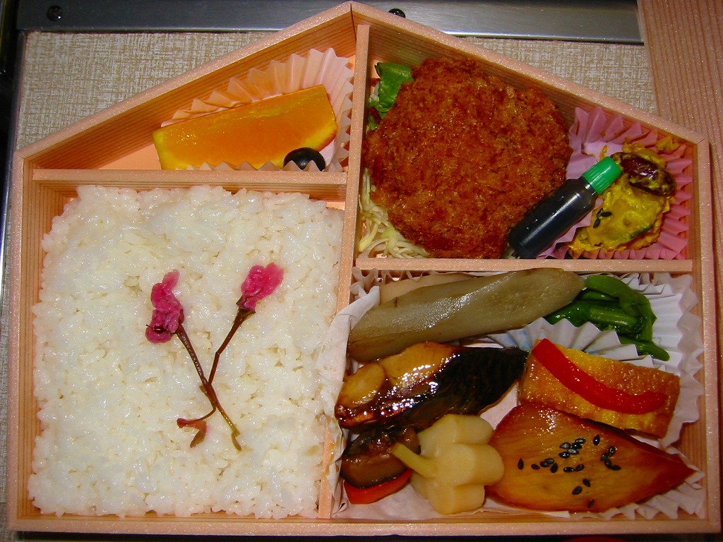 2010(平成22)年の3月から5月頃までの販売か。薄い木と紙の楕円形の容器にお品書きを載せて透明なふたをして、豚と飛行機が青空を飛んでいるボール紙の枠にはめる。中身は白御飯の上を豚肉の味噌煮、ジャガイモ、カボチャ、ゴボウ、ニンジン、絹さやなどで覆い、ブロッコリーとタマネギを添え、なめことそばの実和えとワインくずもちを付けるもの。豚を除き、アンチファンから駅弁はこれだからと非難されそうな、非常に濃い味付けだった。