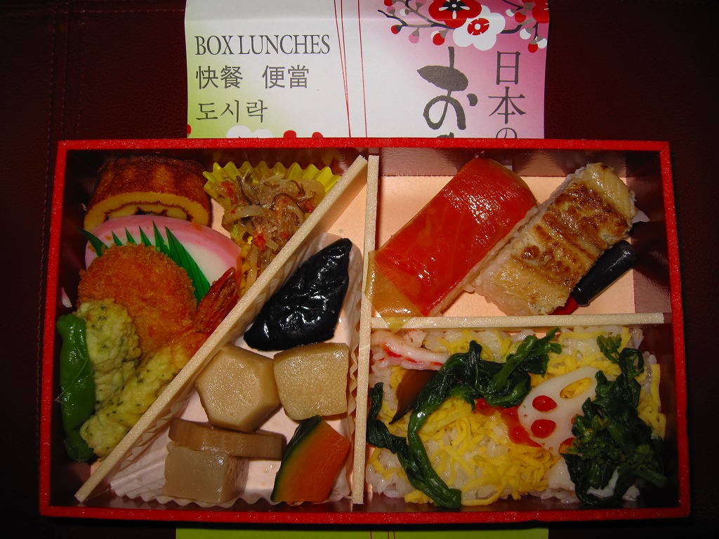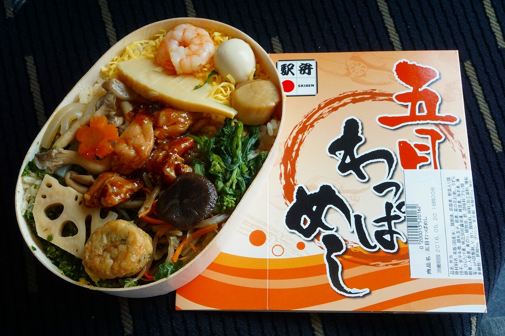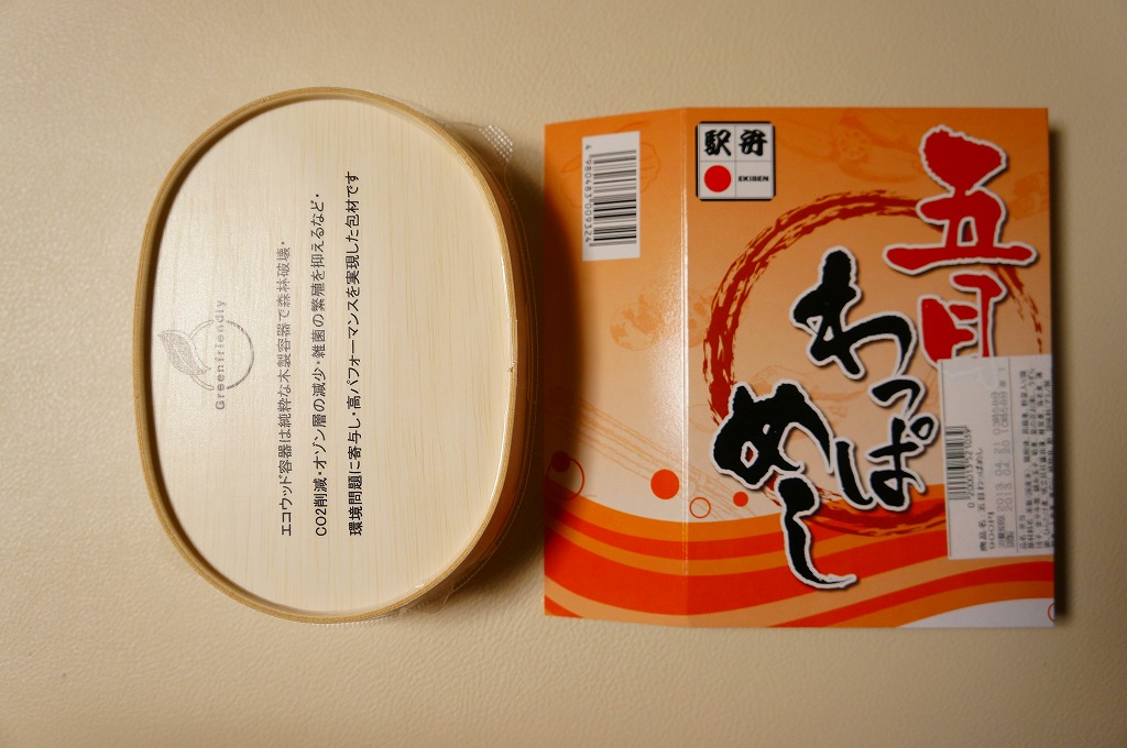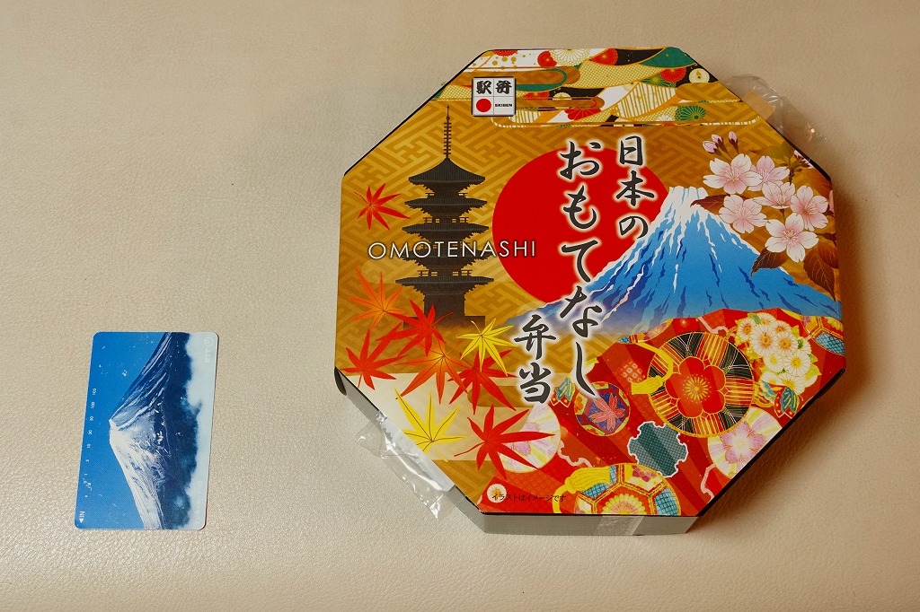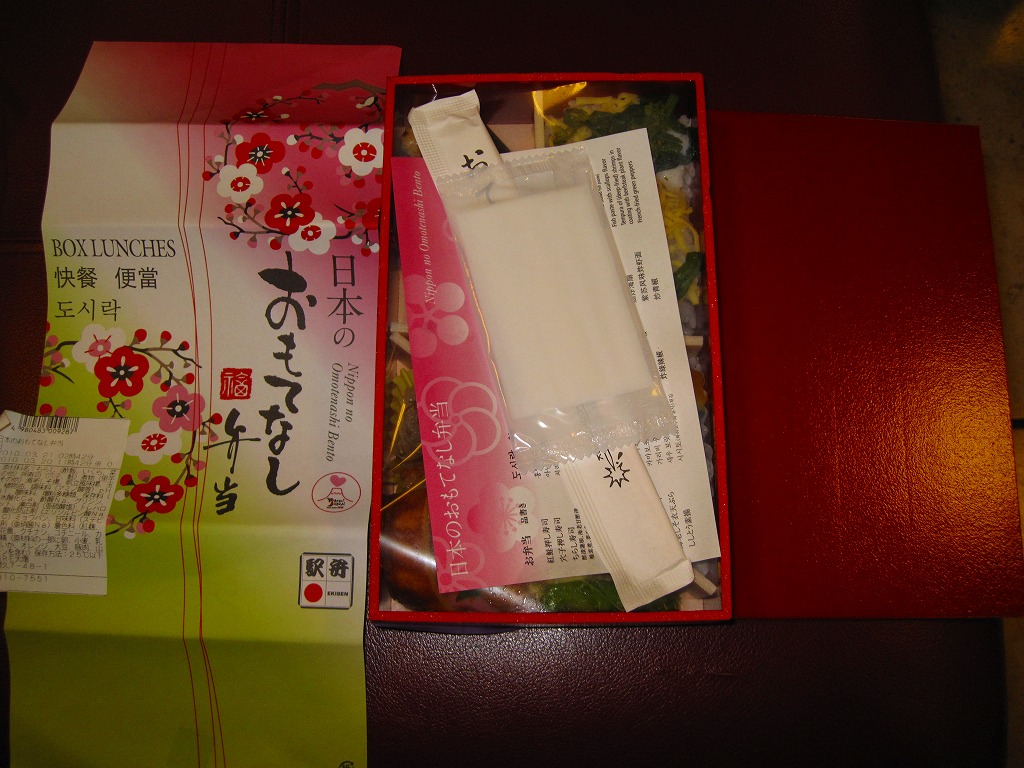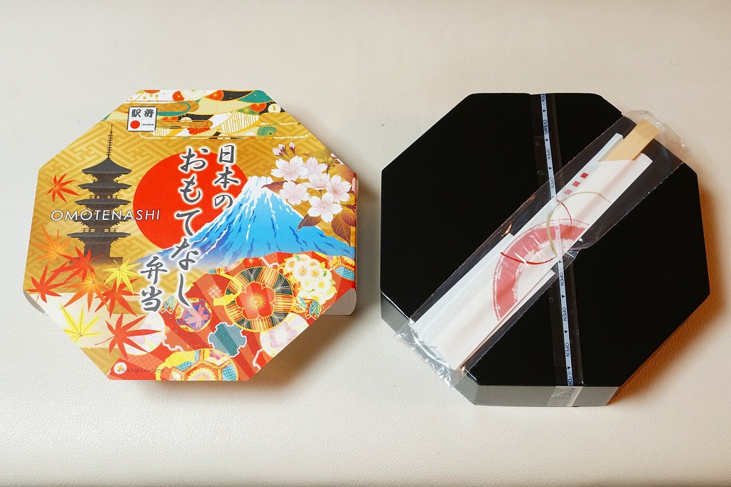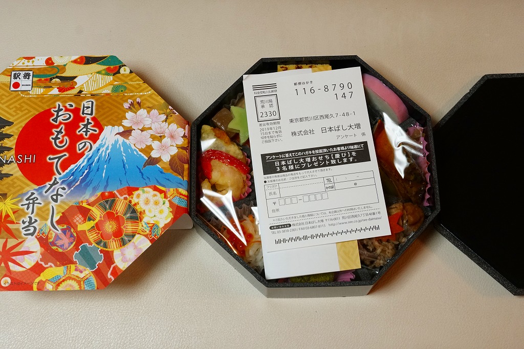中身はベニマス押寿司とアナゴ押寿司、カニやイクラやレンコンなどのちらしずし、サトイモやタケノコやカボチャなどの煮物、エビフライとホタテフライ、海老しそ天ぷら、ししとう、伊達巻、かまぼこなど。これが日本語、ハングル、繁体中国語、簡体中国語、英語の5か国語によるお品書きで記され、掛紙にもそれぞれの言葉で「弁当」と書かれる。分量は少なく、味付けはほどほど、価格は高く思うが、駅弁の名前のコンセプトは強く感じる。発売期間は延長されている模様。