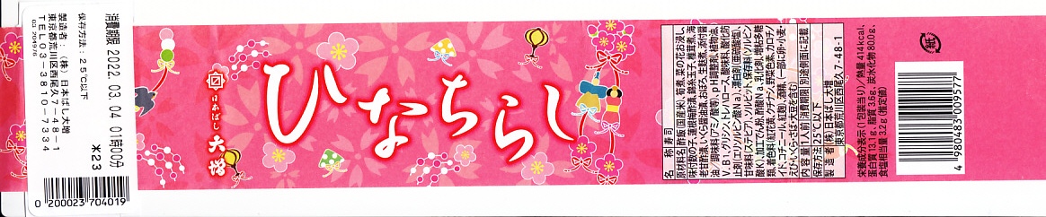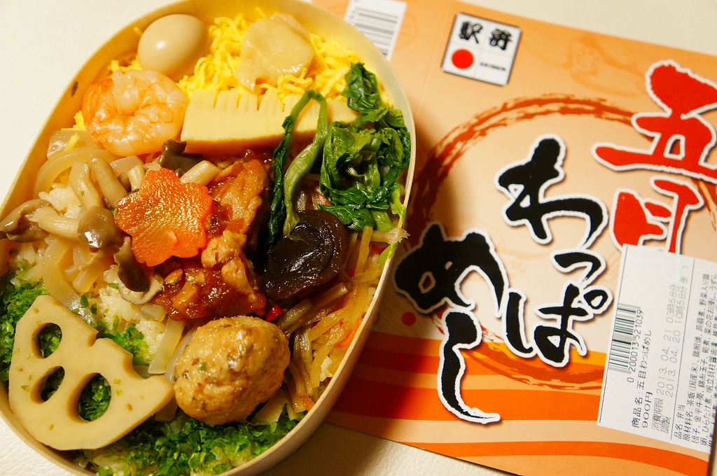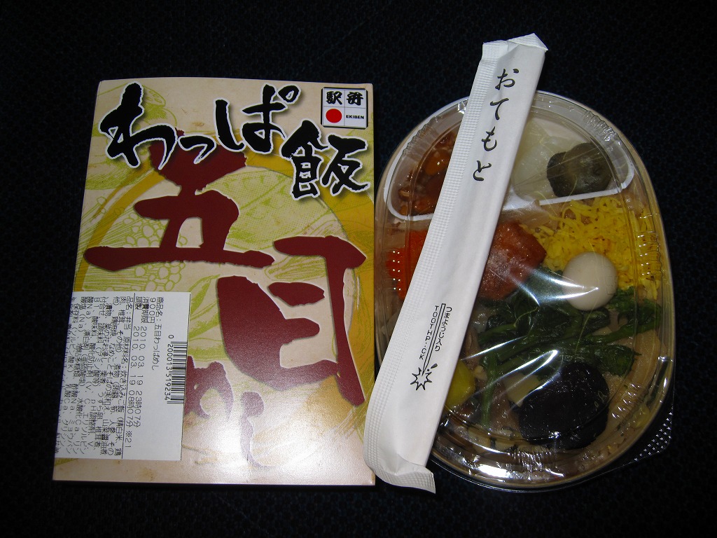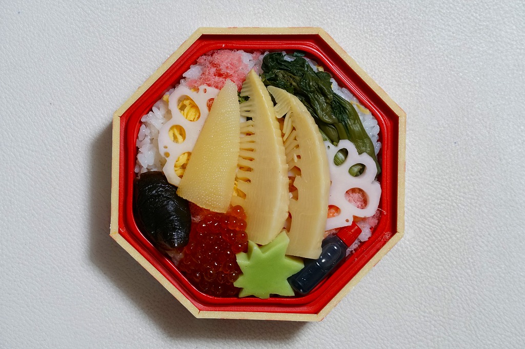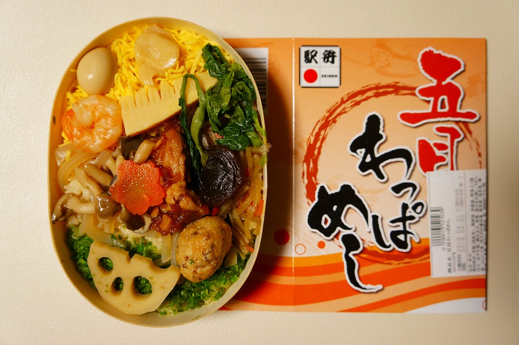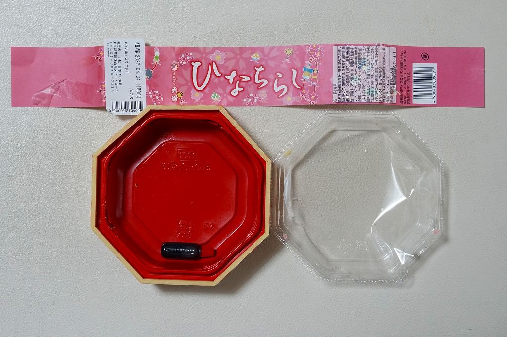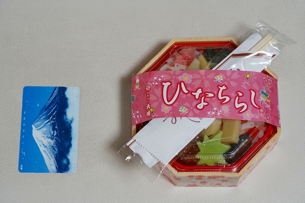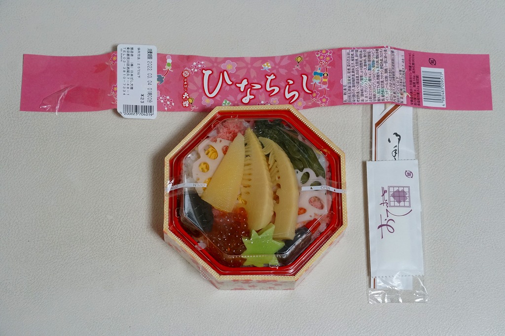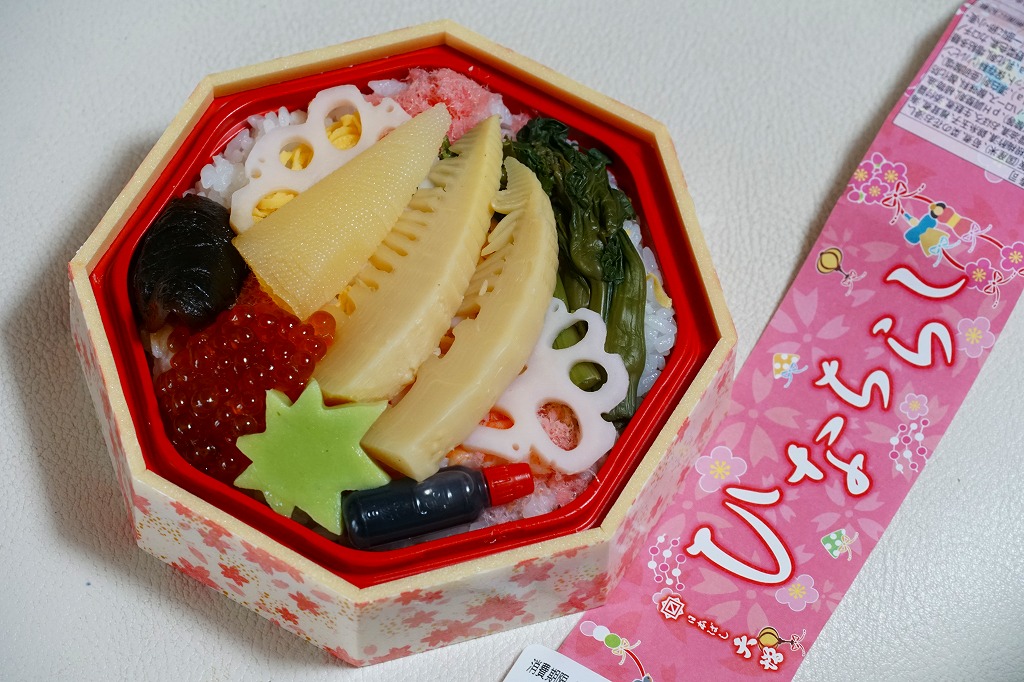 2012(平成24)年かそれ以前から、毎年3月3日あるいは年によってはその前後に、東京駅などで売られる駅弁。今は日本ばし大増ブランドでデパ地下などで売られる弁当かもしれない。今回の2022(令和4)年版は、商品名や雛祭りの絵柄を使う紙帯を巻いた、浅く小柄な正八角形の容器に、酢飯を詰め、タケノコ、菜の花、カズノコ、れんこん、錦糸卵、しいたけ、エビ、イクラ、おぼろ、お麩で覆った。少量で高価な気もするが、駅弁売店に季節感をもたらす存在のひとつである。