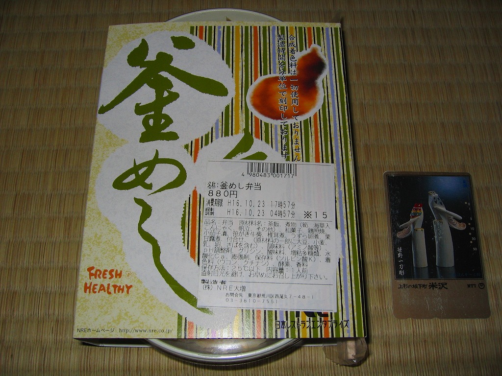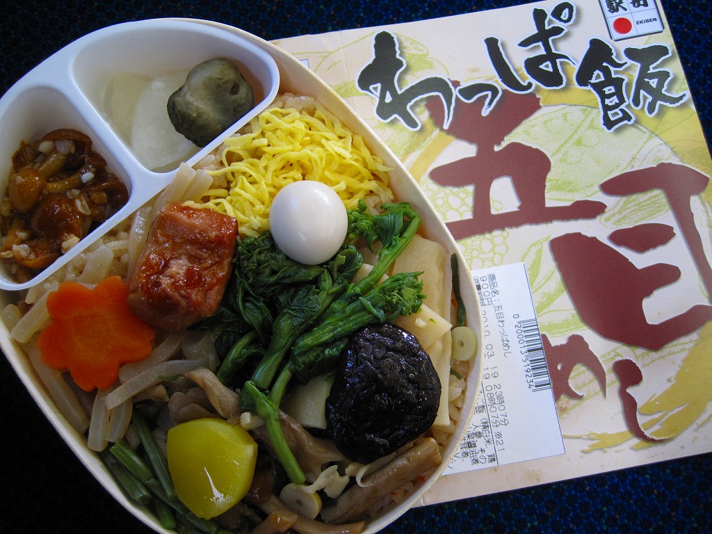 下記の駅弁「釜めし弁当」や「わっぱ飯五目めし」の、2013(平成25)年時点での姿。山菜となめこと漬物が消え、付合せのトレーもなくなっているが、趣旨と風味は変わらない。もっとも、パッケージ上での駅弁の名前が「わっぱ飯五目めし」と読めた頃でも、公式な商品名はこれと同じく「五目わっぱめし」であった。価格は2013年の購入時で900円、2014年時点で950円。2020年で終売か。