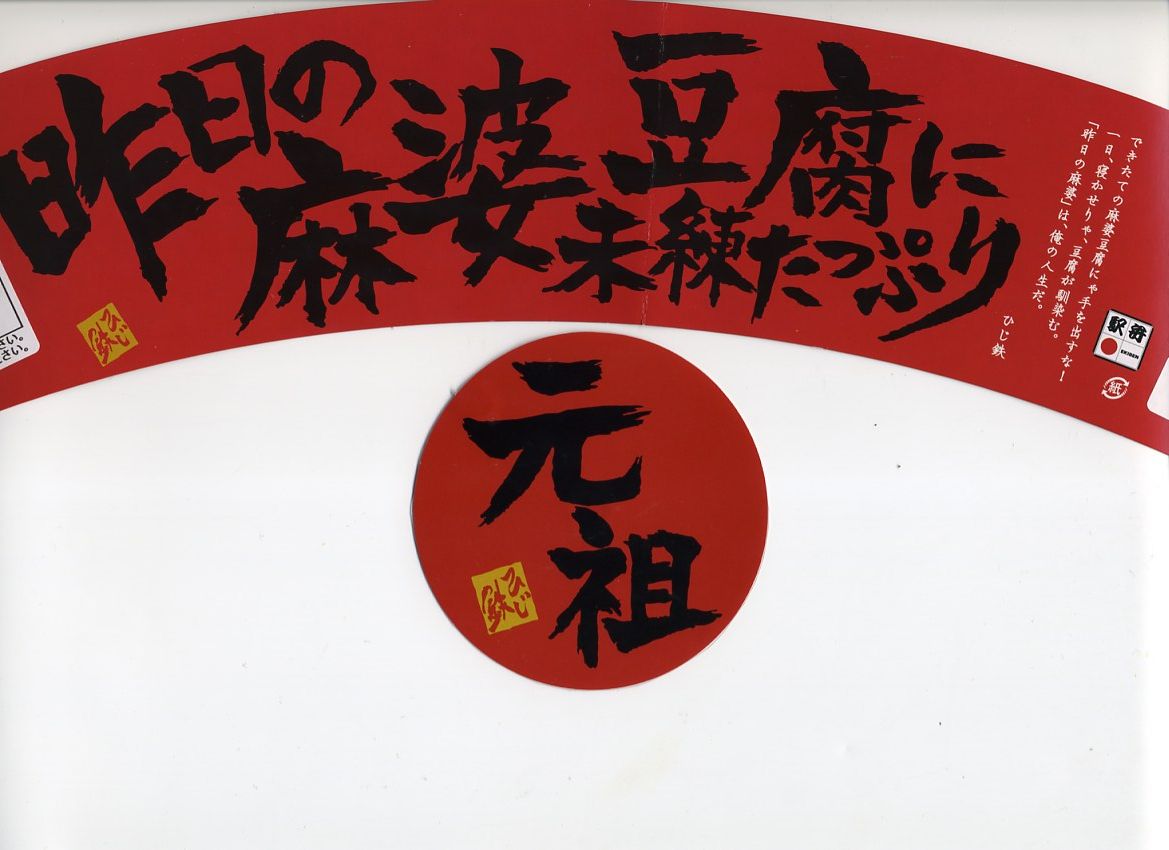 NREとジェイアール東日本企画との共同開発により、2010(平成22)年2月11日に発売。赤い柄の紙製カップに「元祖」と書いた赤いシールを貼る透明なふたをする。中身は下段が白御飯、ふたと一体になったトレーに入る上段が麻婆豆腐。具は豆腐たっぷり、味は食べると甘く、あとから刺激が湧いてくる四川風。麻婆豆腐の駅弁など、常温でこれだけやる麻婆豆腐など、過去にあったかどうか。