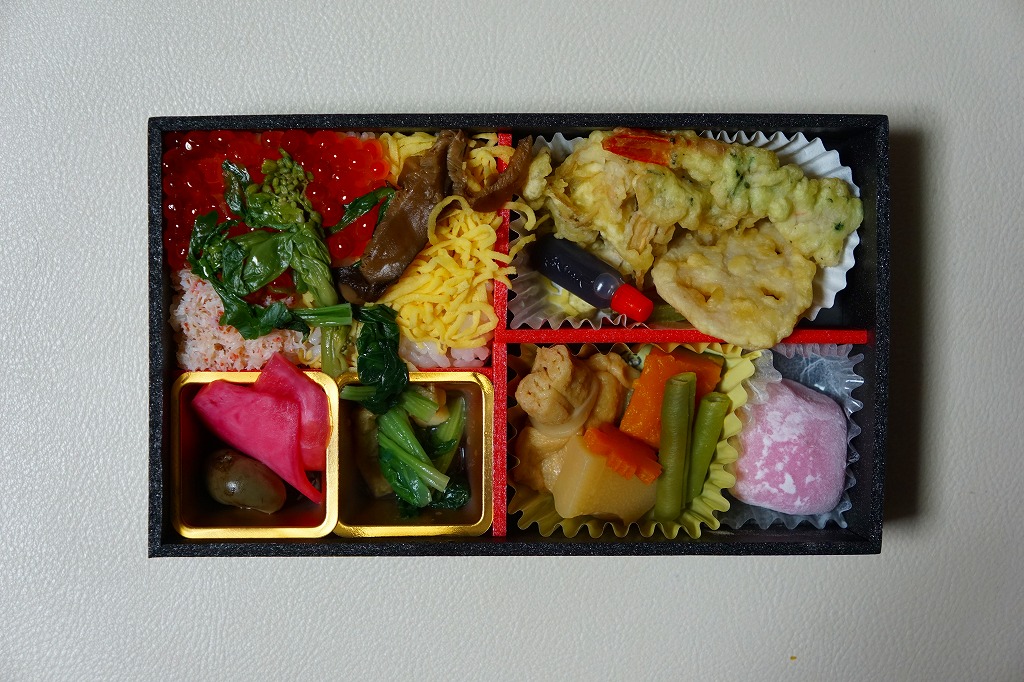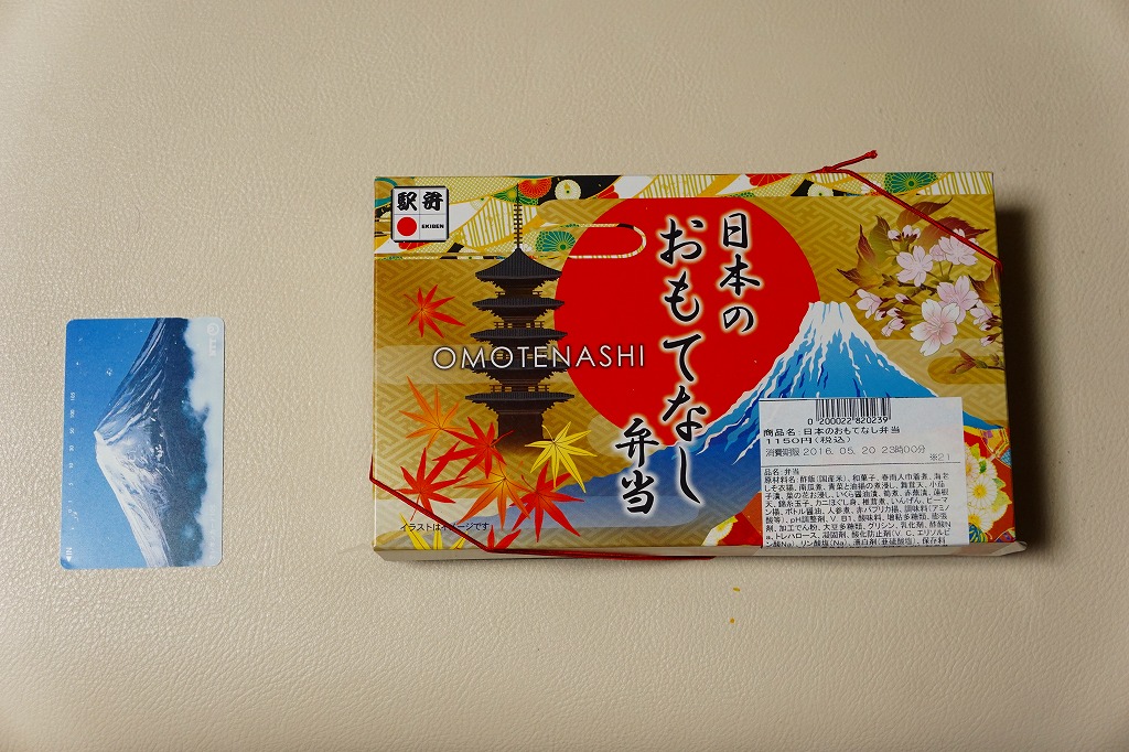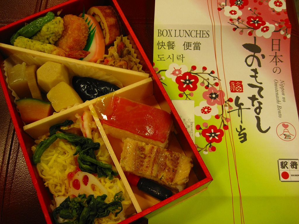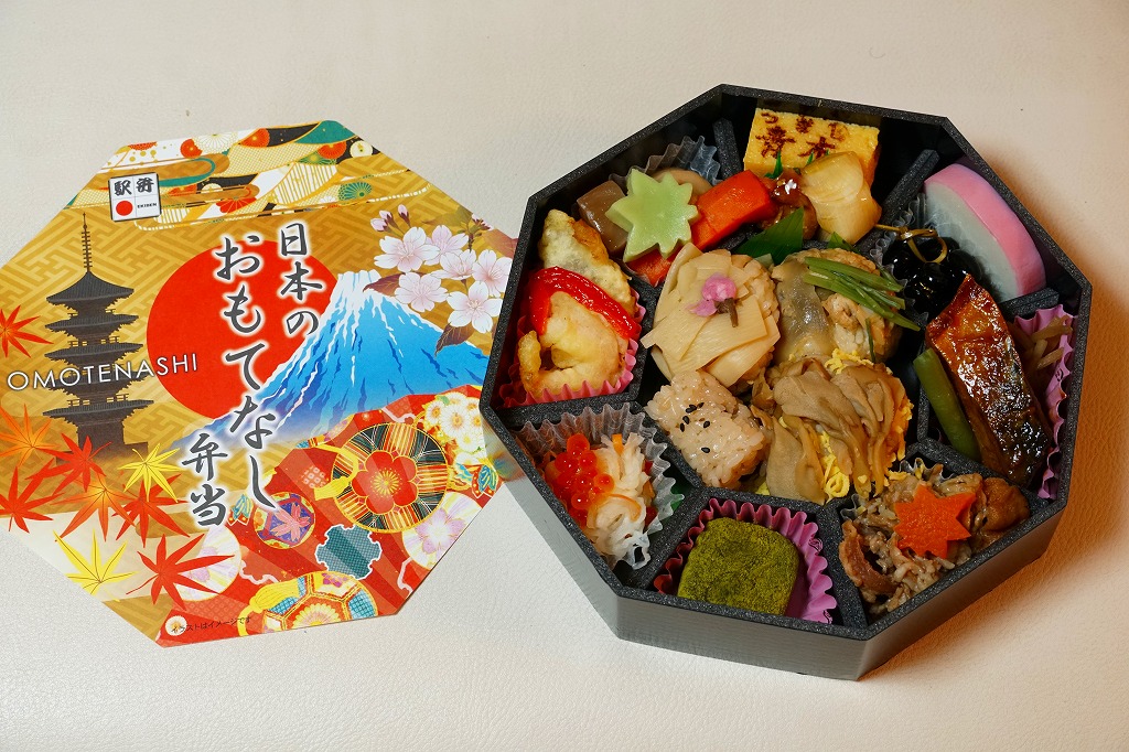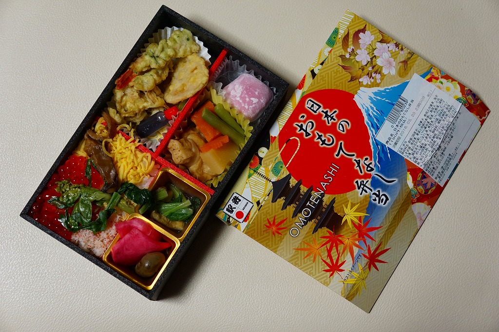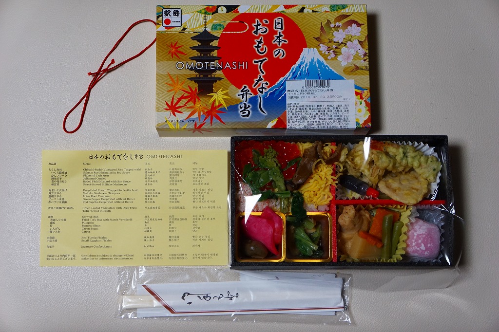 上記の駅弁「日本のおもてなし弁当」の、2016(平成28)年5月時点での姿。長方形の容器に、イクラとカニのちらし寿司、エビやマイタケやレンコンなどの天ぷら、タケノコやカボチャなどの煮物、菜の花おひたし、赤カブ漬と小ナス漬、大福などを詰めていた。おしながきが日英中韓の各国語で書かれたり、天ぷらや煮物など日本らしい食材で主に構成されているところに、日本と駅弁をパリに紹介した2016年のパリ駅弁とのコンセプトの類似を感じる。