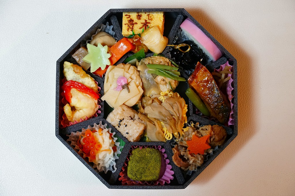 大きめな八角形の竹篭容器に帯をして封とする。御飯の部は国産有機米の俵飯が斜めに5個もたれかかり、紀州南高梅と富里大根の沢庵が添えられる。おかずの部は大きいカットでのゴボウ・レンコン・人参などの煮物、色鮮やかなアラスカ産キングサーモン、笹の葉にくるまれた彩香鶏、そしてポークの手造りコロッケ。